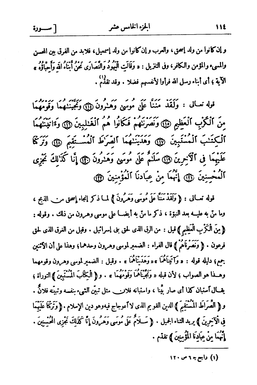 وَلَقَدْ مَنَنَّا عَلى مُوسى وَهارُونَ (١١٤) وَنَجَّيْناهُما وَقَوْمَهُما مِنَ الْكَرْبِ الْعَظِيمِ (١١٥) وَنَصَرْناهُمْ فَكانُوا هُمُ الْغالِبِينَ (١١٦) وَآتَيْناهُمَا الْكِتابَ الْمُسْتَبِينَ (١١٧) وَهَدَيْناهُمَا الصِّراطَ الْمُسْتَقِيمَ (١١٨)