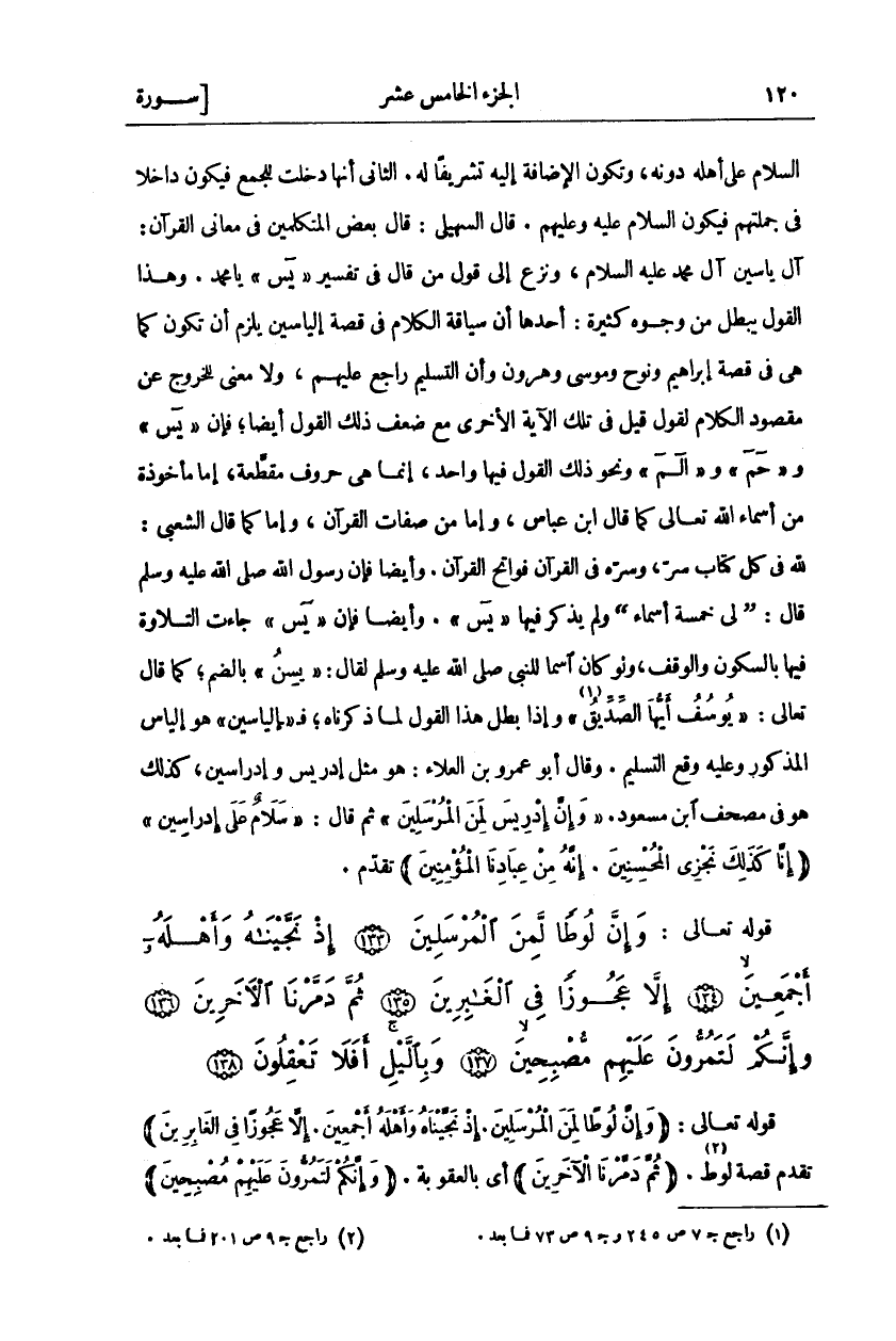 السَّلَامُ عَلَى أَهْلِهِ دُونَهُ، وَتَكُونُ الْإِضَافَةُ إِلَيْهِ تَشْرِيفًا لَهُ. الثَّانِي: أَنَّهَا دَخَلَتْ لِلْجَمْعِ فَيَكُونُ دَاخِلًا فِي جُمْلَتِهِمْ فَيَكُونُ السَّلَامُ عَلَيْهِ وَعَلَيْهِمْ. قَالَ السُّهَيْلِيُّ: قَالَ بَعْضُ الْمُتَكَلِّمِينَ فِي مَعَانِي الْقُرْآنِ آلُ يَاسِينَ آلُ مُحَمَّدٍ عَلَيْهِ السَّلَامُ، وَنَزَعَ إِلَى قَوْلِ مَنْ قَالَ فِي تَفْسِيرِ" يس" يَا مُحَمَّدُ. وَهَذَا الْقَوْلُ يَبْطُلُ مِنْ وُجُوهٍ كَثِيرَةٍ: أَحَدُهَا: أَنَّ سِيَاقَةَ الْكَلَامِ فِي قِصَّةِ إِلْيَاسِينَ يَلْزَمُ أَنْ تَكُونَ كَمَا هِيَ فِي قِصَّةِ إِبْرَاهِيمَ وَنُوحٍ وَمُوسَى وَهَارُونَ وَأَنَّ التَّسْلِيمَ رَاجِعٌ عَلَيْهِمْ، وَلَا مَعْنَى لِلْخُرُوجِ عَنْ مَقْصُودِ الْكَلَامِ لِقَوْلٍ قِيلَ فِي تِلْكَ الْآيَةِ الْأُخْرَى مَعَ ضَعْفِ ذَلِكَ الْقَوْلِ أَيْضًا، فَإِنَّ" يس" و" لَحْمَ" وَ" الم" وَنَحْوَ ذَلِكَ الْقَوْلُ فِيهَا وَاحِدٌ، إِنَّمَا هِيَ حُرُوفٌ مُقَطَّعَةٌ، إِمَّا مَأْخُوذَةٌ مِنْ أَسْمَاءِ اللَّهِ تَعَالَى كَمَا قَالَ ابْنُ عَبَّاسٍ، وَإِمَّا مِنْ صِفَاتِ الْقُرْآنِ، وَإِمَّا كَمَا قَالَ الشَّعْبِيُّ: لِلَّهِ فِي كُلِّ كِتَابٍ سِرٌّ، وَسِرُّهُ فِي الْقُرْآنِ فَوَاتِحُ الْقُرْآنِ. وَأَيْضًا فَإِنَّ رَسُولَ اللَّهِ صَلَّى اللَّهُ عَلَيْهِ وَسَلَّمَ قَالَ:" لِي خَمْسَةُ أَسْمَاءٍ" وَلَمْ يَذْكُرْ فِيهَا" يس". وَأَيْضًا فَإِنَّ" يس" جَاءَتِ التِّلَاوَةُ فِيهَا بِالسُّكُونِ وَالْوَقْفِ، ولو كان اسما للنبي صلى صَلَّى اللَّهُ عَلَيْهِ وَسَلَّمَ لقال:" يسن" بِالضَّمِّ، كَمَا قَالَ تَعَالَى:" يُوسُفُ أَيُّهَا الصِّدِّيقُ" [يوسف: ٤٦] وَإِذَا بَطَلَ هَذَا الْقَوْلُ لِمَا ذَكَرْنَاهُ، فَ" إِلْيَاسِينَ" هُوَ إِلْيَاسُ الْمَذْكُورُ وَعَلَيْهِ وَقَعَ التَّسْلِيمُ. وَقَالَ أَبُو عَمْرِو بْنُ الْعَلَاءِ: هُوَ مِثْلُ إِدْرِيسَ وَإِدْرَاسِينَ، كَذَلِكَ هُوَ فِي مُصْحَفِ ابْنِ مَسْعُودٍ." وَإِنَّ إِدْرِيسَ لَمِنَ الْمُرْسَلِينَ" ثُمَّ قَالَ:" سَلَامٌ عَلَى إِدْرَاسِينَ"." إِنَّا كَذلِكَ نَجْزِي الْمُحْسِنِينَ. إِنَّهُ مِنْ عِبادِنَا الْمُؤْمِنِينَ" تقدم «١».