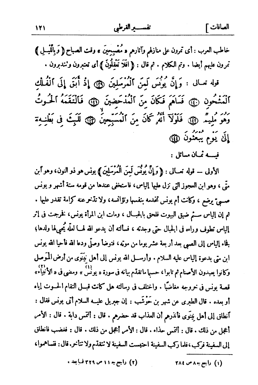 وَإِنَّ يُونُسَ لَمِنَ الْمُرْسَلِينَ (١٣٩) إِذْ أَبَقَ إِلَى الْفُلْكِ الْمَشْحُونِ (١٤٠) فَساهَمَ فَكانَ مِنَ الْمُدْحَضِينَ (١٤١) فَالْتَقَمَهُ الْحُوتُ وَهُوَ مُلِيمٌ (١٤٢) فَلَوْلا أَنَّهُ كانَ مِنَ الْمُسَبِّحِينَ (١٤٣)
