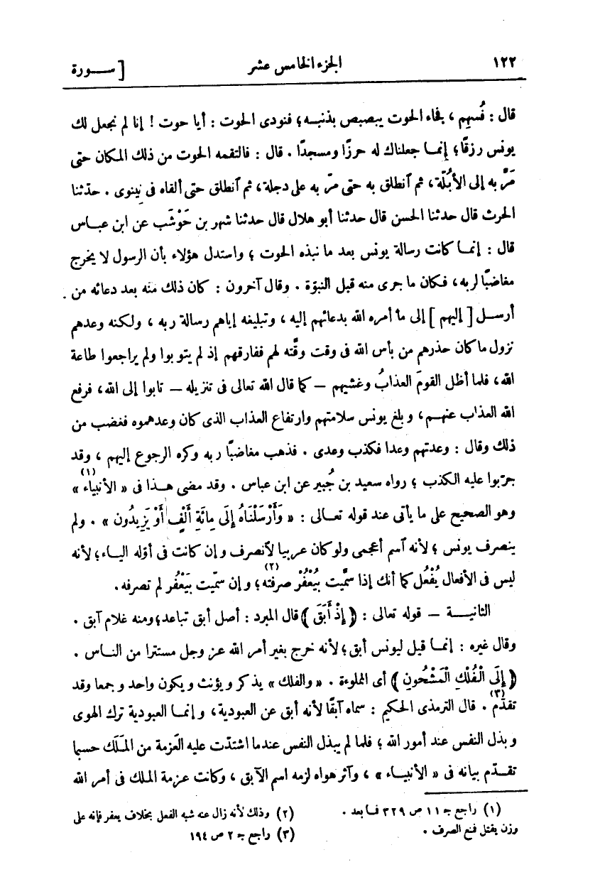 قَالَ: فَسُهِمَ، فَجَاءَ الْحُوتُ يُبَصْبِصُ بِذَنَبِهِ، فَنُودِيَ الْحُوتُ: أَيَا حُوتُ! إِنَّا لَمْ نَجْعَلْ لَكَ يُونُسَ رِزْقًا، إِنَّمَا جَعَلْنَاكَ لَهُ حِرْزًا وَمَسْجِدًا. قَالَ: فَالْتَقَمَهُ الْحُوتُ مِنْ ذَلِكَ الْمَكَانِ حَتَّى مَرَّ بِهِ إِلَى الْأُبُلَّةِ، ثُمَّ انْطَلَقَ بِهِ حَتَّى مَرَّ بِهِ عَلَى دِجْلَةَ، ثُمَّ انْطَلَقَ حتى ألقاه في نينوى. حدثنا الحرث قَالَ حَدَّثَنَا الْحَسَنُ قَالَ حَدَّثَنَا أَبُو هِلَالٍ قَالَ حَدَّثَنَا شَهْرُ بْنُ حَوْشَبٍ عَنِ ابْنِ عَبَّاسٍ قَالَ: إِنَّمَا كَانَتْ رِسَالَةُ يُونُسَ بَعْدَ مَا نَبَذَهُ الْحُوتُ، وَاسْتَدَلَّ هَؤُلَاءِ بِأَنَّ الرَّسُولَ لَا يَخْرُجُ مُغَاضِبًا لِرَبِّهِ، فَكَانَ مَا جَرَى مِنْهُ قَبْلَ النُّبُوَّةِ. وَقَالَ آخَرُونَ: كَانَ ذَلِكَ مِنْهُ بَعْدَ دُعَائِهِ مَنْ أُرْسِلَ إِلَيْهِمْ إِلَى مَا أَمَرَهُ اللَّهُ بِدُعَائِهِمْ إِلَيْهِ، وَتَبْلِيغِهِ إِيَّاهُمْ رِسَالَةَ رَبِّهِ، وَلَكِنَّهُ وَعَدَهُمْ نُزُولَ مَا كَانَ حَذَّرَهُمْ مِنْ بَأْسِ اللَّهِ فِي وَقْتٍ وَقَّتَهُ لَهُمْ فَفَارَقَهُمْ إِذْ لَمْ يَتُوبُوا وَلَمْ يُرَاجِعُوا طَاعَةَ اللَّهِ، فَلَمَّا أَظَلَّ الْقَوْمَ الْعَذَابُ وَغَشِيَهُمْ- كما قال الله تعالى في تنزيله- تُوبُوا إِلَى اللَّهِ، فَرَفَعَ اللَّهُ الْعَذَابَ عَنْهُمْ، وَبَلَغَ يُونُسَ سَلَامَتُهُمْ وَارْتِفَاعُ الْعَذَابِ الَّذِي كَانَ وَعَدَهُمُوهُ فَغَضِبَ مِنْ ذَلِكَ وَقَالَ: وَعَدْتُهُمْ وَعْدًا فَكَذَبَ وَعْدِي. فَذَهَبَ مُغَاضِبًا رَبَّهُ وَكَرِهَ الرُّجُوعَ إِلَيْهِمْ، وقد جربوا عليه الكذب، روا سَعِيدُ بْنُ جُبَيْرٍ عَنِ ابْنِ عَبَّاسٍ. وَقَدْ مَضَى هَذَا فِي" الْأَنْبِيَاءِ" وَهُوَ الصَّحِيحُ عَلَى ما يأتي عند قول تَعَالَى:" وَأَرْسَلْناهُ إِلى مِائَةِ أَلْفٍ أَوْ يَزِيدُونَ" [الصافات: ١٤٧]. ولم ينصف يُونُسُ، لِأَنَّهُ اسْمٌ أَعْجَمِيٌّ وَلَوْ كَانَ عَرَبِيًّا لانصرف وإن كانت في أول الْيَاءُ، لِأَنَّهُ لَيْسَ فِي الْأَفْعَالِ يُفْعُلُ كَمَا أَنَّكَ إِذَا سَمَّيْتَ بِيُعْفُرٍ صَرَفْتَهُ «١»، وَإِنْ سَمَّيْتَ بِيَعْفُرَ لَمْ تَصْرِفْهُ. الثَّانِيَةُ- قَوْلُهُ تَعَالَى:" إِذْ أَبَقَ"