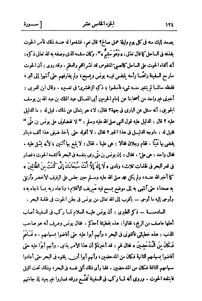 يَصْعَدُ إِلَيْكَ مِنْهُ فِي كُلِّ يَوْمٍ وَلَيْلَةٍ عَمَلٌ صَالِحٌ؟ قَالَ نَعَمْ. فَشَفَعُوا لَهُ عِنْدَ ذَلِكَ فَأَمَرَ الْحُوتَ بِقَذْفِهِ فِي السَّاحِلِ كَمَا قَالَ تَعَالَى:" وَهُوَ سَقِيمٌ". وَكَانَ سَقَمُهُ الَّذِي وَصَفَهُ بِهِ اللَّهُ- تَعَالَى ذِكْرُهُ أَنَّهُ أَلْقَاهُ الْحُوتُ عَلَى السَّاحِلِ كَالصَّبِيِّ الْمَنْفُوسِ قَدْ نُشِرَ اللَّحْمُ وَالْعَظْمُ. وَقَدْ رُوِيَ: أَنَّ الْحُوتَ سَارَ مَعَ السَّفِينَةِ رَافِعًا رَأْسَهُ يَتَنَفَّسُ فِيهِ يُونُسُ وَيُسَبِّحُ، وَلَمْ يُفَارِقْهُمْ حَتَّى انْتَهَوْا إِلَى الْبَرِّ، فلفظه سالما لم يغير منه شي فَأَسْلَمُوا، ذَكَرَهُ الزَّمَخْشَرِيُّ فِي تَفْسِيرِهِ. وَقَالَ ابْنُ الْعَرَبِيِّ: أَخْبَرَنِي غَيْرُ وَاحِدٍ مِنْ أَصْحَابِنَا عَنْ إِمَامِ الْحَرَمَيْنِ أَبِي الْمَعَالِي عَبْدِ الْمَلِكِ بْنِ عَبْدِ اللَّهِ بْنِ يُوسُفَ الْجُوَيْنِيِّ: أَنَّهُ سُئِلَ عَنِ الْبَارِي فِي جِهَةٍ؟ فَقَالَ: لَا، هُوَ يَتَعَالَى عَنْ ذَلِكَ. قِيلَ لَهُ: مَا الدَّلِيلُ عَلَيْهِ؟ قَالَ: الدَّلِيلُ عَلَيْهِ قَوْلِ النَّبِيِّ صَلَّى اللَّهُ عَلَيْهِ وَسَلَّمَ:" لَا تُفَضِّلُونِي عَلَى يُونُسَ بْنِ مَتَّى" فَقِيلَ لَهُ: مَا وَجْهُ الدَّلِيلِ فِي هَذَا الْخَبَرِ؟ فَقَالَ: لَا أَقُولُهُ حَتَّى يَأْخُذَ ضَيْفِي هَذَا أَلْفَ دِينَارٍ يَقْضِي بِهَا دَيْنًا. فَقَامَ رَجُلَانِ فَقَالَا: هِيَ عَلَيْنَا. فَقَالَ لَا يَتْبَعُ بِهَا اثْنَيْنِ، لِأَنَّهُ يَشُقُّ عَلَيْهِ. فَقَالَ وَاحِدٌ: هِيَ عَلَيَّ. فَقَالَ: إِنَّ يُونُسَ بْنَ مَتَّى رَمَى بِنَفْسِهِ فِي الْبَحْرِ فَالْتَقَمَهُ الْحُوتُ، فَصَارَ فِي قَعْرِ الْبَحْرِ فِي ظُلُمَاتٍ ثَلَاثٍ، وَنَادَى" لَا إِلهَ إِلَّا أَنْتَ سُبْحانَكَ إِنِّي كُنْتُ مِنَ الظَّالِمِينَ" [الأنبياء: ٨٧] كَمَا أَخْبَرَ اللَّهُ عَنْهُ، وَلَمْ يَكُنْ مُحَمَّدٌ صَلَّى اللَّهُ عَلَيْهِ وَسَلَّمَ حِينَ جَلَسَ عَلَى الرَّفْرَفِ الْأَخْضَرِ وَارْتَقَى بِهِ صُعُدًا، حَتَّى انْتَهَى بِهِ إِلَى مَوْضِعٍ يَسْمَعُ فِيهِ صَرِيفَ الْأَقْلَامِ، ومنا جاه رَبُّهُ بِمَا نَاجَاهُ بِهِ، وَأَوْحَى إِلَيْهِ مَا أَوْحَى بِأَقْرَبَ إِلَى اللَّهِ تَعَالَى مِنْ يُونُسَ فِي. بَطْنِ الْحُوتِ فِي ظُلْمَةِ الْبَحْرِ. السَّادِسَةُ- ذَكَرَ الطَّبَرِيُّ: أَنَّ يُونُسَ عَلَيْهِ السَّلَامُ لَمَّا رَكِبَ فِي السَّفِينَةِ أَصَابَ أَهْلَهَا عَاصِفٌ مِنَ الرِّيحِ، فَقَالُوا: هَذِهِ بِخَطِيئَةِ أَحَدِكُمْ. فَقَالَ يُونُسُ وَعَرَفَ أَنَّهُ هُوَ صَاحِبُ الذَّنْبِ: هَذِهِ خَطِيئَتِي فَأَلْقُونِي فِي الْبَحْرِ، وَأَنَّهُمْ أَبَوْا عَلَيْهِ حَتَّى أَفَاضُوا بِسِهَامِهِمْ" فَساهَمَ فَكانَ مِنَ الْمُدْحَضِينَ"