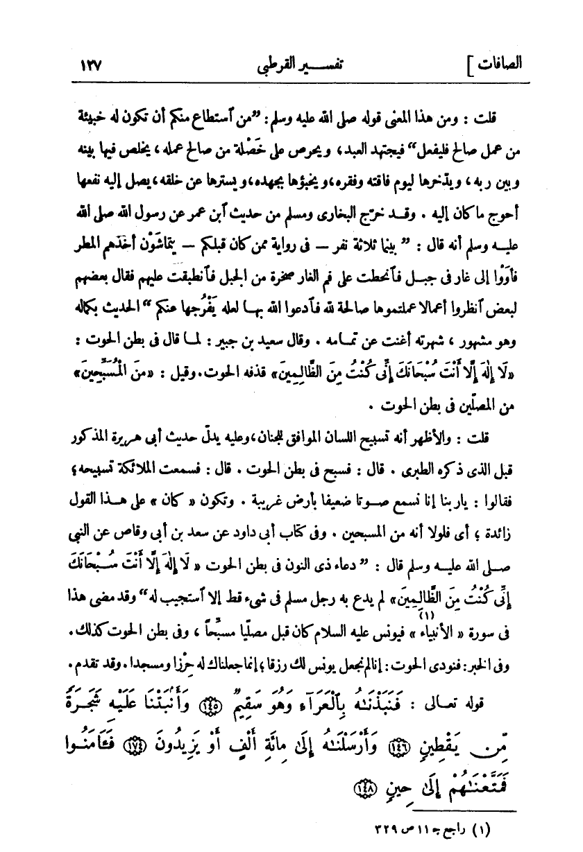قُلْتُ: وَمِنْ هَذَا الْمَعْنَى قَوْلُهُ صَلَّى اللَّهُ عَلَيْهِ وَسَلَّمَ" مَنِ اسْتَطَاعَ مِنْكُمْ أَنْ تَكُونَ لَهُ خَبِيئَةٌ مِنْ عَمَلٍ صَالِحٍ فَلْيَفْعَلْ" فَيَجْتَهِدُ العبر، وَيَحْرِصُ عَلَى خَصْلَةٍ مِنْ صَالِحِ عَمَلِهِ، يُخْلِصُ فِيهَا بَيْنَهُ وَبَيْنَ رَبِّهِ، وَيَدَّخِرُهَا لِيَوْمِ فَاقَتِهِ وفقره، ويخبؤها بِجَهْدِهِ، وَيَسْتُرُهَا عَنْ خَلْقِهِ، يَصِلُ إِلَيْهِ نَفْعُهَا أَحْوَجَ مَا كَانَ إِلَيْهِ. وَقَدْ خَرَّجَ الْبُخَارِيُّ وسلم مِنْ حَدِيثِ ابْنُ عُمَرَ عَنْ رَسُولِ اللَّهِ صَلَّى اللَّهُ عَلَيْهِ وَسَلَّمَ أَنَّهُ قَالَ:" بَيْنَمَا ثَلَاثَةُ نَفَرٍ- فِي رِوَايَةٍ مِمَّنْ كَانَ قَبْلَكُمْ- يَتَمَاشَوْنَ أَخَذَهُمُ الْمَطَرُ فَأَوَوْا إِلَى غَارٍ فِي جَبَلٍ فَانْحَطَّتْ عَلَى فَمِ الْغَارِ صَخْرَةٌ مِنَ الْجَبَلِ فَانْطَبَقَتْ عَلَيْهِمْ فَقَالَ بَعْضُهُمْ لِبَعْضٍ انْظُرُوا أعمالا عملتموها صالحه لله بِهَا لَعَلَّهُ يُفَرِّجُهَا عَنْكُمْ" الْحَدِيثَ بِكَمَالِهِ وَهُوَ مَشْهُورٌ، شُهْرَتُهُ أَغْنَتْ عَنْ تَمَامِهِ. وَقَالَ سَعِيدُ بْنُ جُبَيْرٍ: لَمَّا قَالَ فِي بَطْنِ الْحُوتِ" لَا إِلهَ إِلَّا أَنْتَ سُبْحانَكَ إِنِّي كُنْتُ مِنَ الظَّالِمِينَ" قَذَفَهُ الْحُوتُ. وَقِيلَ:" مِنَ الْمُسَبِّحِينَ" مِنَ الْمُصَلِّينَ فِي بَطْنِ الْحُوتِ. قُلْتُ: وَالْأَظْهَرُ أَنَّهُ تَسْبِيحُ اللِّسَانِ الْمُوَافِقُ لِلْجَنَانِ، وَعَلَيْهِ يَدُلُّ حَدِيثُ أَبِي هُرَيْرَةَ الْمَذْكُورُ قَبْلَ الَّذِي ذَكَرَهُ الطَّبَرِيُّ. قَالَ: فَسَبَّحَ فِي بَطْنِ الْحُوتِ. قَالَ: فَسَمِعَتِ الْمَلَائِكَةُ تَسْبِيحَهُ، فَقَالُوا: يَا رَبَّنَا إِنَّا نسمع صوتا ضفيفا بِأَرْضٍ غَرِيبَةٍ. وَتَكُونُ" كانَ" عَلَى هَذَا الْقَوْلِ زَائِدَةً. أَيْ فَلَوْلَا أَنَّهُ مِنَ الْمُسَبِّحِينَ. وَفِي كِتَابِ أَبِي دَاوُدَ عَنْ سَعْدِ بْنِ أَبِي وَقَّاصٍ عَنِ النَّبِيِّ صَلَّى اللَّهُ عَلَيْهِ وَسَلَّمَ قَالَ:" دعاه ذِي النُّونِ فِي بَطْنِ الْحُوتِ" لَا إِلهَ إِلَّا أَنْتَ سُبْحانَكَ إِنِّي كُنْتُ مِنَ الظَّالِمِينَ" لم يدع به رجل مسلم في شي قط الا استجب لَهُ" وَقَدْ مَضَى هَذَا فِي سُورَةِ" الْأَنْبِيَاءِ" «١» فَيُونُسُ عَلَيْهِ السَّلَامُ كَانَ قَبْلُ مُصَلِّيًا مُسَبِّحًا، وَفِي بَطْنِ الْحُوتِ كَذَلِكَ. وَفِي الْخَبَرِ: فَنُودِيَ الْحُوتُ، إِنَّا لَمْ نَجْعَلْ يُونُسَ لَكَ رِزْقًا، إِنَّمَا جَعَلْنَاكَ لَهُ حِرْزًا وَمَسْجِدًا. وَقَدْ تَقَدَّمَ.