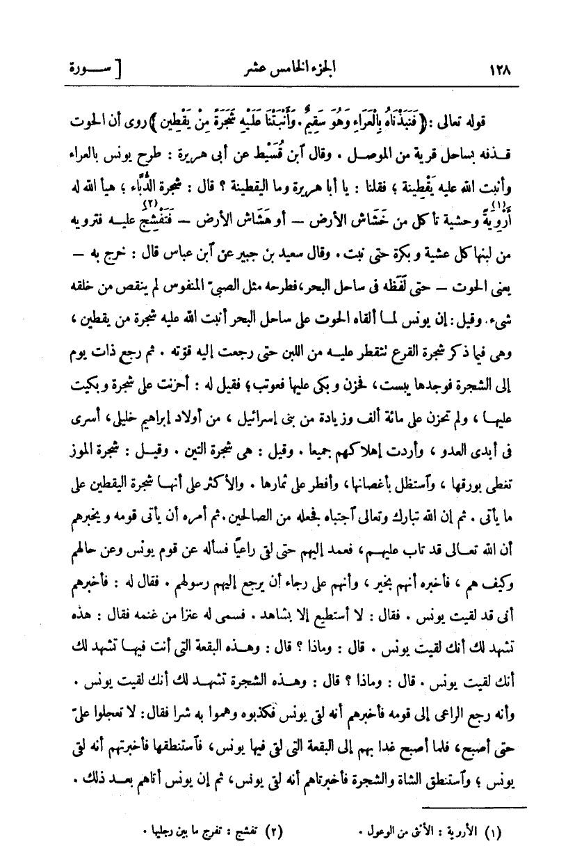 قَوْلُهُ تَعَالَى:" فَنَبَذْناهُ بِالْعَراءِ وَهُوَ سَقِيمٌ- وَأَنْبَتْنا عَلَيْهِ شَجَرَةً مِنْ يَقْطِينٍ" رُوِيَ أَنَّ الْحُوتَ قَذَفَهُ بِسَاحِلِ قَرْيَةٍ مِنَ الْمَوْصِلِ. وَقَالَ ابْنُ قُسَيْطٍ عَنْ أَبِي هُرَيْرَةَ: طُرِحَ يُونُسُ بِالْعَرَاءِ وأنبت الله عليه بقطينه، فَقُلْنَا يَا أَبَا هُرَيْرَةَ: وَمَا الْيَقْطِينَةُ؟ قَالَ: شَجَرَةُ الدُّبَّاءِ هَيَّأَ اللَّهُ لَهُ أُرْوِيَّةً «١» وَحْشِيَّةً تَأْكُلُ مِنْ خَشَاشِ الْأَرْضِ- أَوْ هَشَاشِ الْأَرْضِ- فَتَفْشِجُ «٢» عَلَيْهِ فَتَرْوِيهِ مِنْ لَبَنِهَا كُلَّ عَشِيَّةٍ وَبُكْرَةٍ حَتَّى نَبَتَ. وَقَالَ سَعِيدُ بْنُ جُبَيْرٍ عَنِ ابْنِ عَبَّاسٍ قَالَ: خَرَجَ بِهِ يَعْنِي الْحُوتَ- حَتَّى لَفَظَهُ فِي سَاحِلِ الْبَحْرِ، فَطَرَحَهُ مِثْلَ الصَّبِيِّ الْمَنْفُوسِ لَمْ يَنْقُصْ مِنْ خَلْقِهِ شي. وَقِيلَ إِنَّ يُونُسَ لَمَّا أَلْقَاهُ الْحُوتُ عَلَى سَاحِلِ الْبَحْرِ أَنْبَتَ اللَّهُ عَلَيْهِ شَجَرَةً مِنْ يقطين، وهى فيها ذكر شجرة القرع نتقطر عَلَيْهِ مِنَ اللَّبَنِ حَتَّى رَجَعَتْ إِلَيْهِ قُوَّتُهُ. ثُمَّ رَجَعَ ذَاتَ يَوْمٍ إِلَى الشَّجَرَةِ فَوَجَدَهَا يَبِسَتْ، فَحَزِنَ وَبَكَى عَلَيْهَا فَعُوتِبَ، فَقِيلَ لَهُ: أَحَزِنْتَ عَلَى شَجَرَةٍ وَبَكَيْتَ عَلَيْهَا، وَلَمْ تَحْزَنْ عَلَى مِائَةِ أَلْفٍ وَزِيَادَةٍ مِنْ بَنِي إِسْرَائِيلَ، مِنْ أَوْلَادِ إِبْرَاهِيمَ خَلِيلِي، أَسْرَى فِي أَيْدِي الْعَدُوِّ، وَأَرَدْتَ إِهْلَاكَهُمْ جَمِيعًا. وَقِيلَ: هِيَ شَجَرَةُ التِّينِ. وَقِيلَ: شَجَرَةُ الْمَوْزِ تَغَطَّى بِوَرَقِهَا، وَاسْتَظَلَّ بِأَغْصَانِهَا، وَأَفْطَرَ عَلَى ثِمَارِهَا. وَالْأَكْثَرُ عَلَى أَنَّهَا شَجَرَةُ الْيَقْطِينِ عَلَى مَا يَأْتِي. ثُمَّ إِنَّ اللَّهَ تَبَارَكَ وَتَعَالَى اجْتَبَاهُ فَجَعَلَهُ مِنَ الصَّالِحِينَ. ثُمَّ أَمَرَهُ أَنْ يَأْتِيَ قَوْمَهُ وَيُخْبِرَهُمْ أَنَّ اللَّهَ تَعَالَى قَدْ تَابَ عَلَيْهِمْ، فَعَمَدَ إِلَيْهِمْ حَتَّى لَقِيَ رَاعِيًا فَسَأَلَهُ عَنْ قَوْمِ يُونُسَ وَعَنْ حَالِهِمْ وَكَيْفَ هُمْ، فَأَخْبَرَهُ أَنَّهُمْ بِخَيْرٍ، وَأَنَّهُمْ عَلَى رَجَاءٍ أَنْ يَرْجِعَ إِلَيْهِمْ رَسُولُهُمْ. فَقَالَ لَهُ: فَأَخْبِرْهُمْ أَنِّي قَدْ لَقِيتُ يُونُسَ. قَالَ: وَمَاذَا؟ قَالَ: وَهَذِهِ الْبُقْعَةُ الَّتِي أَنْتَ فِيهَا تَشْهَدُ لَكَ أَنَّكَ لَقِيتَ يُونُسَ، قَالَ: وَمَاذَا؟ قَالَ وَهَذِهِ الشَّجَرَةُ تَشْهَدُ لَكَ أَنَّكَ لَقِيتَ يُونُسَ. وَأَنَّهُ رَجَعَ الرَّاعِي إِلَى قَوْمِهِ فَأَخْبَرَهُمْ أَنَّهُ لَقِيَ يُونُسَ فَكَذَّبُوهُ وَهَمُّوا بِهِ شَرًّا فَقَالَ: لَا تَعْجَلُوا عَلَيَّ حَتَّى أُصْبِحَ، فَلَمَّا أَصْبَحَ غَدَا بِهِمْ إِلَى الْبُقْعَةِ الَّتِي لَقِيَ فِيهَا يُونُسَ، فَاسْتَنْطَقَهَا فَأَخْبَرَتْهُمْ أَنَّهُ لَقِيَ يونس، واستنطق الشاة والشجرة فأخبرناهم أَنَّهُ لَقِيَ يُونُسَ، ثُمَّ إِنَّ يُونُسَ أَتَاهُمْ بعد ذلك.