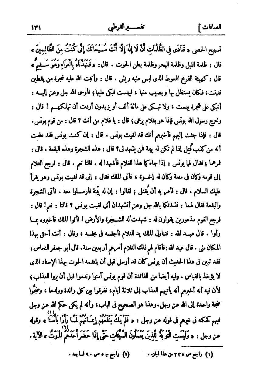 تَسْبِيحَ الْحَصَى" فَنادى فِي الظُّلُماتِ أَنْ لَا إِلهَ إِلَّا أَنْتَ سُبْحانَكَ إِنِّي كُنْتُ مِنَ الظَّالِمِينَ" [الأنبياء: ٨٧] قَالَ: ظُلْمَةُ اللَّيْلِ وَظُلْمَةُ الْبَحْرِ وَظُلْمَةُ بَطْنِ الْحُوتِ. قَالَ: فَنَبَذْنَاهُ بِالْعَرَاءِ وَهُوَ سَقِيمٌ" قَالَ: كَهَيْئَةِ الْفَرْخِ الْمَمْعُوطِ الَّذِي لَيْسَ عَلَيْهِ رِيشٌ. قَالَ: وَأَنْبَتَ اللَّهُ عَلَيْهِ شَجَرَةً مِنْ يَقْطِينٍ فَنَبَتَتْ، فَكَانَ يَسْتَظِلُّ بِهَا وَيُصِيبُ مِنْهَا، فَيَبِسَتْ فَبَكَى عَلَيْهَا، فَأَوْحَى اللَّهُ جَلَّ وَعَزَّ إِلَيْهِ: أَتَبْكِي عَلَى شَجَرَةٍ يَبِسَتْ، وَلَا تَبْكِي عَلَى مِائَةِ أَلْفٍ أَوْ يَزِيدُونَ أَرَدْتَ أَنْ تُهْلِكَهُمْ قَالَ: وَخَرَجَ رَسُولُ اللَّهِ يُونُسُ فَإِذَا هُوَ بِغُلَامٍ يَرْعَى، قَالَ: يَا غُلَامُ مَنْ أَنْتَ؟ قَالَ: مِنْ قَوْمِ يُونُسَ. قَالَ: فَإِذَا جِئْتَ إِلَيْهِمْ فَأَخْبِرْهُمْ أَنَّكَ قَدْ لَقِيتَ يُونُسَ. قَالَ: إِنْ كُنْتَ يُونُسَ فَقَدْ عَلِمْتُ أَنَّهُ مَنْ كَذَبَ قُتِلَ إِذَا لَمْ تَكُنْ لَهُ بَيِّنَةٌ فَمَنْ يَشْهَدُ لِي؟ قَالَ: هَذِهِ الشَّجَرَةُ وَهَذِهِ الْبُقْعَةُ. قَالَ: فَمُرْهُمَا، فَقَالَ لَهُمَا يُونُسُ: إِذَا جَاءَكُمَا هَذَا الْغُلَامُ فَاشْهَدَا لَهُ. قَالَتَا نَعَمْ. قَالَ: فَرَجَعَ الْغُلَامُ إِلَى قَوْمِهِ وَكَانَ فِي مَنَعَةٍ وَكَانَ لَهُ إِخْوَةٌ، فَأَتَى الْمَلِكَ فَقَالَ: إِنِّي قَدْ لَقِيتُ يُونُسَ وَهُوَ يَقْرَأُ عَلَيْكَ السَّلَامَ. قَالَ: فَأَمَرَ بِهِ أَنْ يُقْتَلَ، فَقَالُوا: إِنَّ لَهُ بَيِّنَةً فَأَرْسِلُوا مَعَهُ. فَأَتَى الشَّجَرَةَ وَالْبُقْعَةَ فَقَالَ لَهُمَا: نَشَدْتُكُمَا بِاللَّهِ جَلَّ وَعَزَّ أَتَشْهَدَانِ أَنِّي لَقِيتُ يُونُسَ؟ قَالَتَا: نَعَمْ! قَالَ: فَرَجَعَ الْقَوْمُ مَذْعُورِينَ يَقُولُونَ لَهُ: شَهِدَتْ لَهُ الشَّجَرَةُ وَالْأَرْضُ فَأَتَوُا الْمَلِكَ فَأَخْبَرُوهُ بِمَا رَأَوْا. قَالَ عَبْدُ اللَّهِ: فَتَنَاوَلَ الْمَلِكُ يَدَ الْغُلَامِ فَأَجْلَسَهُ فِي مَجْلِسِهِ، وَقَالَ: أَنْتَ أَحَقُّ بِهَذَا الْمَكَانِ مِنِّي. قَالَ عَبْدُ اللَّهِ: فَأَقَامَ لَهُمْ ذَلِكَ الْغُلَامُ أَمْرَهُمْ أَرْبَعِينَ سَنَةً. قَالَ أَبُو جَعْفَرٍ النَّحَّاسُ: فَقَدْ تَبَيَّنَ فِي هَذَا الْحَدِيثِ أَنَّ يُونُسَ كَانَ قَدْ أُرْسِلَ قَبْلَ أَنْ يلقمه الحو ت بِهَذَا الْإِسْنَادِ الَّذِي لَا يُؤْخَذُ بِالْقِيَاسِ. وَفِيهِ أَيْضًا مِنَ الْفَائِدَةِ أَنَّ قَوْمَ يُونُسَ آمَنُوا اوندموا قَبْلَ أَنْ يَرَوُا الْعَذَابَ، لِأَنَّ فِيهِ أَنَّهُ أَخْبَرَهُمْ أَنَّهُ يَأْتِيهِمُ الْعَذَابُ إِلَى ثَلَاثَةِ أَيَّامٍ، فَفَرَّقُوا بَيْنَ كُلِّ وَالِدَةٍ وَوَلَدِهَا، وَضَجُّوا ضَجَّةً وَاحِدَةً إِلَى اللَّهِ عَزَّ وَجَلَّ. وَهَذَا هُوَ الصَّحِيحُ فِي الْبَابِ، وَأَنَّهُ لَمْ يَكُنْ حُكْمُ اللَّهِ عَزَّ وَجَلَّ فِيهِمْ كَحُكْمِهِ فِي غَيْرِهِمْ في قول عَزَّ وَجَلَّ:" فَلَمْ يَكُ يَنْفَعُهُمْ إِيمانُهُمْ لَمَّا رَأَوْا بَأْسَنا" [غافر: ٨٥] وَقَوْلِهِ عَزَّ وَجَلَّ:" وَلَيْسَتِ التَّوْبَةُ لِلَّذِينَ يَعْمَلُونَ السَّيِّئاتِ حَتَّى إِذا حَضَرَ أَحَدَهُمُ الْمَوْتُ" [النساء