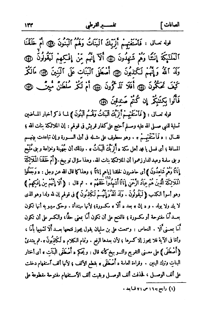 قَوْلُهُ تَعَالَى:" فَاسْتَفْتِهِمْ أَلِرَبِّكَ الْبَناتُ وَلَهُمُ الْبَنُونَ" لَمَّا ذَكَرَ أَخْبَارَ الْمَاضِينَ تَسْلِيَةً لِلنَّبِيِّ صَلَّى اللَّهُ عَلَيْهِ وَسَلَّمَ احْتَجَّ عَلَى كُفَّارِ قُرَيْشٍ فِي قَوْلِهِمْ: إِنَّ الْمَلَائِكَةَ بَنَاتُ اللَّهِ، فَقَالَ:" فَاسْتَفْتِهِمْ". وَهُوَ مَعْطُوفٌ عَلَى مِثْلِهِ فِي أَوَّلِ السُّورَةِ وَإِنْ تَبَاعَدَتْ بَيْنَهُمُ الْمَسَافَةُ، أَيْ فَسَلْ يَا مُحَمَّدُ أَهْلَ مَكَّةَ" أَلِرَبِّكَ الْبَناتُ" وَذَلِكَ أَنَّ جُهَيْنَةَ وَخُزَاعَةَ وَبَنِي مَلِيحٍ وَبَنِي سَلِمَةَ وَعَبْدَ الدَّارِ زَعَمُوا أَنَّ الْمَلَائِكَةَ بَنَاتُ اللَّهِ. وَهَذَا سُؤَالُ تَوْبِيخٍ." أَمْ خَلَقْنَا الْمَلائِكَةَ إِناثاً وَهُمْ شاهِدُونَ" أَيْ حَاضِرُونَ لِخَلْقِنَا إِيَّاهُمْ إِنَاثًا، وَهَذَا كَمَا قَالَ اللَّهُ عَزَّ وَجَلَّ:" وَجَعَلُوا الْمَلائِكَةَ الَّذِينَ هُمْ عِبادُ الرَّحْمنِ إِناثاً أَشَهِدُوا خَلْقَهُمْ" [الزخرف: ١٩]. ثُمَّ قَالَ" أَلا إِنَّهُمْ مِنْ إِفْكِهِمْ" وَهُوَ أَسْوَأُ الْكَذِبِ" لَيَقُولُونَ. وَلَدَ اللَّهُ وَإِنَّهُمْ لَكاذِبُونَ" فِي قَوْلِهِمْ إِنَّ لِلَّهِ وَلَدًا وَهُوَ الَّذِي لَا يَلِدُ وَلَا يُولَدُ. وَ" إِنَّ" بَعْدَ" أَلَا" مَكْسُورَةٌ، لِأَنَّهَا مُبْتَدَأَةٌ. وَحَكَى سِيبَوَيْهِ أَنَّهَا تكون بعد أما مفتوح أَوْ مَكْسُورَةً، فَالْفَتْحُ عَلَى أَنْ تَكُونَ أَمَا بِمَعْنَى أَلَا. النَّحَّاسُ: وَسَمِعْتُ عَلِيَّ بْنَ سُلَيْمَانَ يَقُولُ يَجُوزُ فَتْحُهَا بَعْدَ أَلَا تَشْبِيهًا بِأَمَا، وَأَمَّا فِي الْآيَةِ فَلَا يَجُوزُ إِلَّا كَسْرُهَا، لأن بعدها الرفع. وتمام الكلام" كاذبون". ثم يبتدى" أَصْطَفَى" عَلَى مَعْنَى التَّقْرِيعِ وَالتَّوْبِيخِ كَأَنَّهُ قَالَ: وَيْحَكُمْ" أَصْطَفَى الْبَناتِ" أَيِ اخْتَارَ الْبَنَاتِ وَتَرَكَ الْبَنِينَ. وَقِرَاءَةُ الْعَامَّةِ" أَصْطَفَى" بِقَطْعِ الْأَلِفِ، لِأَنَّهَا أَلِفُ اسْتِفْهَامٍ دَخَلَتْ
