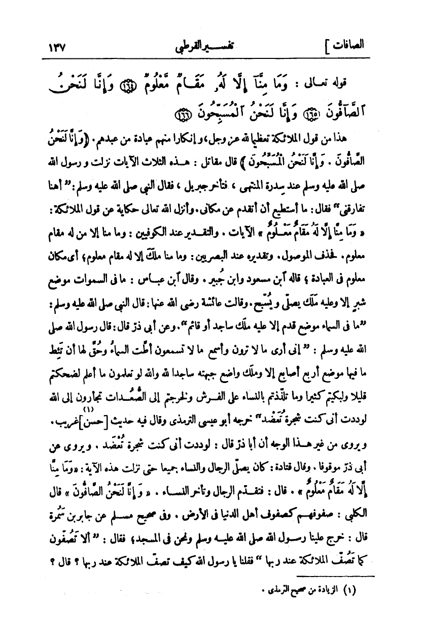 هَذَا مِنْ قَوْلِ الْمَلَائِكَةِ تَعْظِيمًا لِلَّهِ عَزَّ وَجَلَّ، وَإِنْكَارًا مِنْهُمْ عِبَادَةَ مَنْ عَبَدَهُمْ." وَإِنَّا لَنَحْنُ الصَّافُّونَ. وَإِنَّا لَنَحْنُ الْمُسَبِّحُونَ" قَالَ مُقَاتِلٌ: هَذِهِ الثَّلَاثُ الْآيَاتِ نَزَلَتْ وَرَسُولُ اللَّهِ صَلَّى اللَّهُ عَلَيْهِ وَسَلَّمَ عِنْدَ سِدْرَةِ الْمُنْتَهَى، فَتَأَخَّرَ جِبْرِيلُ، فَقَالَ النَّبِيُّ صَلَّى اللَّهُ عَلَيْهِ وَسَلَّمَ:" أَهُنَا تُفَارِقُنِي" فَقَالَ مَا أَسْتَطِيعُ أَنْ أَتَقَدَّمَ عَنْ مَكَانِي. وَأَنْزَلَ اللَّهُ تَعَالَى حِكَايَةً عَنْ قَوْلِ الْمَلَائِكَةِ:" وَمَا مِنَّا إِلَّا لَهُ مَقَامٌ مَعْلُومٌ" الْآيَاتِ. وَالتَّقْدِيرُ عِنْدَ الْكُوفِيِّينَ: وَمَا مِنَّا إِلَّا مَنْ لَهُ مَقَامٌ مَعْلُومٌ. فَحُذِفَ الْمَوْصُولُ. وَتَقْدِيرُهُ عِنْدَ الْبَصْرِيِّينَ: وَمَا مِنَّا مَلَكٌ إِلَّا لَهُ مَقَامٌ مَعْلُومٌ، أَيْ مَكَانٌ مَعْلُومٌ فِي الْعِبَادَةِ، قال ابْنُ مَسْعُودٍ وَابْنُ جُبَيْرٍ. وَقَالَ ابْنُ عَبَّاسٍ: ما في السموات موضع شبر إلا وعليه ملك يصلي سبح. وَقَالَتْ عَائِشَةُ رَضِيَ اللَّهُ عَنْهَا: قَالَ النَّبِيُّ صَلَّى اللَّهُ عَلَيْهِ وَسَلَّمَ:" مَا فِي السَّمَاءِ مَوْضِعُ قَدَمٍ إِلَّا عَلَيْهِ مَلَكٌ سَاجِدٌ أَوْ قَائِمٌ". وَعَنْ أَبِي ذَرٍّ قَالَ: قَالَ رَسُولُ اللَّهِ صَلَّى اللَّهُ عَلَيْهِ وَسَلَّمَ:" إِنِّي أَرَى مَا لَا تَرَوْنَ وَأَسْمَعُ مَا لَا تَسْمَعُونَ أَطَّتِ السَّمَاءُ وَحُقَّ لَهَا أَنْ تَئِطَّ مَا فِيهَا مَوْضِعُ أَرْبَعِ أَصَابِعَ إِلَّا وَمَلَكٌ وَاضِعٌ جَبْهَتَهُ سَاجِدًا لِلَّهِ وَاللَّهِ لَوْ تَعْلَمُونَ مَا أَعْلَمُ لَضَحِكْتُمْ قَلِيلًا وَلَبَكَيْتُمْ كَثِيرًا وَمَا تَلَذَّذْتُمْ بِالنِّسَاءِ عَلَى الْفُرُشِ وَلَخَرَجْتُمْ إِلَى الصُّعُدَاتِ تَجْأَرُونَ إِلَى اللَّهِ لَوَدِدْتُ أَنِّي كُنْتُ شَجَرَةً تُعْضَدُ" خَرَّجَهُ أَبُو عِيسَى التِّرْمِذِيُّ وَقَالَ فِيهِ حَدِيثٌ" حَسَنٌ" «١» غَرِيبٌ. وَيُرْوَى مِنْ غَيْرِ هَذَا الْوَجْهِ أَنَّ أَبَا ذَرٍّ قَالَ: لَوَدِدْتُ أَنِّي كُنْتُ شَجَرَةً تُعْضَدُ. وَيُرْوَى عَنْ أَبِي ذَرٍّ مَوْقُوفًا. وَقَالَ قَتَادَةُ: كَانَ يُصَلِّي الرِّجَالُ وَالنِّسَاءُ جَمِيعًا حَتَّى نَزَلَتْ هَذِهِ الْآيَةُ:" وَمَا مِنَّا إِلَّا لَهُ مَقَامٌ مَعْلُومٌ". قَالَ: فَتَقَدَّمَ الرِّجَالُ وَتَأَخَّرَ النِّسَاءُ." وَإِنَّا لَنَحْنُ الصَّافُّونَ" قَالَ الْكَلْبِيُّ: صُفُوفُهُمْ كَصُفُوفِ أَهْلِ الدُّنْيَا فِي الْأَرْضِ. وَفِي صَحِيحِ مُسْلِمٍ عَنْ جَابِرِ بْنِ سَمُرَةَ قَالَ: خَرَجَ عَلَيْنَا رَسُولُ اللَّهِ صَلَّى اللَّهُ عَلَيْهِ وَسَلَّمَ وَنَحْنُ فِي الْمَسْجِدِ، فَقَالَ:" أَلَا تَصُفُّونَ كَمَا تَصُفُّ الْمَلَائِكَةُ عِنْدَ رَبِّهَا" فَقُلْنَا يَا رَسُولَ اللَّهِ كَيْفَ تَصُفُّ الْمَلَائِكَةُ عِنْدَ رَبِّهَا؟ قَالَ؟