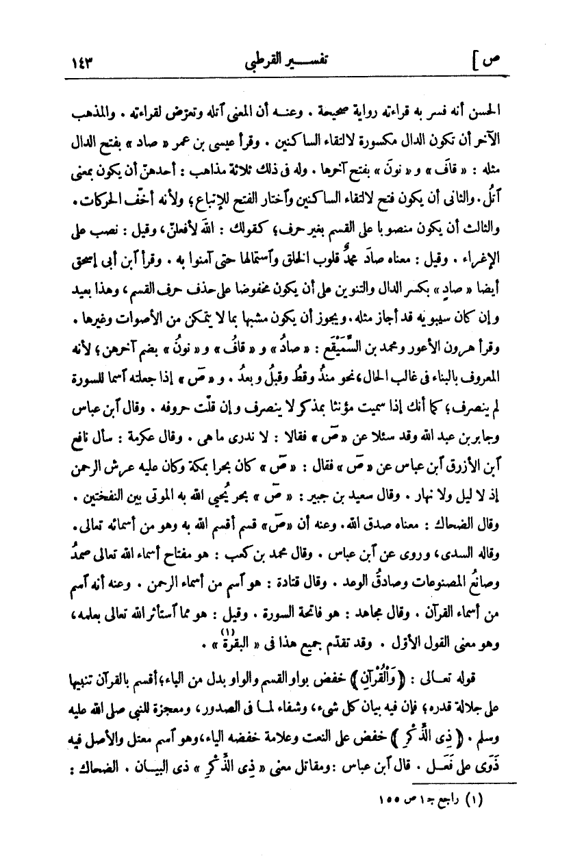 الْآخَرُ أَنْ تَكُونَ الدَّالُ مَكْسُورَةً لِالْتِقَاءِ السَّاكِنَيْنِ. وَقَرَأَ عِيسَى بْنُ عُمَرَ" صَادَ" بِفَتْحِ الدَّالِ مِثْلَهُ:" قَافَ" وَ" نُونَ" بِفَتْحِ آخِرهَا. وَلَهُ فِي ذَلِكَ ثَلَاثَةُ مَذَاهِبَ: أَحَدُهُنَّ أَنْ يَكُونَ بِمَعْنَى اتْلُ. وَالثَّانِي أَنْ يَكُونَ فُتِحَ لِالْتِقَاءِ السَّاكِنَيْنِ وَاخْتَارَ الْفَتْحَ لِلْإِتْبَاعِ، وَلِأَنَّهُ أَخَفُّ الْحَرَكَاتِ. وَالثَّالِثُ أَنْ يَكُونَ مَنْصُوبًا عَلَى الْقَسَمِ بِغَيْرِ حَرْفٍ، كَقَوْلِكَ: اللَّهَ لَأَفْعَلَنَّ، وَقِيلَ: نُصِبَ عَلَى الْإِغْرَاءِ. وَقِيلَ: مَعْنَاهُ صَادَ مُحَمَّدٌ قُلُوبَ الْخَلْقِ وَاسْتَمَالَهَا حَتَّى آمَنُوا بِهِ. وَقَرَأَ ابْنُ أَبِي إِسْحَاقَ أَيْضًا" صَادٍ" بِكَسْرِ الدَّالِ وَالتَّنْوِينِ عَلَى أَنْ يَكُونَ مَخْفُوضًا عَلَى حَذْفِ حَرْفِ الْقَسَمِ، وَهَذَا بَعِيدٌ وَإِنْ كَانَ سِيبَوَيْهِ قَدْ أَجَازَ مِثْلَهُ. وَيَجُوزُ أَنْ يَكُونَ مُشَبَّهًا بِمَا لَا يَتَمَكَّنُ مِنَ الْأَصْوَاتِ وَغَيْرِهَا. وَقَرَأَ هَارُونُ الْأَعْوَرُ وَمُحَمَّدُ بْنُ السَّمَيْقَعِ:" صَادُ" وَ" قَافُ" وَ" نُونُ" بِضَمِّ آخِرِهِنَّ: لِأَنَّهُ الْمَعْرُوفُ بِالْبِنَاءِ فِي غَالِبِ الْحَالِ، نَحْو مُنْذُ وَقَطُّ وَقَبْلُ وَبَعْدُ. وَ" ص" إِذَا جَعَلْتَهُ اسْمًا لِلسُّورَةِ لَمْ ينصرف، كما أنك إدا سَمَّيْتَ مُؤَنَّثًا بِمُذَكَّرٍ لَا يَنْصَرِفُ وَإِنْ قَلَّتْ حُرُوفُهُ. وَقَالَ ابْنُ عَبَّاسٍ وَجَابِرُ بْنُ عَبْدِ اللَّهِ وَقَدْ سُئِلَا عَنْ" ص" فَقَالَا: لَا نَدْرِي مَا هِيَ. وَقَالَ عِكْرِمَةُ: سَأَلَ نَافِعُ بْنُ الْأَزْرَقِ ابْنَ عَبَّاسٍ عَنْ" ص" فَقَالَ:" ص" كَانَ بَحْرًا بِمَكَّةَ وَكَانَ عَلَيْهِ عَرْشُ الرَّحْمَنِ إِذْ لَا لَيْلَ وَلَا نَهَارَ. وَقَالَ سَعِيدُ بْنُ جُبَيْرٍ:" ص" بَحْرٌ يُحْيِي اللَّهُ به الموتى بين النفختين. قال الضَّحَّاكُ: مَعْنَاهُ صَدَقَ اللَّهُ. وَعَنْهُ أَنَّ" ص" قَسَمٌ أَقْسَمَ اللَّهُ بِهِ وَهُوَ مِنْ أَسْمَائِهِ تَعَالَى. وَقَالَ السُّدِّيُّ، وَرُوِيَ عَنِ ابْنِ عَبَّاسٍ. وَقَالَ مُحَمَّدُ بْنُ كَعْبٍ: هُوَ مِفْتَاحُ أَسْمَاءِ اللَّهِ تَعَالَى صَمَدٌ وَصَانِعُ الْمَصْنُوعَاتِ وَصَادِقُ الْوَعْدِ. وَقَالَ قَتَادَةُ: هُوَ اسْمٌ مِنْ أَسْمَاءِ الرَّحْمَنِ. وَعَنْهُ أَنَّهُ اسْمٌ مِنْ أَسْمَاءِ الْقُرْآنِ. وَقَالَ مُجَاهِدٌ: هُوَ فَاتِحَةُ السُّورَةِ. وَقِيلَ: هُوَ مِمَّا اسْتَأْثَرَ اللَّهُ تَعَالَى بِعِلْمِهِ وَهُوَ مَعْنَى الْقَوْلِ الْأَوَّلِ. وَقَدْ تَقَدَّمَ جَمِيعُ هَذَا فِي" الْبَقَرَةِ" «١». قَوْلُهُ تَعَالَى:" وَالْقُرْآنِ" خُفِضَ بِوَاوِ الْقَسَمِ وَالْوَاوُ بَدَلٌ مِنَ الْبَاءِ، أَقْسَمَ بِالْقُرْآنِ تَنْبِيهًا عَلَى جلالة قدره، فإن فيه بيان كل شي، وَشِفَاءً لِمَا فِي الصُّدُورِ، وَمُعْجِزَةً لِلنَّبِيِّ صَلَّى اللَّهُ عَلَيْهِ وَسَلَّمَ." ذِي الذِّكْرِ" خُفِضَ عَلَى النَّعْتِ وَعَلَامَةُ خَفْضِهِ الْيَاءُ، وَهُوَ اسْمٌ مُعْتَلٌّ وَالْأَصْلُ فِيهِ ذَوَى عَلَى فَعَلَ. قَالَ ابْنُ عَبَّاسٍ: وَمُقَاتِلٌ مَعْنَى" ذِي الذِّكْرِ" ذِي الْبَيَانِ. الضحاك: