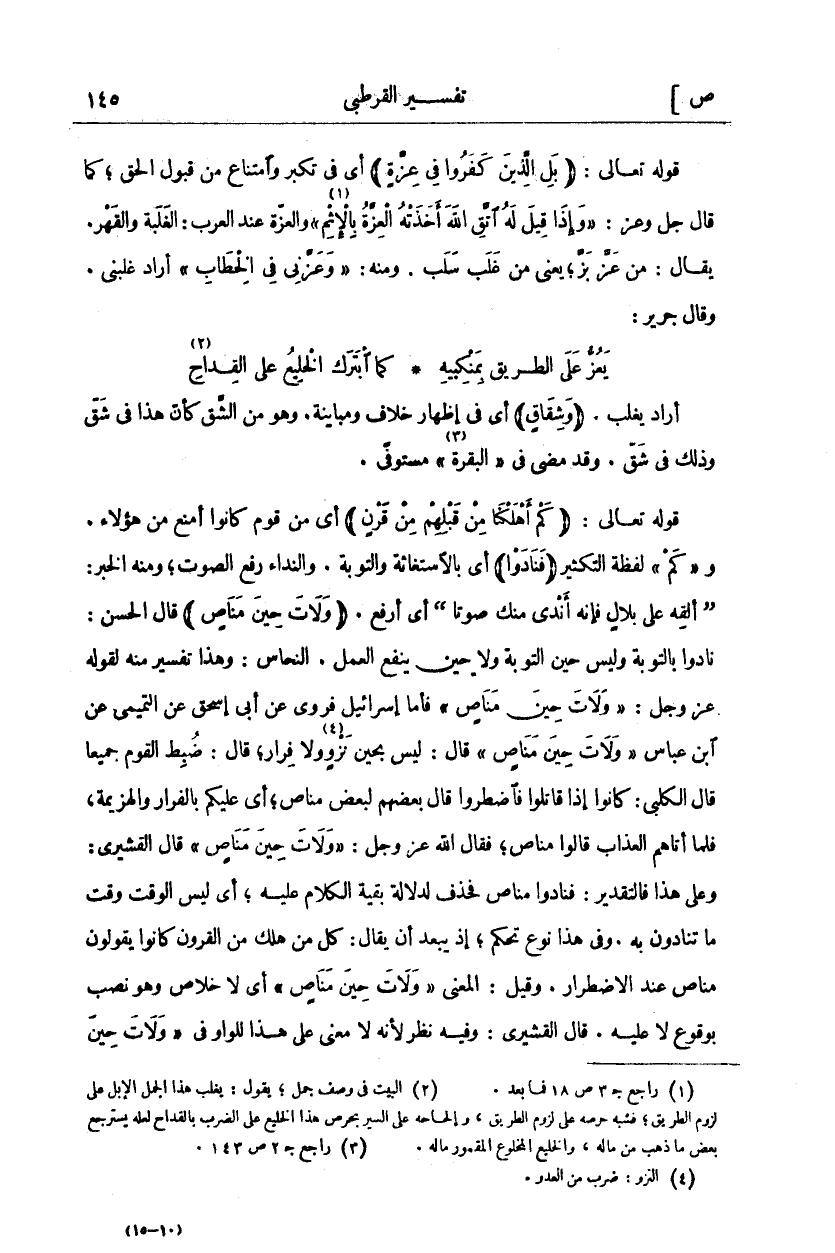 أراد يغلب." وَشِقَاقٍ" أَيْ فِي إِظْهَارِ خِلَافٍ وَمُبَايَنَةٍ. وَهُوَ مِنَ الشِّقِّ كَأَنَّ هَذَا فِي شِقٍّ وَذَلِكَ فِي شِقٍّ. وَقَدْ مَضَى فِي" الْبَقَرَةِ" «٢» مُسْتَوْفًى. قَوْلُهُ تَعَالَى:" كَمْ أَهْلَكْنا مِنْ قَبْلِهِمْ مِنْ قَرْنٍ" أَيْ قَوْمٌ كَانُوا أَمْنَعَ مِنْ هَؤُلَاءِ. وَ" كَمْ" لَفْظَةُ التَّكْثِيرِ" فَنادَوْا" أَيْ بِالِاسْتِغَاثَةِ وَالتَّوْبَةِ. وَالنِّدَاءُ رَفْعُ الصَّوْتِ، وَمِنْهُ الْخَبَرُ:" أَلْقِهِ عَلَى بِلَالٍ فَإِنَّهُ أَنْدَى مِنْكَ صَوْتًا" أَيْ أَرْفَعُ." وَلاتَ حِينَ مَناصٍ" قَالَ الْحَسَنُ: نَادَوْا بِالتَّوْبَةِ وَلَيْسَ حِينَ التَّوْبَةِ وَلَا حِينَ يَنْفَعُ الْعَمَلُ. النَّحَّاسُ: وَهَذَا تَفْسِيرٌ مِنْهُ لِقَوْلِهِ عَزَّ وَجَلَّ:" وَلاتَ حِينَ مَناصٍ" فَأَمَّا إِسْرَائِيلُ فَرَوَى عَنْ أَبِي إِسْحَاقَ عَنِ التَّمِيمِيِّ عَنِ ابْنِ عَبَّاسٍ:" وَلاتَ حِينَ مَناصٍ" قَالَ: لَيْسَ بِحِينِ نَزْوٍ «٣» وَلَا فِرَارٍ، قَالَ: ضَبْطُ الْقَوْمِ جَمِيعًا قَالَ الْكَلْبِيُّ: كَانُوا إِذَا قَاتَلُوا فَاضْطُرُّوا قَالَ بَعْضُهُمْ لِبَعْضٍ مَنَاصَ، أَيْ عَلَيْكُمْ بِالْفِرَارِ وَالْهَزِيمَةِ، فَلَمَّا أَتَاهُمُ الْعَذَابُ قَالُوا مَنَاصَ، فَقَالَ اللَّهُ عَزَّ وَجَلَّ:" وَلاتَ حِينَ مَناصٍ" قَالَ الْقُشَيْرِيُّ: وَعَلَى هَذَا فَالتَّقْدِيرُ، فَنَادَوْا مَنَاصَ فَحُذِفَ لِدَلَالَةِ بَقِيَّةِ الْكَلَامِ عَلَيْهِ، أَيْ لَيْسَ الْوَقْتُ وَقْتَ مَا تُنَادُونَ بِهِ. وَفِي هَذَا نَوْعُ تَحَكُّمٍ، إِذْ يَبْعُدُ أَنْ يُقَالَ: كُلُّ مَنْ هَلَكَ مِنَ الْقُرُونِ كَانُوا يَقُولُونَ مَنَاصَ عِنْدَ الِاضْطِرَارِ. وقيل: المعنى" وَلاتَ حِينَ مَناصٍ" أي لإخلاص وَهُوَ نَصْبٌ بِوُقُوعِ لَا عَلَيْهِ. قَالَ الْقُشَيْرِيُّ: وَفِيهِ نَظَرٌ لِأَنَّهُ لَا مَعْنَى عَلَى هَذَا للواو في" وَلاتَ حِينَ مَناصٍ"