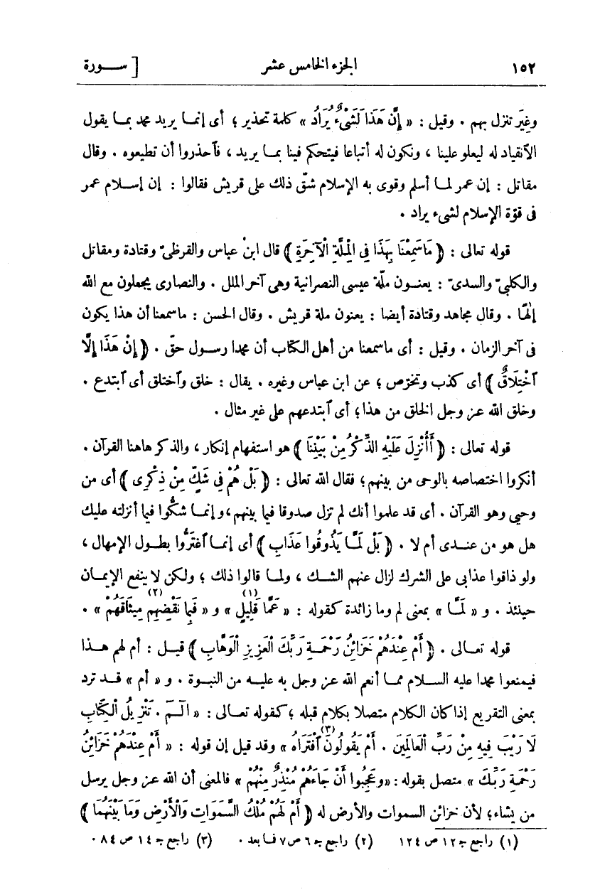 قَالَ ابْنُ عَبَّاسٍ وَالْقُرَظِيُّ وَقَتَادَةُ وَمُقَاتِلٌ وَالْكَلْبِيُّ وَالسُّدِّيُّ: يَعْنُونَ مِلَّةَ عِيسَى النَّصْرَانِيَّةَ وَهِيَ آخِرُ الْمِلَلِ. وَالنَّصَارَى يَجْعَلُونَ مَعَ اللَّهِ إِلَهًا. وَقَالَ مُجَاهِدٌ وَقَتَادَةُ أَيْضًا: يَعْنُونَ مِلَّةَ قُرَيْشٍ. وَقَالَ الْحَسَنُ: مَا سَمِعْنَا أَنَّ هَذَا يَكُونُ فِي آخِرِ الزَّمَانِ. وَقِيلَ: أَيْ مَا سَمِعْنَا مِنْ أَهْلِ الْكِتَابِ أَنَّ مُحَمَّدًا رَسُولٌ حَقٌّ." إِنْ هَذَا إِلَّا اخْتِلاقٌ" أَيْ كَذِبٌ وَتَخَرُّصٌ، عَنِ ابْنِ عَبَّاسٍ وَغَيْرِهِ. يُقَالُ: خَلَقَ وَاخْتَلَقَ أَيِ ابْتَدَعَ، وَخَلَقَ اللَّهُ عَزَّ وَجَلَّ الْخَلْقَ مِنْ هَذَا، أَيِ ابْتَدَعَهُمْ عَلَى غَيْرِ مِثَالٍ. قَوْلُهُ تَعَالَى:" أَأُنْزِلَ عَلَيْهِ الذِّكْرُ مِنْ بَيْنِنا" هُوَ اسْتِفْهَامُ إِنْكَارٍ، وَالذِّكْرُ ها هنا الْقُرْآنُ. أَنْكَرُوا اخْتِصَاصَهُ بِالْوَحْيِ مِنْ بَيْنِهِمْ. فَقَالَ اللَّهُ تَعَالَى:" بَلْ هُمْ فِي شَكٍّ مِنْ ذِكْرِي" أَيْ مِنْ وَحْيِي وَهُوَ الْقُرْآنُ. أَيْ قَدْ عَلِمُوا أَنَّكَ لَمْ تَزَلْ صَدُوقًا فِيمَا بَيْنَهُمْ، وَإِنَّمَا شَكُّوا فِيمَا أَنْزَلْتُهُ عَلَيْكَ هَلْ هُوَ مِنْ عِنْدِي أَمْ لَا." بَلْ لَمَّا يَذُوقُوا عَذابِ" أَيْ إِنَّمَا اغْتَرُّوا بِطُولِ الْإِمْهَالِ، وَلَوْ ذَاقُوا عَذَابِي عَلَى الشِّرْكِ لَزَالَ عَنْهُمُ الشَّكُّ، وَلَمَا قَالُوا ذَلِكَ، وَلَكِنْ لَا يَنْفَعُ الْإِيمَانُ حِينَئِذٍ. وَ" لَمَّا" بِمَعْنَى لَمْ وَمَا زائدة كقوله:" عَمَّا قَلِيلٍ" [المؤمنون: ٤٠] وقوله" فَبِما نَقْضِهِمْ مِيثاقَهُمْ" [النساء: ١٥٥]. قَوْلُهُ تَعَالَى:" أَمْ عِنْدَهُمْ خَزائِنُ رَحْمَةِ رَبِّكَ الْعَزِيزِ الْوَهَّابِ" قِيلَ: أَمْ لَهُمْ هَذَا فَيَمْنَعُوا مُحَمَّدًا عَلَيْهِ السَّلَامُ مِمَّا أَنْعَمَ اللَّهُ عَزَّ وَجَلَّ بِهِ عَلَيْهِ مِنَ النُّبُوَّةِ. وَ" أَمْ" قد ترد بمعنى التقريع إذا كالكلام مُتَّصِلًا بِكَلَامٍ قَبْلَهُ، كَقَوْلِهِ تَعَالَى:" الم تَنْزِيلُ الْكِتابِ لَا رَيْبَ فِيهِ مِنْ رَبِّ الْعالَمِينَ أَمْ يَقُولُونَ افْتَراهُ" [السجدة: ٣ - ١] وَقَدْ قِيلَ إِنَّ قَوْلَهُ:" أَمْ عِنْدَهُمْ خَزائِنُ رَحْمَةِ رَبِّكَ" متصل بقول:" وَعَجِبُوا أَنْ جاءَهُمْ مُنْذِرٌ مِنْهُمْ" [ص: ٤] فَالْمَعْنَى أَنَّ اللَّهَ عَزَّ وَجَلَّ يُرْسِلُ مَنْ يشاء، لأن خزائن السموات وَالْأَرْضِ لَهُ." أَمْ لَهُمْ مُلْكُ السَّماواتِ وَالْأَرْضِ وَما بَيْنَهُما"