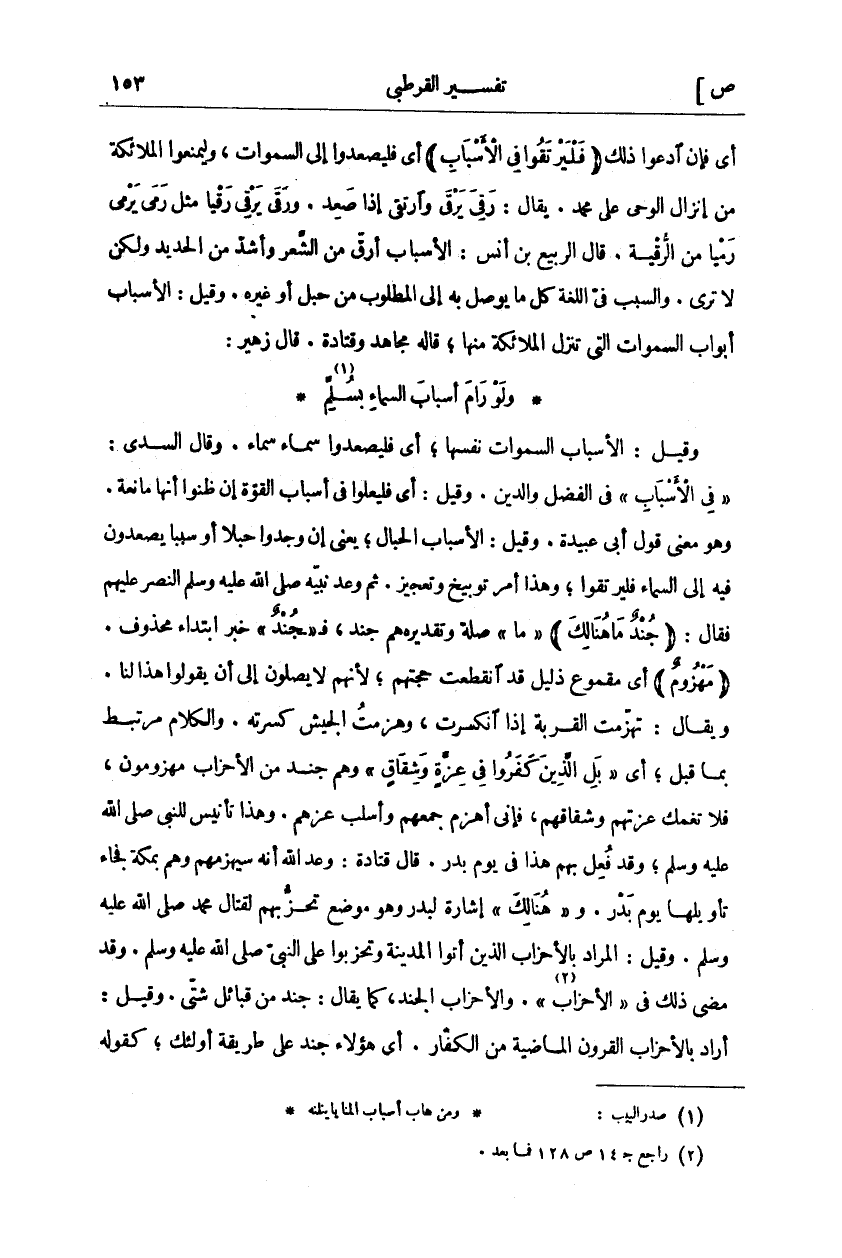 وقيل: الأسباب السموات نَفْسُهَا، أَيْ فَلْيَصْعَدُوا سَمَاءً سَمَاءً. وَقَالَ السُّدِّيُّ:" فِي الْأَسْبابِ" فِي الْفَضْلِ وَالدِّينِ. وَقِيلَ: أَيْ فَلْيُعْلُوا فِي أَسْبَابِ الْقُوَّةِ إِنْ ظَنُّوا أَنَّهَا مَانِعَةٌ. وَهُوَ مَعْنَى قَوْلِ أَبِي