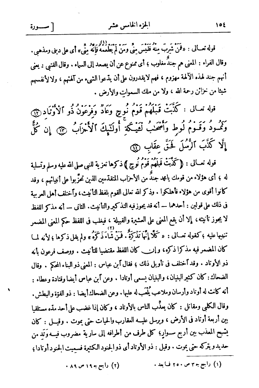 قَوْلُهُ تَعَالَى:" كَذَّبَتْ قَبْلَهُمْ قَوْمُ نُوحٍ" ذَكَرَهَا تَعْزِيَةً لِلنَّبِيِّ صَلَّى اللَّهُ عَلَيْهِ وَسَلَّمَ وَتَسْلِيَةً لَهُ، أَيْ هَؤُلَاءِ مِنْ قَوْمِكَ يَا مُحَمَّدُ جُنْدٌ مِنَ الْأَحْزَابِ الْمُتَقَدِّمِينَ الَّذِينَ تَحَزَّبُوا عَلَى أَنْبِيَائِهِمْ، وَقَدْ كَانُوا أَقْوَى مِنْ هَؤُلَاءِ فَأُهْلِكُوا. وَذَكَرَ اللَّهُ تَعَالَى الْقَوْمَ بِلَفْظِ التَّأْنِيثِ، وَاخْتَلَفَ أَهْلُ الْعَرَبِيَّةِ فِي ذَلِكَ عَلَى قَوْلَيْنِ: أَحَدُهُمَا: أَنَّهُ قَدْ يَجُوزُ فِيهِ التَّذْكِيرُ وَالتَّأْنِيثُ. الثَّانِي- أَنَّهُ مُذَكَّرُ اللَّفْظِ لَا يَجُوزُ تَأْنِيثُهُ، إِلَّا أَنْ يَقَعَ الْمَعْنَى عَلَى الْعَشِيرَةِ وَالْقَبِيلَةِ، فَيَغْلِبَ فِي اللَّفْظِ حُكْمُ الْمَعْنَى الْمُضْمَرِ تَنْبِيهًا عليه، كقول تَعَالَى:" كَلَّا إِنَّها تَذْكِرَةٌ فَمَنْ شاءَ ذَكَرَهُ" [المدثر: ٥٥ - ٥٤] وَلَمْ يَقُلْ ذَكَرَهَا، لِأَنَّهُ لَمَّا كَانَ الْمُضْمَرُ فِيهِ مُذَكَّرًا ذَكَّرَهُ، وَإِنْ كَانَ اللَّفْظُ مُقْتَضِيًا لِلتَّأْنِيثِ. وَوَصَفَ فِرْعَوْنَ بِأَنَّهُ ذُو الْأَوْتَادِ. وَقَدِ اخْتُلِفَ فِي تَأْوِيلِ ذَلِكَ، فَقَالَ ابْنُ عَبَّاسٍ: الْمَعْنَى ذُو الْبِنَاءِ الْمُحْكَمِ. وَقَالَ الضَّحَّاكُ: كَانَ كَثِيرَ الْبُنْيَانِ، وَالْبُنْيَانُ يُسَمَّى أَوْتَادًا. وَعَنِ ابْنِ عَبَّاسٍ أَيْضًا وَقَتَادَةَ وَعَطَاءٍ: أَنَّهُ كَانَتْ لَهُ أَوْتَادٌ وَأَرْسَانٌ وَمَلَاعِبُ يُلْعَبُ لَهُ عَلَيْهَا. وَعَنِ الضَّحَّاكِ أَيْضًا: ذُو الْقُوَّةِ وَالْبَطْشِ. وَقَالَ الْكَلْبِيُّ وَمُقَاتِلٌ: كَانَ يُعَذِّبُ النَّاسَ بِالْأَوْتَادِ، وَكَانَ إِذَا غَضِبَ عَلَى أَحَدٍ مَدَّهُ مُسْتَلْقِيًا بَيْنَ أَرْبَعَةِ أَوْتَادٍ فِي الْأَرْضِ، وَيُرْسِلُ عَلَيْهِ الْعَقَارِبَ وَالْحَيَّاتِ حَتَّى يَمُوتَ. وَقِيلَ: كَانَ يُشَبِّحُ الْمُعَذَّبَ بَيْنَ أَرْبَعِ سِوَارٍ، كُلُّ طَرَفٍ مِنْ أَطْرَافِهِ إِلَى سَارِيَةٍ مَضْرُوبٌ فِيهِ وَتِدٌ مِنْ حَدِيدٍ وَيَتْرُكُهُ حَتَّى يَمُوتَ. وَقِيلَ: ذُو الْأَوْتَادِ أَيْ ذُو الْجُنُودِ الْكَثِيرَةِ فَسُمِّيَتِ الْجُنُودُ أَوْتَادًا،