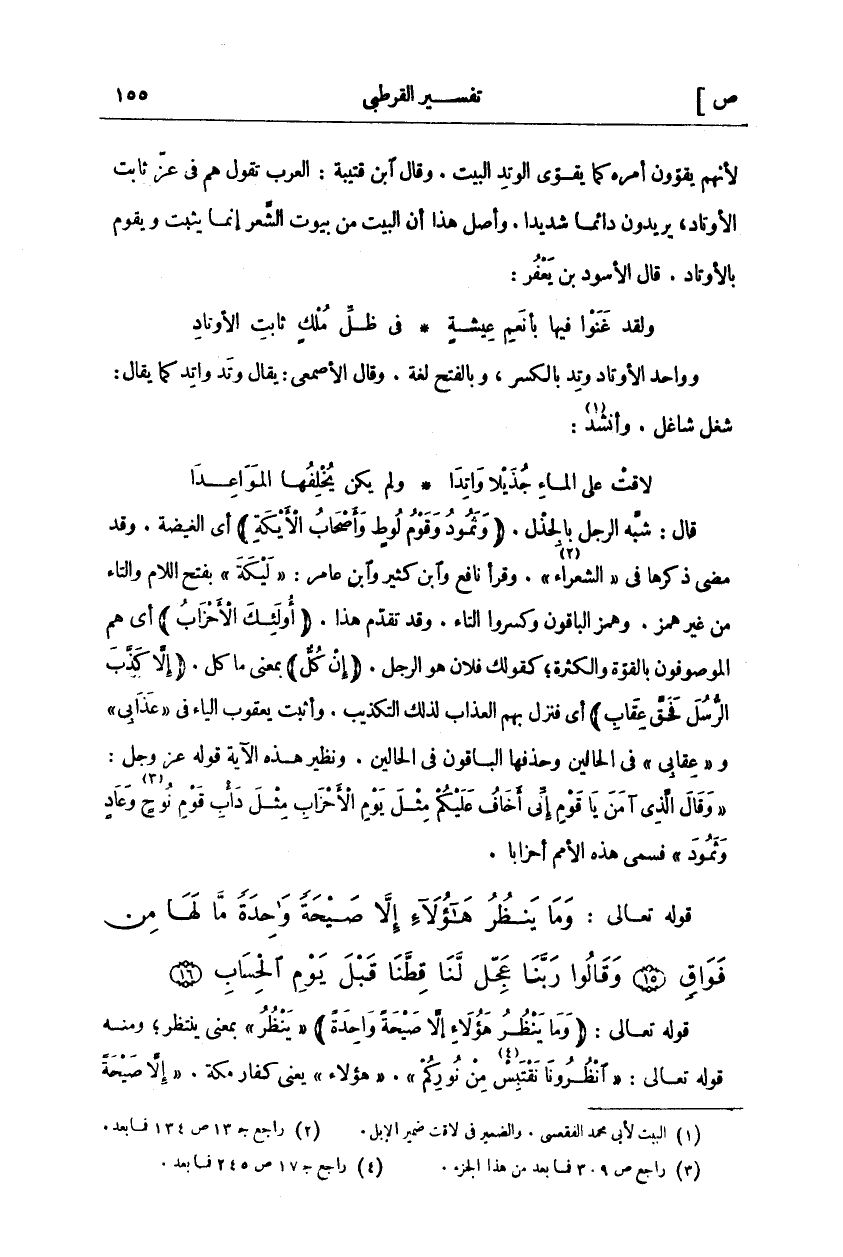 قَالَ: شَبَّهَ الرَّجُلَ بِالْجِذْلِ." وَثَمُودُ وَقَوْمُ لُوطٍ وَأَصْحابُ الْأَيْكَةِ" أَيِ الْغَيْضَةُ. وَقَدْ مَضَى ذِكْرُهَا فِي [الشُّعَرَاءِ «٢»]. وَقَرَأَ نَافِعٌ وَابْنُ كَثِيرٍ وَابْنُ عَامِرٍ" لَيْكَةَ" بِفَتْحِ اللَّامِ وَالتَّاءِ مِنْ غَيْرِ هَمْزٍ. وَهَمَزَ الْبَاقُونَ وَكَسَرُوا التَّاءَ. وَقَدْ تَقَدَّمَ هَذَا." أُولئِكَ الْأَحْزابُ" أَيْ هُمُ الْمَوْصُوفُونَ بِالْقُوَّةِ وَالْكَثْرَةِ، كَقَوْلِكَ فُلَانٌ هُوَ الرَّجُلُ." إِنْ كُلٌّ" بِمَعْنَى مَا كُلٌّ." إِلَّا كَذَّبَ الرُّسُلَ فَحَقَّ عِقابِ" أَيْ فَنَزَلَ بِهِمُ الْعَذَابُ لِذَلِكَ التَّكْذِيبِ. وَأَثْبَتَ يَعْقُوبُ الْيَاءَ فِي" عَذَابِي" وَ" عِقَابِي" فِي الْحَالَيْنِ وَحَذَفَهَا الْبَاقُونَ فِي الْحَالَيْنِ. وَنَظِيرُ هَذِهِ الْآيَةِ قَوْلُهُ عَزَّ وَجَلَّ:" وَقالَ الَّذِي آمَنَ يَا قَوْمِ إِنِّي أَخافُ عَلَيْكُمْ مِثْلَ يَوْمِ الْأَحْزابِ مِثْلَ دَأْبِ قَوْمِ نُوحٍ وَعادٍ وَثَمُودَ" [غافر: ٣١ - ٣٠] فسمى هذه الأمم أحزابا.