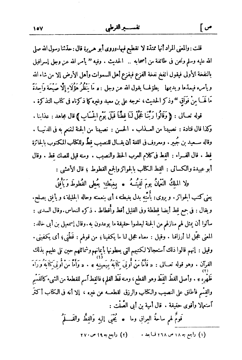 قُلْتُ: وَالْمَعْنَى الْمُرَادُ أَنَّهَا مُمْتَدَّةٌ لَا تَقْطِيعَ فِيهَا. وَرَوَى أَبُو هُرَيْرَةَ قَالَ: حَدَّثَنَا رَسُولُ اللَّهِ صَلَّى اللَّهُ عَلَيْهِ وَسَلَّمَ وَنَحْنُ فِي طَائِفَةٍ مِنْ أَصْحَابِهِ، الْحَدِيثَ. وَفِيهِ،" يَأْمُرُ اللَّهُ عَزَّ وَجَلَّ إِسْرَافِيلَ بِالنَّفْخَةِ الْأُولَى فَيَقُولُ انْفُخْ نفخة الفزع أهل السموات وَأَهْلُ الْأَرْضِ إِلَّا مَنْ شَاءَ اللَّهُ وَيَأْمُرُهُ فَيَمُدُّهَا وَيُدِيمُهَا وَيُطَوِّلُهَا يَقُولُ اللَّهُ عَزَّ وَجَلَّ:" مَا يَنْظُرُ هؤُلاءِ إِلَّا صَيْحَةً واحِدَةً مَا لَها مِنْ فَواقٍ"