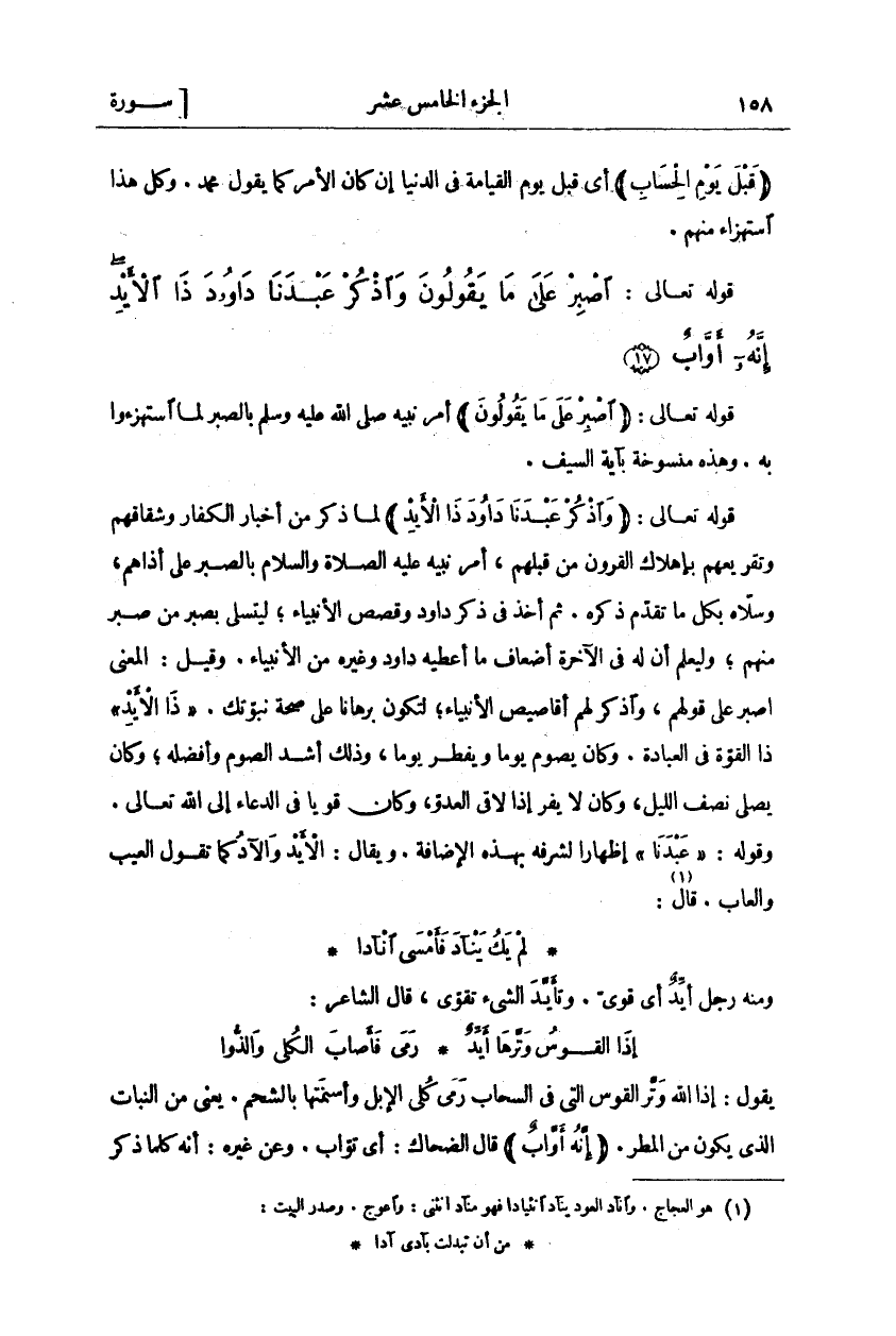قَوْلُهُ تَعَالَى:" اصْبِرْ عَلى مَا يَقُولُونَ" أَمَرَ نَبِيَّهُ صَلَّى اللَّهُ عَلَيْهِ وَسَلَّمَ بِالصَّبْرِ لَمَّا اسْتَهْزَءُوا بِهِ. وَهَذِهِ مَنْسُوخَةٌ بِآيَةِ السَّيْفِ. قَوْلُهُ تَعَالَى:" وَاذْكُرْ عَبْدَنا داوُدَ ذَا الْأَيْدِ" لَمَّا ذَكَرَ مِنْ أَخْبَارِ الْكُفَّارِ وَشِقَاقِهِمْ وَتَقْرِيعِهِمْ بِإِهْلَاكِ الْقُرُونِ مِنْ قَبْلِهِمْ، أَمَرَ نَبِيَّهُ عَلَيْهِ الصَّلَاةُ وَالسَّلَامُ بِالصَّبْرِ عَلَى أَذَاهُمْ، وَسَلَّاهُ بِكُلِّ مَا تَقَدَّمَ ذِكْرُهُ. ثُمَّ أَخَذَ فِي ذِكْرِ دَاوُدَ وَقَصَصِ الْأَنْبِيَاءِ، لِيَتَسَلَّى بِصَبْرِ مَنْ صَبَرَ مِنْهُمْ، وَلِيَعْلَمَ أَنَّ لَهُ فِي الْآخِرَةِ أَضْعَافَ مَا أُعْطِيَهُ دَاوُدُ وَغَيْرُهُ مِنَ الْأَنْبِيَاءِ. وَقِيلَ: الْمَعْنَى اصْبِرْ عَلَى قَوْلِهِمْ، وَاذْكُرْ لَهُمْ أَقَاصِيصَ الْأَنْبِيَاءِ، لِتَكُونَ بُرْهَانًا عَلَى صِحَّةِ نُبُوَّتِكَ." ذَا الْأَيْدِ" ذَا الْقُوَّةِ فِي الْعِبَادَةِ. وَكَانَ يَصُومُ يَوْمًا وَيُفْطِرُ يَوْمًا، وَذَلِكَ أَشَدُّ الصَّوْمِ وَأَفْضَلُهُ، وَكَانَ يُصَلِّي نِصْفَ اللَّيْلِ، وَكَانَ لَا يَفِرُّ إِذَا لَاقَى الْعَدُوَّ، وَكَانَ قويا في الدعا إِلَى اللَّهِ تَعَالَى. وَقَوْلُهُ:" عَبْدَنا" إِظْهَارًا لِشَرَفِهِ بِهَذِهِ الْإِضَافَةِ. وَيُقَالُ: الْأَيْدُ وَالْآدُّ كَمَا تَقُولُ العيب والعاب. قال»