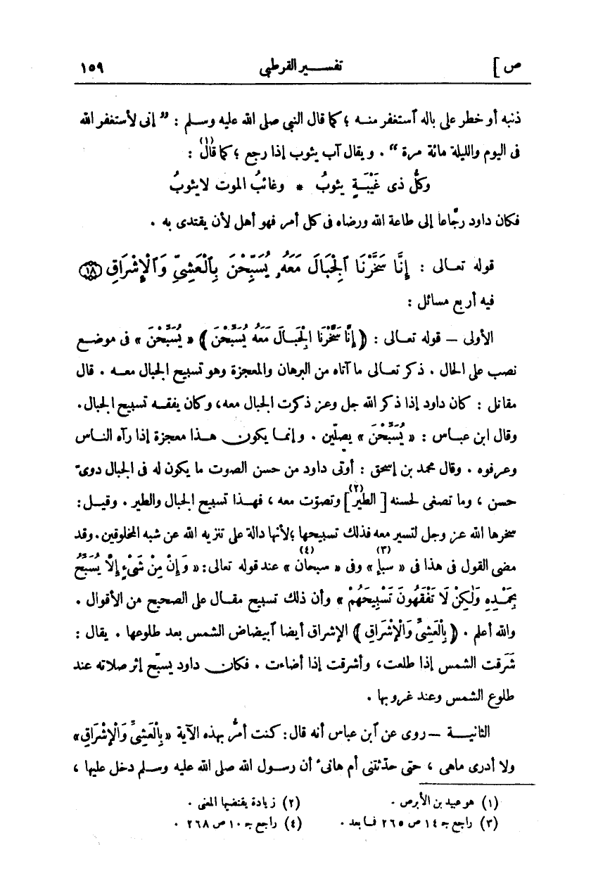 فِيهِ أَرْبَعُ مَسَائِلَ الْأُولَى- قَوْلُهُ تَعَالَى:" إِنَّا سَخَّرْنَا الْجِبالَ مَعَهُ يُسَبِّحْنَ"" يُسَبِّحْنَ" فِي مَوْضِعِ نَصْبٍ عَلَى الْحَالِ. ذَكَرَ تَعَالَى مَا آتَاهُ مِنَ الْبُرْهَانِ وَالْمُعْجِزَةِ وَهُوَ تَسْبِيحُ الْجِبَالِ مَعَهُ. قَالَ مُقَاتِلٌ: كَانَ دَاوُدُ إِذَا ذَكَرَ اللَّهَ جَلَّ وَعَزَّ ذَكَرَتِ الْجِبَالُ مَعَهُ، وَكَانَ يَفْقَهُ تَسْبِيحَ الْجِبَالِ. وَقَالَ ابْنُ عَبَّاسٍ:" يُسَبِّحْنَ" يُصَلِّينَ. وَإِنَّمَا يَكُونُ هَذَا مُعْجِزَةً إِذَا رَآهُ النَّاسُ وَعَرَفُوهُ. وَقَالَ مُحَمَّدُ بْنُ إِسْحَاقَ: أُوتِيَ دَاوُدُ مِنْ حُسْنِ الصَّوْتِ مَا يَكُونُ لَهُ فِي الْجِبَالِ دَوِيٌّ حَسَنٌ، وَمَا تُصْغِي لِحُسْنِهِ الطَّيْرُ «٢» وَتُصَوِّتُ مَعَهُ، فَهَذَا تَسْبِيحُ الْجِبَالِ وَالطَّيْرِ. وَقِيلَ: سَخَّرَهَا اللَّهُ عَزَّ وَجَلَّ لِتَسِيرَ مَعَهُ فَذَلِكَ تَسْبِيحُهَا، لِأَنَّهَا دَالَّةٌ عَلَى تَنْزِيهِ اللَّهِ عَنْ شَبَهِ الْمَخْلُوقِينَ. وَقَدْ مَضَى الْقَوْلُ فِي هَذَا فِي" سَبَأٍ" «٣» وَفِي" سُبْحَانَ" «٤» عِنْدَ قَوْلُهُ تَعَالَى:" وَإِنْ مِنْ شَيْءٍ إِلَّا يُسَبِّحُ بِحَمْدِهِ وَلكِنْ لا تَفْقَهُونَ تَسْبِيحَهُمْ" [الإسراء: ٤٤] وَأَنَّ ذَلِكَ تَسْبِيحُ مَقَالٍ عَلَى الصَّحِيحِ مِنَ الْأَقْوَالِ. وَاللَّهُ أَعْلَمُ." بِالْعَشِيِّ وَالْإِشْراقِ" الْإِشْرَاقُ أَيْضًا ابْيِضَاضُ الشَّمْسِ بَعْدَ طُلُوعِهَا. يُقَالُ: شَرَقَتِ الشَّمْسُ إِذَا طَلَعَتْ، وَأَشْرَقَتْ إِذَا أَضَاءَتْ. فَكَانَ دَاوُدُ يُسَبِّحُ إِثْرَ صَلَاتِهِ عِنْدَ طُلُوعِ الشَّمْسِ وَعِنْدَ غُرُوبِهَا. الثَّانِيَةُ- رُوِيَ عَنِ ابْنِ عَبَّاسٍ أَنَّهُ قَالَ: كُنْتُ أَمُرُّ بِهَذِهِ الْآيَةِ:" بِالْعَشِيِّ وَالْإِشْراقِ" وَلَا أَدْرِي مَا هِيَ، حَتَّى حَدَّثَتْنِي أُمُّ هَانِئٍ أَنَّ رَسُولَ اللَّهِ صَلَّى اللَّهُ عَلَيْهِ وَسَلَّمَ دخل عليها،