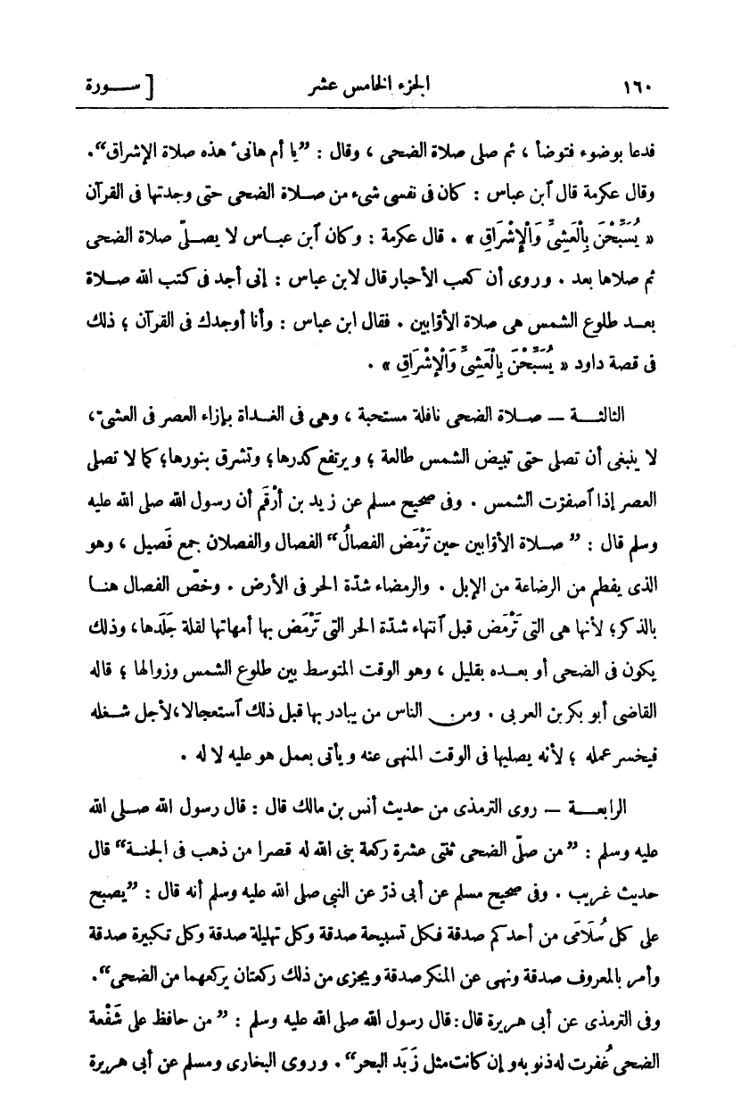 فَدَعَا بِوَضُوءٍ فَتَوَضَّأَ، ثُمَّ صَلَّى صَلَاةَ الضُّحَى، وَقَالَ:" يَا أُمَّ هَانِئٍ هَذِهِ صَلَاةُ الْإِشْرَاقِ". وَقَالَ عِكْرِمَةُ قَالَ ابْنُ عَبَّاسٍ: كَانَ فِي نفسي شي مِنْ صَلَاةِ الضُّحَى حَتَّى وَجَدْتُهَا فِي الْقُرْآنِ" يُسَبِّحْنَ بِالْعَشِيِّ وَالْإِشْراقِ". قَالَ عِكْرِمَةُ: وَكَانَ ابْنُ عَبَّاسٍ لَا يُصَلِّي صَلَاةَ الضُّحَى ثُمَّ صَلَّاهَا بَعْدُ. وَرُوِيَ أَنَّ كَعْبَ الْأَحْبَارِ قَالَ لِابْنِ عَبَّاسٍ: إِنِّي أَجِدُّ فِي كُتُبِ اللَّهِ صَلَاةً بَعْدَ طُلُوعِ الشَّمْسِ هِيَ صَلَاةُ الْأَوَّابِينَ. فَقَالَ ابْنُ عَبَّاسٍ: وَأَنَا أُوجِدُكَ فِي الْقُرْآنِ، ذَلِكَ فِي قِصَّةِ دَاوُدَ:" يُسَبِّحْنَ بِالْعَشِيِّ وَالْإِشْراقِ". الثَّالِثَةُ- صَلَاةُ الضُّحَى نَافِلَةٌ مُسْتَحَبَّةٌ، وَهِيَ فِي الْغَدَاةِ بِإِزَاءِ الْعَصْرِ فِي الْعَشِيِّ، لَا يَنْبَغِي أَنْ تُصَلَّى حَتَّى تَبْيَضَّ الشَّمْسُ طَالِعَةً، وَيَرْتَفِعُ كَدَرُهَا، وَتُشْرِقُ بِنُورِهَا، كَمَا لَا تُصَلَّى الْعَصْرُ إِذَا اصْفَرَّتِ الشَّمْسُ. وَفِي صَحِيحِ مُسْلِمٍ عَنْ زَيْدِ بْنِ أَرْقَمَ أَنَّ رَسُولَ اللَّهِ صَلَّى اللَّهُ عَلَيْهِ وَسَلَّمَ قَالَ:" صَلَاةُ الْأَوَّابِينَ حِينَ تَرْمَضُ الْفِصَالُ" الْفِصَالُ وَالْفِصْلَانُ جَمْعُ فَصِيلٍ، وَهُوَ الَّذِي يُفْطَمُ مِنَ الرَّضَاعَةِ مِنَ الْإِبِلِ. وَالرَّمْضَاءُ شِدَّةُ الْحَرِّ فِي الْأَرْضِ. وَخُصَّ الْفِصَالُ هُنَا بِالذِّكْرِ، لِأَنَّهَا هِيَ الَّتِي تَرْمَضُ قَبْلَ انْتِهَاءِ شِدَّةِ الْحَرِّ الَّتِي تَرْمَضُ بِهَا أُمَّهَاتُهَا لِقِلَّةِ جَلَدِهَا، وَذَلِكَ يَكُونُ فِي الضُّحَى أَوْ بَعْدَهُ بِقَلِيلٍ وَهُوَ الْوَقْتُ الْمُتَوَسِّطُ بَيْنَ طُلُوعِ الشَّمْسِ وَزَوَالِهَا، قَالَهُ الْقَاضِي أَبُو بَكْرِ بْنُ الْعَرَبِيِّ. وَمِنَ النَّاسِ مَنْ يُبَادِرُ بِهَا قَبْلَ ذَلِكَ اسْتِعْجَالًا، لِأَجْلِ شُغْلِهِ فَيَخْسَرُ عَمَلَهُ، لِأَنَّهُ يُصَلِّيهَا فِي الْوَقْتِ الْمَنْهِيِّ عَنْهُ وَيَأْتِي بِعَمَلٍ هُوَ عَلَيْهِ لَا لَهُ. الرَّابِعَةُ- رَوَى التِّرْمِذِيُّ مِنْ حَدِيثِ أَنَسِ بْنِ مَالِكٍ قَالَ قَالَ رَسُولُ اللَّهِ صَلَّى اللَّهُ عَلَيْهِ وَسَلَّمَ:" مَنْ صَلَّى الضُّحَى ثِنْتَيْ عَشْرَةَ رَكْعَةً بَنَى اللَّهُ لَهُ قَصْرًا مِنْ ذَهَبٍ فِي الْجَنَّةِ" قَالَ حَدِيثٌ غَرِيبٌ. وَفِي صَحِيحِ مُسْلِمٍ عَنْ أَبِي ذَرٍّ عَنِ النَّبِيِّ صَلَّى اللَّهُ عَلَيْهِ وَسَلَّمَ أَنَّهُ قَالَ:" يُصْبِحُ عَلَى كُلِّ سُلَامَى مِنْ أَحَدِكُمْ صَدَقَةٌ فَكُلُّ تَسْبِيحَةٍ صَدَقَةٌ وَكُلُّ تَهْلِيلَةٍ صَدَقَةٌ وَكُلُّ تَكْبِيرَةٍ صَدَقَةٌ وَأَمْرٌ بِالْمَعْرُوفِ صَدَقَةٌ وَنَهْيٌ عَنِ الْمُنْكَرِ صَدَقَةٌ وَيُجْزِي مِنْ ذَلِكَ رَكْعَتَانِ يَرْكَعُهُمَا مِنَ الضُّحَى". وَفِي التِّرْمِذِيُّ عَنْ أَبِي هُرَيْرَةَ قَالَ قَالَ رَسُولُ اللَّهِ صَلَّى اللَّهُ عَلَيْهِ وَسَلَّمَ:" مَنْ حَافَظَ عَلَى شُفْعَةِ الضُّحَى غُفِرَتْ له ذنوبه وإن كانت مئل زَبَدِ الْبَحْرِ". وَرَوَى الْبُخَارِيُّ وَمُسْلِمٌ عَنْ أَبِي هريرة