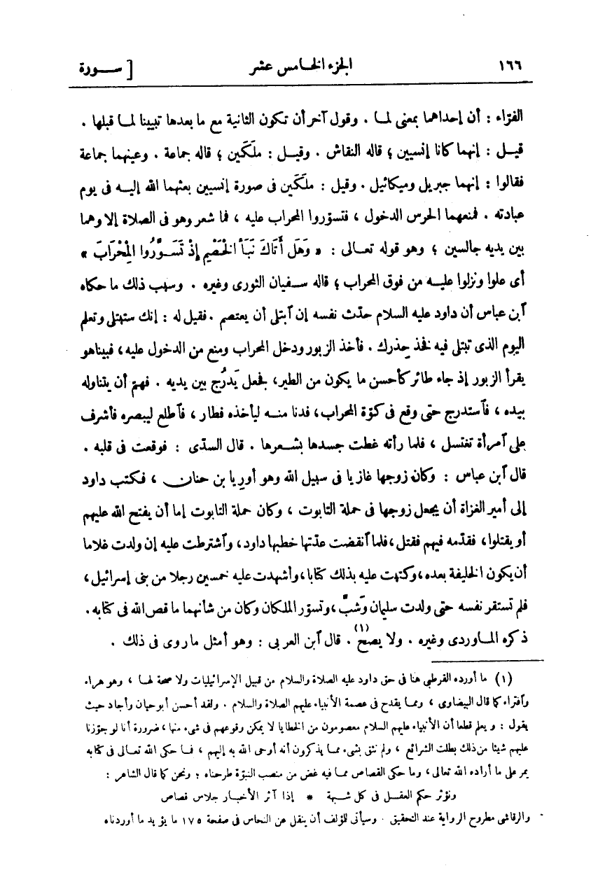 الْفَرَّاءُ: أَنَّ إِحْدَاهُمَا بِمَعْنَى لَمَّا. وَقَوْلٌ آخَرُ أَنْ تَكُونَ الثَّانِيَةُ مَعَ مَا بَعْدَهَا تَبْيِينًا لِمَا قَبْلَهَا. قِيلَ: إِنَّهُمَا كَانَا إِنْسِيَّيْنِ، قَالَهُ النقاش. وقيل: ملكين، قال جَمَاعَةٌ. وَعَيَّنَهُمَا جَمَاعَةٌ فَقَالُوا: إِنَّهُمَا جِبْرِيلُ وَمِيكَائِيلُ. وَقِيلَ: مَلَكَيْنِ فِي صُورَةِ إِنْسِيَّيْنِ بَعَثَهُمَا اللَّهُ إِلَيْهِ فِي يَوْمِ عِبَادَتِهِ. فَمَنَعَهُمَا الْحَرَسُ الدُّخُولَ، فَتَسَوَّرُوا الْمِحْرَابَ عَلَيْهِ، فَمَا شَعَرَ وَهُوَ فِي الصَّلَاةِ إِلَّا وَهُمَا بَيْنَ يَدَيْهِ جَالِسَيْنِ، وَهُوَ قَوْلُهُ تَعَالَى:" وَهَلْ أَتاكَ نَبَأُ الْخَصْمِ إِذْ تَسَوَّرُوا الْمِحْرابَ" أَيْ عَلَوْا وَنَزَلُوا عَلَيْهِ مِنْ فوق المحراب، قال سُفْيَانُ الثَّوْرِيُّ وَغَيْرُهُ. وَسَبَبُ ذَلِكَ مَا حَكَاهُ ابْنُ عَبَّاسٍ أَنَّ دَاوُدَ عَلَيْهِ السَّلَامُ حَدَّثَ نَفْسَهَ إِنِ ابْتُلِيَ أَنْ يَعْتَصِمَ. فَقِيلَ لَهُ: إِنَّكَ سَتُبْتَلَى وَتَعْلَمُ الْيَوْمَ الَّذِي تُبْتَلَى فِيهِ فَخُذْ حِذْرَكَ. فَأَخَذَ الزَّبُورَ وَدَخَلَ الْمِحْرَابَ وَمَنَعَ مِنَ الدُّخُولِ عَلَيْهِ، فَبَيْنَا هُوَ يَقْرَأُ الزَّبُورَ إِذْ جَاءَ طَائِرٌ كَأَحْسَنِ مَا يَكُونُ مِنَ الطَّيْرِ، فَجَعَلَ يَدْرُجُ بَيْنَ يَدَيْهِ. فَهَمَّ أَنْ يَتَنَاوَلَهُ بِيَدِهِ، فَاسْتُدْرِجَ حَتَّى وَقَعَ فِي كُوَّةِ الْمِحْرَابِ، فَدَنَا مِنْهُ لِيَأْخُذَهُ فَطَارَ، فَاطَّلَعَ لِيُبْصِرَهُ فَأَشْرَفَ عَلَى امْرَأَةٍ تَغْتَسِلُ، فَلَمَّا رَأَتْهُ غَطَّتْ جَسَدَهَا بِشَعْرِهَا. قَالَ السُّدِّيُّ: فَوَقَعَتْ فِي قَلْبِهِ. قَالَ ابْنُ عَبَّاسٍ: وَكَانَ زَوْجُهَا غَازِيًا فِي سَبِيلِ اللَّهِ وَهُوَ أَوَرِيًّا بْنُ حَنَانَ، فَكَتَبَ دَاوُدُ إِلَى أَمِيرِ الْغُزَاةِ أَنْ يَجْعَلَ زَوْجَهَا فِي حَمَلَةِ التَّابُوتِ، وَكَانَ حَمَلَةُ التَّابُوتِ إِمَّا أَنْ يَفْتَحَ اللَّهُ عَلَيْهِمْ أَوْ يُقْتَلُوا، فَقَدَّمَهُ فِيهِمْ فَقُتِلَ، فَلَمَّا انْقَضَتْ عِدَّتُهَا خَطَبَهَا دَاوُدُ، وَاشْتَرَطَتْ عَلَيْهِ إِنْ وَلَدَتْ غُلَامًا أَنْ يَكُونَ الْخَلِيفَةَ بَعْدَهُ، وَكَتَبَتْ عَلَيْهِ بِذَلِكَ كِتَابًا، وَأَشْهَدَتْ عَلَيْهِ خَمْسِينَ رَجُلًا مِنْ بَنِي إِسْرَائِيلَ، فَلَمْ تَسْتَقِرَّ نَفْسُهُ حَتَّى وَلَدَتْ سُلَيْمَانَ وَشَبَّ، وَتَسَوَّرَ الْمَلَكَانِ وَكَانَ مِنْ شَأْنِهِمَا مَا قَصَّ اللَّهُ فِي كِتَابِهِ. ذَكَرَهُ الْمَاوَرْدِيُّ وَغَيْرُهُ. وَلَا يَصِحُّ. قال ابن لعربي: وهو أمثل ما روي في ذلك «١».