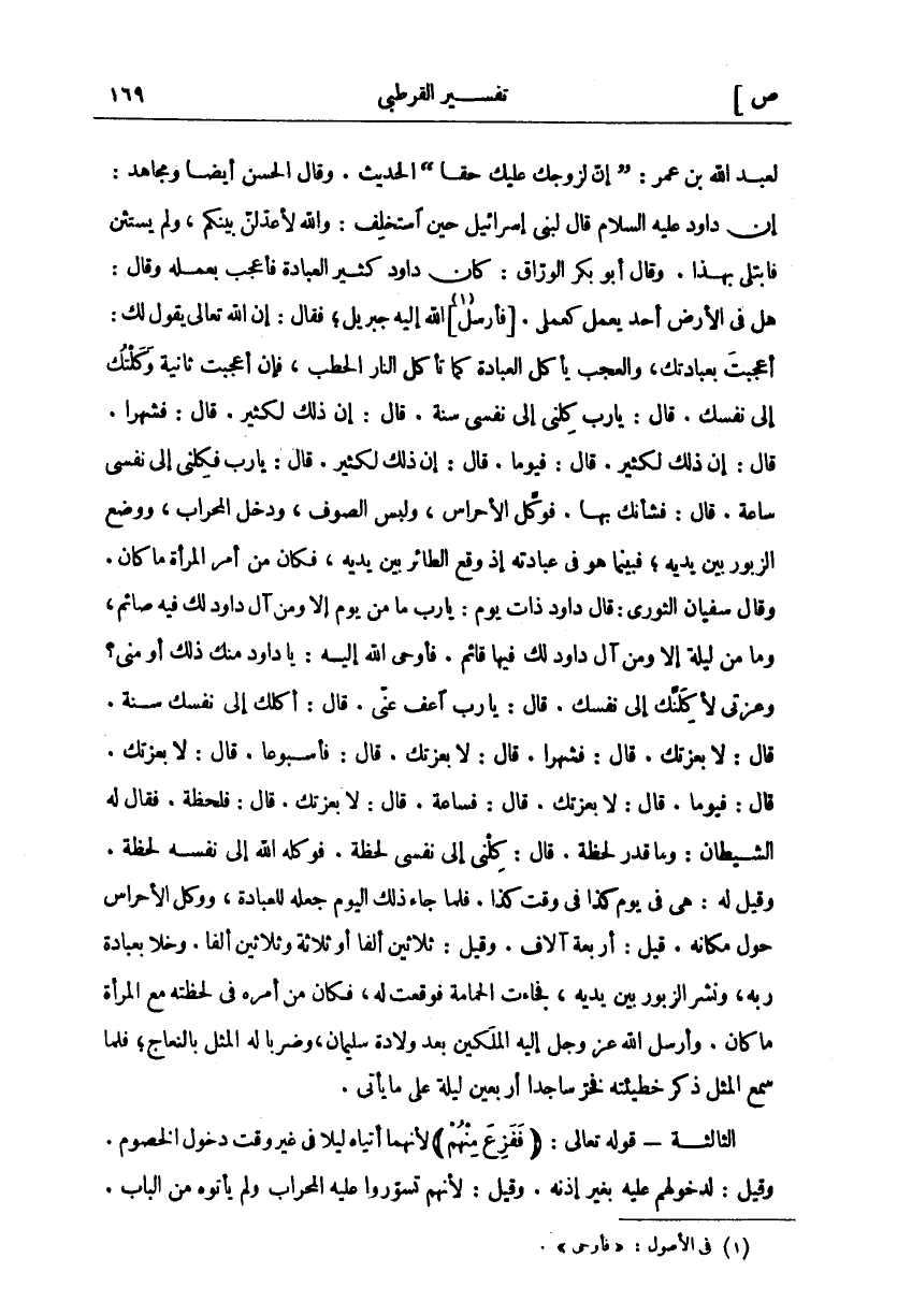 لعبد الله بن عمر:" إِنَّ لِزَوْجِكَ عَلَيْكَ حَقًّا" الْحَدِيثَ. وَقَالَ الْحَسَنُ أَيْضًا وَمُجَاهِدٌ: إِنَّ دَاوُدَ عَلَيْهِ السَّلَامُ قَالَ لِبَنِي إِسْرَائِيلَ حِينَ اسْتُخْلِفَ: وَاللَّهِ لَأَعْدِلَنَّ بَيْنَكُمْ، وَلَمْ يَسْتَثْنِ فَابْتُلِيَ بِهَذَا. وَقَالَ أَبُو بَكْرٍ الْوَرَّاقُ: كَانَ دَاوُدُ كَثِيرَ الْعِبَادَةِ فَأُعْجِبَ بِعَمَلِهِ وَقَالَ: هَلْ فِي الْأَرْضِ أَحَدٌ يَعْمَلُ كَعَمَلِي. [فَأَرْسَلَ «١»] اللَّهُ إِلَيْهِ جِبْرِيلَ، فَقَالَ: إِنَّ اللَّهَ تعالى يقول لك: عجبت بِعِبَادَتِكَ، وَالْعُجْبُ يَأْكُلُ الْعِبَادَةَ كَمَا تَأْكُلُ النَّارُ الْحَطَبَ، فَإِنْ أُعْجِبْتَ ثَانِيَةً وَكَلْتُكَ إِلَى نَفْسِكَ. قَالَ: يَا رَبِّ كِلْنِي إِلَى نَفْسِي سَنَةً. قَالَ: إِنَّ ذَلِكَ لَكَثِيرٌ. قَالَ: فَشَهْرًا. قَالَ: إِنَّ ذَلِكَ لَكَثِيرٌ. قَالَ: فَيَوْمًا. قَالَ: إِنَّ ذَلِكَ لَكَثِيرٌ. قَالَ: يَا رَبِّ فَكِلْنِي إِلَى نَفْسِي سَاعَةً. قَالَ: فَشَأْنُكَ بِهَا. فَوَكَّلَ الْأَحْرَاسَ، وَلَبِسَ الصُّوفَ، وَدَخَلَ الْمِحْرَابَ، وَوَضَعَ الزَّبُورَ بَيْنَ يَدَيْهِ، فَبَيْنَمَا هُوَ فِي عِبَادَتِهِ إِذْ وَقَعَ الطَّائِرُ بَيْنَ يَدَيْهِ، فَكَانَ مِنْ أَمْرِ الْمَرْأَةِ مَا كَانَ. وَقَالَ سُفْيَانُ الثَّوْرِيُّ: قَالَ دَاوُدُ ذَاتَ يَوْمٍ: يَا رَبِّ مَا مِنْ يَوْمٍ إِلَّا وَمِنْ آلِ دَاوُدَ لَكَ فِيهِ صَائِمٌ، وَمَا مِنْ لَيْلَةٍ إِلَّا وَمِنْ آلِ دَاوُدَ لَكَ فِيهَا قَائِمٌ. فَأَوْحَى اللَّهُ إِلَيْهِ: يَا دَاوُدُ مِنْكَ ذَلِكَ أَوْ مِنِّي؟ وَعِزَّتِي لَأَكِلَنَّكَ إِلَى نَفْسِكَ. قَالَ: يَا رَبِّ اعْفُ عَنِّي. قَالَ: أَكِلُكَ إِلَى نَفْسِكَ سَنَةً. قَالَ: لَا بِعِزَّتِكَ. قَالَ: فَشَهْرًا. قَالَ: لَا بِعِزَّتِكَ. قَالَ: فَأُسْبُوعًا. قَالَ: لَا بِعِزَّتِكَ. قَالَ: فَيَوْمًا. قَالَ: لَا بِعِزَّتِكَ. قَالَ: فَسَاعَةً. قَالَ: لَا بِعِزَّتِكَ. قَالَ: فَلَحْظَةً. فَقَالَ لَهُ الشَّيْطَانُ: وَمَا قَدْرُ لَحْظَةٍ. قَالَ: كِلْنِي إِلَى نَفْسِي لَحْظَةً. فَوَكَلَهُ اللَّهُ إِلَى نَفْسِهِ لَحْظَةً. وَقِيلَ لَهُ: هِيَ فِي يَوْمِ كَذَا فِي وَقْتِ كَذَا. فَلَمَّا جَاءَ ذَلِكَ الْيَوْمُ جَعَلَهُ لِلْعِبَادَةِ، وَوَكَّلَ الْأَحْرَاسَ حَوْلَ مَكَانِهِ. قِيلَ: أَرْبَعَةُ آلَافٍ. وَقِيلَ: ثَلَاثِينَ أَلْفًا أَوْ ثَلَاثَةً وَثَلَاثِينَ أَلْفًا. وَخَلَا بِعِبَادَةِ رَبِّهِ، وَنَشَرَ الزَّبُورَ بَيْنَ يَدَيْهِ، فَجَاءَتِ الْحَمَامَةُ فَوَقَعَتْ لَهُ، فَكَانَ مِنْ أَمْرِهِ فِي لَحْظَتِهِ مَعَ الْمَرْأَةِ مَا كَانَ. وَأَرْسَلَ اللَّهُ عَزَّ وَجَلَّ إِلَيْهِ الْمَلَكَيْنِ بَعْدَ وِلَادَةِ سُلَيْمَانَ، وَضَرَبَا لَهُ الْمَثَلَ بِالنِّعَاجِ، فَلَمَّا سَمِعَ الْمَثَلَ ذَكَرَ خَطِيئَتَهُ فَخَرَّ سَاجِدًا أَرْبَعِينَ لَيْلَةً عَلَى مَا يَأْتِي. الثَّالِثَةُ- قَوْلُهُ تَعَالَى:" فَفَزِعَ مِنْهُمْ" لِأَنَّهُمَا أَتَيَاهُ لَيْلًا فِي غَيْرِ وَقْتِ دُخُولِ الْخُصُومِ. وقيل: لد خولهم عَلَيْهِ بِغَيْرِ إِذْنِهِ. وَقِيلَ: لِأَنَّهُمْ تَسَوَّرُوا عَلَيْهِ المحراب ولم يأتوه من الباب.