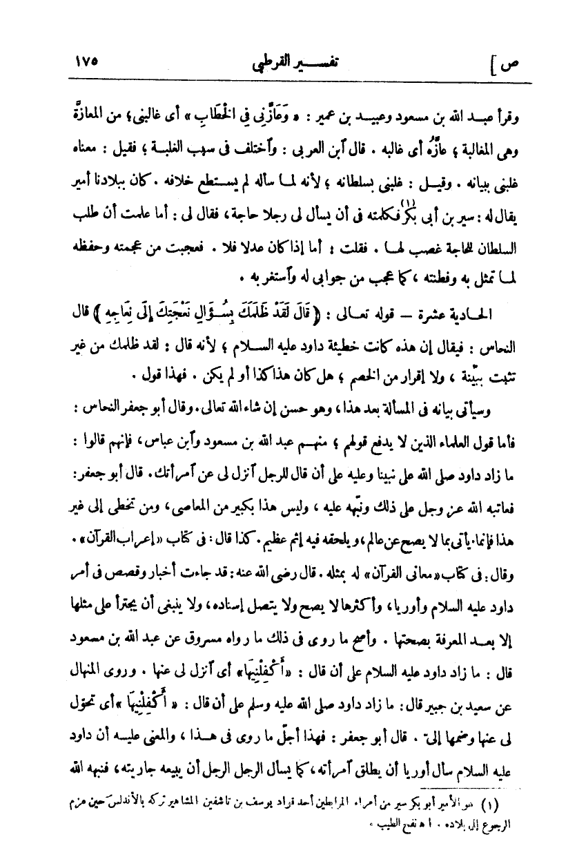 وَقَرَأَ عَبْدُ اللَّهِ بْنُ مَسْعُودٍ وَعُبَيْدُ بْنُ عُمَيْرٍ:" وَعَازَنِي فِي الْخِطَابِ" أَيْ غَالَبَنِي، مِنَ الْمُعَازَّةِ وَهِيَ الْمُغَالَبَةُ، عَازَّهُ أَيْ غَالَبَهُ. قَالَ ابْنُ الْعَرَبِيِّ: وَاخْتُلِفَ فِي سَبَبِ الْغَلَبَةِ، فَقِيلَ: مَعْنَاهُ غَلَبَنِي بِبَيَانِهِ. وَقِيلَ: غَلَبَنِي بِسُلْطَانِهِ، لِأَنَّهُ لَمَّا سَأَلَهُ لَمْ يَسْتَطِعْ خِلَافَهُ. كَانَ بِبِلَادِنَا أَمِيرٌ يُقَالُ لَهُ: سَيْرُ بْنُ أَبِي بَكْرٍ فَكَلَّمْتُهُ «١» فِي أَنْ يَسْأَلَ لِي رَجُلًا حَاجَةً، فَقَالَ لِي: أَمَا عَلِمْتَ أَنَّ طَلَبَ السُّلْطَانِ لِلْحَاجَةِ غَصْبٌ لَهَا. فَقُلْتُ: أَمَّا إِذَا كَانَ عَدْلًا فَلَا. فَعَجِبْتُ مِنْ عُجْمَتِهِ وَحِفْظِهِ لِمَا تَمَثَّلَ بِهِ وَفِطْنَتِهِ، كَمَا عَجِبَ مِنْ جَوَابِي لَهُ وَاسْتَغْرَبَهُ. الْحَادِيَةُ عَشْرَةَ- قَوْلُهُ تَعَالَى:" قالَ لَقَدْ ظَلَمَكَ بِسُؤالِ نَعْجَتِكَ إِلى نِعاجِهِ" قَالَ النَّحَّاسُ: فَيُقَالُ إِنَّ هَذِهِ كَانَتْ خَطِيئَةَ دَاوُدَ عَلَيْهِ السَّلَامُ، لِأَنَّهُ قَالَ: لَقَدْ ظَلَمَكَ مِنْ غَيْرِ تَثَبُّتٍ بِبَيِّنَةٍ، وَلَا إِقْرَارَ مِنَ الْخَصْمِ، هَلْ كَانَ هَذَا كَذَا أَوْ لَمْ يَكُنْ. فَهَذَا قَوْلٌ. وَسَيَأْتِي بَيَانُهُ فِي الْمَسْأَلَةِ بَعْدَ هَذَا، وَهُوَ حَسَنٌ إِنْ شَاءَ اللَّهُ تَعَالَى. وَقَالَ أَبُو جَعْفَرٍ النَّحَّاسُ: فَأَمَّا قَوْلُ الْعُلَمَاءِ الَّذِينَ لَا يُدْفَعُ قَوْلُهُمْ، مِنْهُمْ عَبْدُ اللَّهِ بْنُ مَسْعُودٍ وَابْنُ عَبَّاسٍ، فَإِنَّهُمْ قَالُوا: مَا زَادَ دَاوُدُ صَلَّى اللَّهُ عَلَى نَبِيِّنَا وَعَلَيْهِ عَلَى أَنْ قَالَ لِلرَّجُلِ انْزِلْ لِي عَنِ امْرَأَتِكَ. قَالَ أَبُو جَعْفَرٍ: فَعَاتَبَهُ اللَّهُ عَزَّ وَجَلَّ عَلَى ذَلِكَ وَنَبَّهَهُ عَلَيْهِ، وَلَيْسَ هَذَا بِكَبِيرٍ مِنَ الْمَعَاصِي، وَمَنْ تَخَطَّى إِلَى غَيْرِ هَذَا فَإِنَّمَا يَأْتِي بِمَا لَا يَصِحُّ عَنْ عَالِمٍ، وَيَلْحَقُهُ فِيهِ إِثْمٌ عَظِيمٌ. كَذَا قَالَ: فِي كِتَابِ" إِعْرَابِ الْقُرْآنِ." وَقَالَ: فِي كِتَابِ مَعَانِي الْقُرْآنِ لَهُ بِمِثْلِهِ. قَالَ رَضِيَ اللَّهُ عَنْهُ: قَدْ جَاءَتْ أَخْبَارٌ وَقَصَصٌ فِي أَمْرِ دَاوُدَ عَلَيْهِ السَّلَامُ وَأُورِيَّا، وَأَكْثَرُهَا لَا يَصِحُّ ولا يتصل إسناده، ولا ينبغي أن يجترئ عَلَى مِثْلِهَا إِلَّا بَعْدَ الْمَعْرِفَةِ بِصِحَّتِهَا. وَأَصَحُّ مَا رُوِيَ فِي ذَلِكَ مَا رَوَاهُ مَسْرُوقٍ عَنْ عَبْدِ اللَّهِ بْنِ مَسْعُودٍ قَالَ: مَا زَادَ دَاوُدُ عَلَيْهِ السَّلَامُ عَلَى أَنْ قَالَ" أَكْفِلْنِيها" أَيِ انْزِلْ لِي عَنْهَا. وَرَوَى الْمِنْهَالُ عَنْ سَعِيدِ بْنِ جُبَيْرٍ قَالَ: مَا زَادَ دَاوُدُ صَلَّى اللَّهُ عَلَيْهِ وَسَلَّمَ عَلَى أَنْ قَالَ:" أَكْفِلْنِيها" أَيْ تَحَوَّلْ لِي عَنْهَا وَضُمَّهَا إِلَيَّ، قَالَ أَبُو جَعْفَرٍ: فَهَذَا أَجَلُّ مَا رُوِيَ فِي