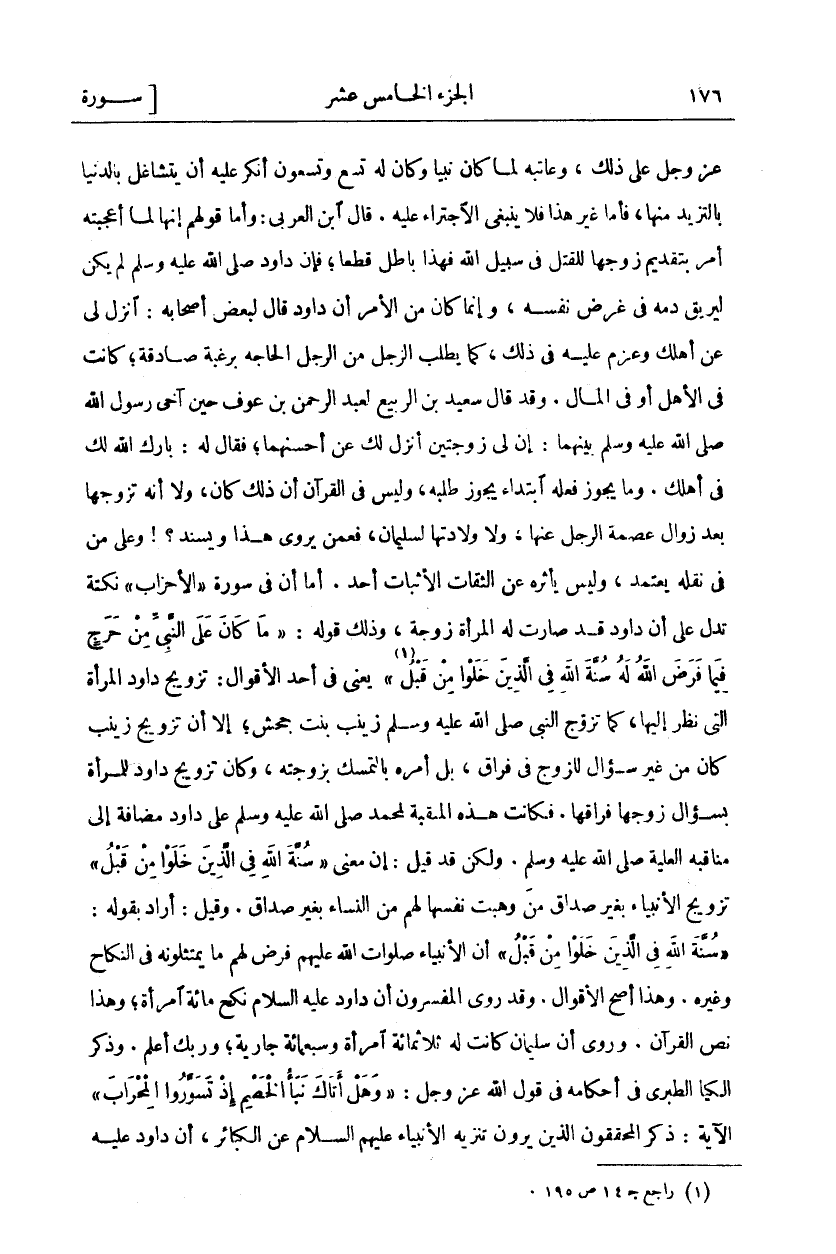 عَزَّ وَجَلَّ عَلَى ذَلِكَ، وَعَاتَبَهُ لَمَّا كَانَ نَبِيًّا وَكَانَ لَهُ تِسْعٌ وَتِسْعُونَ أَنْكَرَ عَلَيْهِ أَنْ يَتَشَاغَلَ بِالدُّنْيَا بِالتَّزَيُّدِ مِنْهَا، فَأَمَّا غَيْرُ هَذَا فَلَا يَنْبَغِي الِاجْتِرَاءُ عَلَيْهِ. قَالَ ابْنُ الْعَرَبِيِّ: وَأَمَّا قَوْلُهُمْ إِنَّهَا لَمَّا أَعْجَبَتْهُ أَمَرَ بِتَقْدِيمِ زَوْجِهَا لِلْقَتْلِ فِي سَبِيلِ اللَّهِ فَهَذَا بَاطِلٌ قَطْعًا، فَإِنَّ دَاوُدَ صَلَّى اللَّهُ عَلَيْهِ وَسَلَّمَ لَمْ يَكُنْ لِيُرِيقَ دَمَهُ فِي غَرَضِ نَفْسِهِ، وَإِنَّمَا كَانَ مِنَ الْأَمْرِ أَنَّ دَاوُدَ قَالَ لِبَعْضِ أَصْحَابِهِ: انْزِلْ لِي عَنْ أَهْلِكَ وَعَزَمَ عَلَيْهِ فِي ذَلِكَ، كَمَا يَطْلُبُ الرَّجُلُ مِنَ الرَّجُلِ الْحَاجَةَ بِرَغْبَةٍ صَادِقَةٍ، كَانَتْ فِي الأهل أو في المال. وقد قال سعيد بْنُ الرَّبِيعِ لِعَبْدِ الرَّحْمَنِ بْنِ عَوْفٍ حِينَ آخَى رَسُولُ اللَّهِ صَلَّى اللَّهُ عَلَيْهِ وَسَلَّمَ بَيْنَهُمَا: إِنَّ لِي زَوْجَتَيْنِ أَنْزِلُ لَكَ عَنْ أَحْسَنِهِمَا، فَقَالَ لَهُ: بَارَكَ اللَّهُ لَكَ فِي أَهْلِكَ. وَمَا يَجُوزُ فِعْلُهُ ابْتِدَاءً يَجُوزُ طَلَبُهُ، وَلَيْسَ فِي الْقُرْآنِ أَنَّ ذَلِكَ كَانَ، وَلَا أَنَّهُ تَزَوَّجَهَا بَعْدَ زَوَالِ عِصْمَةِ الرَّجُلِ عَنْهَا، وَلَا وِلَادَتُهَا لِسُلَيْمَانَ، فَعَمَّنْ يُرْوَى هَذَا وَيُسْنَدُ؟! وَعَلَى مَنْ فِي نَقْلِهِ يُعْتَمَدُ، وَلَيْسَ يَأْثُرُهُ عَنِ الثِّقَاتِ الْأَثْبَاتِ أَحَدٌ. أَمَّا أَنَّ فِي سُورَةِ" الْأَحْزَابِ" نُكْتَةً تَدُلُّ عَلَى أَنَّ دَاوُدَ قَدْ صَارَتْ لَهُ الْمَرْأَةُ زَوْجَةً، وَذَلِكَ قَوْلُهُ:" مَا كانَ عَلَى النَّبِيِّ مِنْ حَرَجٍ فِيما فَرَضَ اللَّهُ لَهُ سُنَّةَ اللَّهِ فِي الَّذِينَ خَلَوْا مِنْ قَبْلُ" [الأحزاب: ٣٨] يَعْنِي فِي أَحَدِ الْأَقْوَالِ: تَزْوِيجُ دَاوُدَ الْمَرْأَةَ الَّتِي نَظَرَ إِلَيْهَا، كَمَا تَزَوَّجَ النَّبِيُّ صَلَّى اللَّهُ عَلَيْهِ وَسَلَّمَ زَيْنَبَ بِنْتَ جَحْشٍ، إِلَّا أَنَّ تَزْوِيجَ زَيْنَبَ كَانَ مِنْ غَيْرِ سُؤَالِ الزَّوْجِ فِي فِرَاقٍ، بَلْ أَمَرَهُ بِالتَّمَسُّكِ بِزَوْجَتِهِ، وَكَانَ تَزْوِيجُ دَاوُدَ لِلْمَرْأَةِ بِسُؤَالِ زَوْجِهَا فِرَاقَهَا. فَكَانَتْ، هَذِهِ الْمَنْقَبَةُ لِمُحَمَّدٍ صَلَّى اللَّهُ عَلَيْهِ وَسَلَّمَ عَلَى دَاوُدَ مُضَافَةً إِلَى مَنَاقِبِهِ الْعَلِيَّةِ صَلَّى اللَّهُ عَلَيْهِ وَسَلَّمَ. وَلَكِنْ قَدْ قِيلَ: إِنَّ مَعْنَى" سُنَّةَ اللَّهِ فِي الَّذِينَ خَلَوْا مِنْ قَبْلُ" تَزْوِيجُ الْأَنْبِيَاءِ بِغَيْرِ صَدَاقٍ مَنْ وَهَبَتْ نَفْسَهَا لَهُمْ مِنَ النِّسَاءِ بِغَيْرِ صَدَاقٍ. وَقِيلَ: أَرَادَ بِقَوْلِهِ:" سُنَّةَ اللَّهِ فِي الَّذِينَ خَلَوْا مِنْ قَبْلُ" [الأحزاب: ٣٨] أَنَّ الْأَنْبِيَاءَ صَلَوَاتُ اللَّهِ عَلَيْهِمْ فُرِضَ لَهُمْ مَا يَمْتَثِلُونَهُ فِي النِّكَاحِ وَغَيْرِهِ. وَهَذَا أَصَحُّ الْأَقْوَالِ. وَقَدْ رَوَى الْمُفَسِّرُونَ أَنَّ دَاوُدَ عَلَيْهِ السَّلَامُ نَكَحَ مِائَةَ امْرَأَةٍ، وَهَذَا نَصُّ الْقُرْآنِ. وَرُوِيَ أَنَّ سُلَيْمَانَ كَانَتْ لَهُ ثَلَاثُمِائَةِ امْرَأَةٍ وَسَبْعُمِائَةِ جَارِيَةٍ، وَرَبُّكَ أَعْلَمُ. وَذَكَرَ الْكِيَا الطَّبَرِيُّ فِي أَحْكَامِهِ فِي قَوْلِ اللَّهِ عَزَّ وَجَلَّ:" وَهَلْ أَتاكَ نَبَأُ الْخَصْمِ إِذْ تَسَوَّرُوا الْمِحْرابَ" الْآيَةَ: ذَكَرَ الْمُحَقِّقُونَ الَّذِينَ يَرَوْنَ تَنْزِيهَ الْأَنْبِيَاءِ عَلَيْهِمُ السَّلَامُ عَنِ الْكَبَائِرِ، أَنَّ دَاوُدَ عَلَيْهِ
