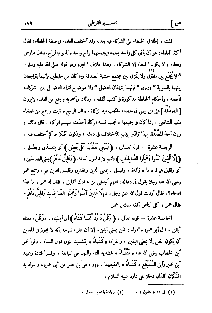 قُلْتُ: إِطْلَاقُ الْخُلَطَاءِ عَلَى الشُّرَكَاءِ فِيهِ بُعْدٌ، وَقَدِ اخْتَلَفَ الْعُلَمَاءُ فِي صِفَةِ الْخُلَطَاءِ فَقَالَ أَكْثَرُ الْعُلَمَاءِ: هُوَ أَنْ يَأْتِيَ كُلَّ وَاحِدٍ بِغَنَمِهِ فَيَجْمَعَهُمَا رَاعٍ وَاحِدٌ وَالدَّلْوُ وَالْمَرَاحُ. وَقَالَ طَاوُسٌ وَعَطَاءٌ: لَا يَكُونُ الْخُلَطَاءُ إِلَّا الشُّرَكَاءَ. وهذا خلاف الخبر، وهو قول صَلَّى اللَّهُ عَلَيْهِ وَسَلَّمَ:" لَا يُجْمَعُ بَيْنَ مُفْتَرِقٍ وَلَا يُفَرَّقُ بَيْنَ مُجْتَمِعٍ خَشْيَةَ الصَّدَقَةِ وما كان من خليطين فإنهما يتراجحان بَيْنَهُمَا بِالسَّوِيَّةِ" وَرُوِيَ" فَإِنَّهُمَا يَتَرَادَّانِ الْفَضْلَ" وَلَا مَوْضِعَ لِتَرَادِّ الْفَضْلِ بَيْنَ الشُّرَكَاءِ، فَاعْلَمْهُ. وَأَحْكَامُ الْخُلْطَةِ مَذْكُورَةٌ فِي كُتُبِ الْفِقْهِ. وَمَالِكٌ وَأَصْحَابُهُ وَجَمْعٌ مِنَ الْعُلَمَاءِ لَا يَرَوْنَ" الصَّدَقَةَ" «١» عَلَى مَنْ لَيْسَ فِي حِصَّتِهِ مَا تَجِبُ فِيهِ الزَّكَاةُ. وَقَالَ الرَّبِيعُ وَاللَّيْثُ وَجَمْعٌ مِنَ الْعُلَمَاءِ مِنْهُمُ الشَّافِعِيُّ: إِذَا كَانَ فِي جَمِيعِهَا مَا تَجِبُ فِيهِ الزَّكَاةُ أُخِذَتْ مِنْهُمُ الزَّكَاةُ. قَالَ مَالِكٌ: وَإِنْ أَخَذَ الْمُصَّدِّقُ بِهَذَا تَرَادَّوْا بَيْنَهُمْ لِلِاخْتِلَافِ فِي ذَلِكَ، وَتَكُونُ كَحُكْمِ حَاكِمٍ اخْتُلِفَ فِيهِ. الرَّابِعَةَ عَشْرَةَ- قَوْلُهُ تَعَالَى:" لَيَبْغِي بَعْضُهُمْ عَلى بَعْضٍ" أَيْ يَتَعَدَّى وَيَظْلِمُ." إِلَّا الَّذِينَ آمَنُوا وَعَمِلُوا الصَّالِحاتِ" فَإِنَّهُمْ لَا يَظْلِمُونَ أَحَدًا." وَقَلِيلٌ مَا هُمْ" يَعْنِي الصَّالِحِينَ، أَيْ وَقَلِيلٌ هُمْ فَ" مَا" زَائِدَةٌ. وَقِيلَ: بِمَعْنَى الَّذِينَ وَتَقْدِيرُهُ وَقَلِيلٌ الَّذِينَ هُمْ. وَسَمِعَ عُمَرُ رَضِيَ اللَّهُ عَنْهُ رَجُلًا يَقُولُ فِي دُعَائِهِ: اللَّهُمَّ اجْعَلْنِي مِنْ عِبَادِكَ الْقَلِيلِ. فَقَالَ لَهُ عُمَرُ: مَا هَذَا الدُّعَاءُ. فَقَالَ أَرَدْتُ قَوْلَ اللَّهِ عَزَّ وَجَلَّ:" إِلَّا الَّذِينَ آمَنُوا وَعَمِلُوا الصَّالِحاتِ وَقَلِيلٌ مَا هُمْ" فَقَالَ عُمَرُ: كُلُّ النَّاسِ أَفْقَهُ مِنْكَ يَا عُمَرُ الْخَامِسَةَ عَشْرَةَ- قَوْلُهُ تَعَالَى:" وَظَنَّ داوُدُ أَنَّما فَتَنَّاهُ" أَيِ ابْتَلَيْنَاهُ." وَظَنَّ" مَعْنَاهُ أَيْقَنَ. قَالَ أَبُو عَمْرٍو وَالْفَرَّاءُ: ظَنَّ بِمَعْنَى أَيْقَنَ، إِلَّا أَنَّ الْفَرَّاءَ شَرَحَهُ بِأَنَّهُ لَا يَجُوزُ فِي الْمُعَايَنِ أَنْ يَكُونَ الظَّنُّ إِلَّا بِمَعْنَى الْيَقِينِ. وَالْقِرَاءَةُ" فَتَنَّاهُ" بِتَشْدِيدِ النُّونِ دُونَ التَّاءِ. وَقَرَأَ عُمَرُ بْنُ الْخَطَّابِ رَضِيَ اللَّهُ عَنْهُ" فَتَّنَّاهُ" بِتَشْدِيدِ التَّاءِ وَالنُّونِ على المبالغة. وقرا قتادة وعبيد ابن عُمَيْرٍ وَابْنُ السَّمَيْقَعِ" فَتَنَاهُ" بِتَخْفِيفِهِمَا. وَرَوَاهُ عَلِيُّ بْنُ نَصْرٍ عَنْ أَبِي عَمْرٍو، وَالْمُرَادُ بِهِ الْمَلَكَانِ اللَّذَانِ دَخَلَا عَلَى دَاوُدَ عَلَيْهِ السَّلَامُ.
