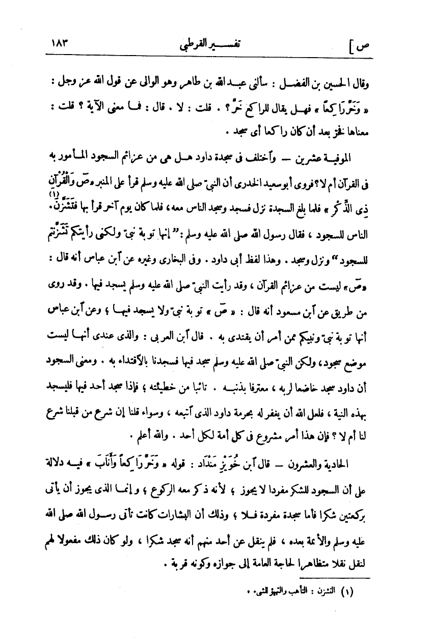 وقال الحسين بْنُ الْفَضْلِ: سَأَلَنِي عَبْدُ اللَّهِ بْنُ طَاهِرٍ وهو ألو الي عَنْ قَوْلِ اللَّهِ عَزَّ وَجَلَّ:" وَخَرَّ راكِعاً" فَهَلْ يُقَالُ لِلرَّاكِعِ خَرَّ؟. قُلْتُ: لَا. قَالَ: فَمَا مَعْنَى الْآيَةِ؟ قُلْتُ: مَعْنَاهَا فَخَرَّ بَعْدَ أَنْ كَانَ رَاكِعًا أَيْ سَجَدَ. الْمُوَفِّيَةُ عِشْرِينَ- وَاخْتُلِفَ فِي سَجْدَةِ دَاوُدَ هَلْ هِيَ مِنْ عَزَائِمِ السُّجُودِ الْمَأْمُورِ بِهِ فِي الْقُرْآنِ أَمْ لَا؟ فَرَوَى أَبُو سَعِيدٍ الْخُدْرِيُّ أَنَّ النَّبِيَّ صَلَّى اللَّهُ عَلَيْهِ وَسَلَّمَ قَرَأَ عَلَى الْمِنْبَرِ:" ص وَالْقُرْآنِ ذِي الذِّكْرِ" فَلَمَّا بَلَغَ السَّجْدَةَ نَزَلَ فَسَجَدَ وَسَجَدَ النَّاسُ مَعَهُ، فَلَمَّا كَانَ يَوْمٌ آخَرَ قَرَأَ بِهَا فَتَشَزَّنَ «١» النَّاسُ لِلسُّجُودِ، فَقَالَ رَسُولُ اللَّهِ صَلَّى اللَّهُ عَلَيْهِ وَسَلَّمَ:" إِنَّهَا تَوْبَةُ نَبِيٍّ وَلَكِنِّي رَأَيْتُكُمْ تَشَزَّنْتُمْ لِلسُّجُودِ" وَنَزَلَ وَسَجَدَ. وَهَذَا لَفْظُ أَبِي دَاوُدَ. وَفِيَّ الْبُخَارِيِّ وَغَيْرِهِ عَنِ ابْنِ عَبَّاسٍ أَنَّهُ قَالَ:" ص" لَيْسَتْ مِنْ عَزَائِمِ الْقُرْآنِ، وَقَدْ رَأَيْتُ النَّبِيَّ صَلَّى اللَّهُ عَلَيْهِ وَسَلَّمَ يَسْجُدُ فِيهَا. وَقَدْ رُوِيَ مِنْ طَرِيقٍ عَنِ ابْنِ مَسْعُودٍ أَنَّهُ قَالَ:" ص" تَوْبَةُ نَبِيٍّ وَلَا يُسْجَدُ فِيهَا، وَعَنِ ابْنِ عَبَّاسٍ أَنَّهَا تَوْبَةُ نَبِيِّ وَنَبِيُّكُمْ مِمَّنْ أُمِرَ أَنْ يَقْتَدِيَ بِهِ. قَالَ ابْنُ الْعَرَبِيِّ: وَالَّذِي عِنْدِي أَنَّهَا لَيْسَتْ مَوْضِعَ سُجُودٍ، وَلَكِنَّ النَّبِيَّ صَلَّى اللَّهُ عَلَيْهِ وَسَلَّمَ سَجَدَ فِيهَا فَسَجَدْنَا بِالِاقْتِدَاءِ بِهِ. وَمَعْنَى السُّجُودِ أَنَّ دَاوُدَ سَجَدَ خَاضِعًا لِرَبِّهِ، مُعْتَرِفًا بِذَنْبِهِ. تَائِبًا مِنْ خَطِيئَتِهِ، فَإِذَا سَجَدَ أَحَدٌ فِيهَا فَلْيَسْجُدْ بِهَذِهِ النِّيَّةِ، فَلَعَلَّ اللَّهَ أَنْ يَغْفِرَ لَهُ بِحُرْمَةِ دَاوُدَ الَّذِي اتَّبَعَهُ، وَسَوَاءٌ قُلْنَا إِنَّ شَرْعَ مَنْ قَبْلَنَا شَرْعٌ لَنَا أَمْ لَا؟ فَإِنَّ هَذَا أَمْرٌ مَشْرُوعٌ فِي كُلِّ أُمَّةٍ لِكُلِّ أَحَدٍ. وَاللَّهُ أَعْلَمُ. الْحَادِيَةُ وَالْعِشْرُونَ- قَالَ ابْنُ خُوَيْزِ مَنْدَادَ: قَوْلُهُ:" وَخَرَّ راكِعاً وَأَنابَ" فِيهِ دَلَالَةٌ عَلَى، أَنَّ السُّجُودَ لِلشُّكْرِ مُفْرَدًا لَا يَجُوزُ، لِأَنَّهُ ذَكَرَ مَعَهُ الرُّكُوعَ، وَإِنَّمَا الَّذِي يَجُوزُ أَنْ يَأْتِيَ بِرَكْعَتَيْنِ شُكْرًا فَأَمَّا سَجْدَةٌ مُفْرَدَةٌ فَلَا، وَذَلِكَ أَنَّ الْبِشَارَاتِ كَانَتْ تَأْتِي رَسُولَ اللَّهِ صَلَّى اللَّهُ عَلَيْهِ وَسَلَّمَ وَالْأَئِمَّةَ بَعْدَهُ، فَلَمْ يُنْقَلْ عَنْ أَحَدٍ مِنْهُمْ أَنَّهُ سَجَدَ شُكْرًا، وَلَوْ كَانَ ذَلِكَ مَفْعُولًا لَهُمْ لَنُقِلَ نَقْلًا مُتَظَاهِرًا لِحَاجَةِ الْعَامَّةِ إلى جوازه وكونه قربة.
