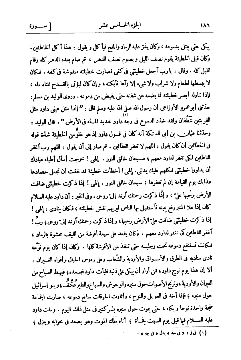 يَبْكِي حَتَّى يَبْتَلَّ بِدُمُوعِهِ، وَكَانَ يَذُرُّ عَلَيْهِ الرَّمَادَ وَالْمِلْحَ فَيَأْكُلُ وَيَقُولُ: هَذَا أَكْلُ الْخَاطِئِينَ. وكان قبل الخطيئة يقوم نصف أليل وَيَصُومُ نِصْفَ الدَّهْرِ. ثُمَّ صَامَ بَعْدَهُ الدَّهْرَ كُلَّهُ وَقَامَ اللَّيْلَ كُلَّهُ، وَقَالَ: يَا رَبِّ اجْعَلْ خَطِيئَتِي فِي كَفِّي فَصَارَتْ خَطِيئَتُهُ مَنْقُوشَةً فِي كَفِّهِ. فَكَانَ لَا يَبْسُطُهَا لِطَعَامٍ وَلَا شراب ولا شي إلا رءاها فَأَبْكَتْهُ، وَإِنْ كَانَ لَيُؤْتَى بِالْقَدَحِ ثُلُثَاهُ مَاءٌ، فَإِذَا تَنَاوَلَهُ أَبْصَرَ خَطِيئَتَهُ فَمَا يَضَعُهُ عَنْ شَفَتِهِ حَتَّى يُفِيضَ مِنْ دُمُوعِهِ. وَرَوَى الْوَلِيدُ بْنُ مُسْلِمٍ: حَدَّثَنِي أَبُو عَمْرٍو الْأَوْزَاعِيُّ أَنَّ رسول الله صَلَّى اللَّهُ عَلَيْهِ وَسَلَّمَ قال:" إِنَّمَا مَثَلُ عَيْنَيْ دَاوُدَ مَثَلُ الْقِرْبَتَيْنِ تَنْطِفَانِ وَلَقَدْ خَدَّدَ الدُّمُوعُ فِي وَجْهِ دَاوُدَ خَدِيدَ الْمَاءِ فِي الْأَرْضِ" قَالَ الْوَلِيدُ: وَحَدَّثَنَا عُثْمَانُ بن ابن الْعَاتِكَةِ أَنَّهُ كَانَ فِي قَوْلِ دَاوُدَ. إِذْ هُوَ خُلُوٌّ مِنَ الْخَطِيئَةِ شِدَّةَ قَوْلِهِ فِي الْخَطَّائِينَ إِنْ كَانَ يَقُولُ: اللَّهُمَّ لَا تَغْفِرْ لِلْخَطَّائِينَ. ثُمَّ صَارَ إِلَى أَنْ يَقُولَ: اللَّهُمَّ رَبِّ اغْفِرْ لِلْخَاطِئِينَ لِكَيْ تَغْفِرَ لِدَاوُدَ مَعَهُمْ، سُبْحَانَ خَالِقِ النُّورِ. إِلَهِي خَرَجْتُ أَسْأَلُ أَطِبَّاءَ عِبَادِكَ أَنْ يُدَاوُوا خَطِيئَتِي فَكُلُّهُمْ عَلَيْكَ يَدُلُّنِي. إِلَهِي أَخْطَأْتُ خَطِيئَةً قَدْ خِفْتُ أَنْ تَجْعَلَ حَصَادَهَا عَذَابَكَ يَوْمَ الْقِيَامَةِ إِنْ لَمْ تَغْفِرْهَا، سُبْحَانَ خَالِقِ النُّورِ. إِلَهِي إِذَا ذَكَرْتُ خَطِيئَتِي ضَاقَتِ الْأَرْضُ بِرَحْبِهَا عَلَيَّ، وَإِذَا ذَكَرْتُ رَحْمَتَكَ ارْتَدَّ إِلَيَّ رُوحِي. وَفِي الْخَبَرِ: أَنَّ دَاوُدَ عَلَيْهِ السَّلَامُ كَانَ إِذَا عَلَا الْمِنْبَرَ رَفَعَ يَمِينَهُ فَاسْتَقْبَلَ بِهَا النَّاسَ لِيُرِيَهُمْ نَقْشَ خَطِيئَتِهِ، فَكَانَ يُنَادِي: إِلَهِي! إِذَا ذَكَرْتُ خَطِيئَتِي ضَاقَتْ عَلَيَّ الْأَرْضُ بِرَحْبِهَا، وَإِذَا ذَكَرْتُ رَحْمَتَكَ ارْتَدَّ إِلَيَّ رُوحِي، رَبِّ! اغْفِرْ لِلْخَاطِئِينَ كَيْ تَغْفِرَ لِدَاوُدَ مَعَهُمْ. وَكَانَ يَقْعُدُ عَلَى سَبْعَةِ أَفْرِشَةٍ مِنَ اللِّيفِ مَحْشُوَّةٍ بِالرَّمَادِ، فَكَانَتْ تَسْتَنْقِعُ دُمُوعُهُ تَحْتَ رِجْلَيْهِ حَتَّى تَنْفُذَ مِنَ الْأَفْرِشَةِ كُلِّهَا. وَكَانَ إِذَا كَانَ يَوْمُ نَوْحِهِ نَادَى مُنَادِيهِ فِي الطُّرُقِ وَالْأَسْوَاقِ وَالْأَوْدِيَةِ وَالشِّعَابِ وَعَلَى رُءُوسِ الْجِبَالِ وَأَفْوَاهِ الْغِيرَانِ: أَلَا إِنَّ هَذَا يَوْمُ نَوْحِ دَاوُدَ، فَمَنْ أَرَادَ أَنْ يَبْكِيَ عَلَى ذَنْبِهِ فَلْيَأْتِ دَاوُدَ فَيُسْعِدَهُ، فَيَهْبِطُ السُّيَّاحُ مِنَ الْغِيرَانِ وَالْأَوْدِيَةِ
