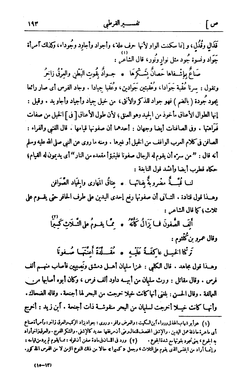 وَتَقُولُ: سِرْنَا عُقْبَةَ جَوَادًا، وَعُقْبَتَيْنِ جَوَادَيْنِ، وَعُقَبًا جِيَادًا. وَجَادَ الْفَرَسُ أَيْ صَارَ رَائِعًا يَجُودُ جُودَةً" بِالضَّمِّ" فَهُوَ جَوَادٌ لِلذَّكَرِ وَالْأُنْثَى، مِنْ خَيْلٍ جِيَادٍ وَأَجْيَادَ وَأَجَاوِيدَ. وَقِيلَ: إِنَّهَا الطِّوَالُ الْأَعْنَاقِ مَأْخُوذٌ مِنَ الْجِيدِ وَهُوَ الْعُنُقُ، لِأَنَّ طُولَ الْأَعْنَاقِ" فِي" الْخَيْلِ مِنْ صِفَاتِ فَرَاهَتِهَا. وَفِي الصَّافِناتُ أَيْضًا وَجْهَانِ: أَحَدُهُمَا أَنَّ صُفُونَهَا قِيَامُهَا. قَالَ الْقُتَبِيُّ وَالْفَرَّاءُ: الصَّافِنُ فِي كَلَامِ الْعَرَبِ الْوَاقِفُ مِنَ الْخَيْلِ أَوْ غَيْرِهَا. وَمِنْهُ مَا رُوِيَ عَنِ النَّبِيِّ صَلَّى اللَّهُ عَلَيْهِ وَسَلَّمَ أَنَّهُ قَالَ:" مَنْ سَرَّهُ أَنْ يَقُومَ لَهُ الرِّجَالُ صُفُونًا فَلْيَتَبَوَّأْ مَقْعَدَهُ مِنَ النَّارِ" أَيْ يُدِيمُونَ لَهُ الْقِيَامَ، حَكَاهُ قُطْرُبٌ أَيْضًا وَأَنْشَدَ قَوْلَ النَّابِغَةِ