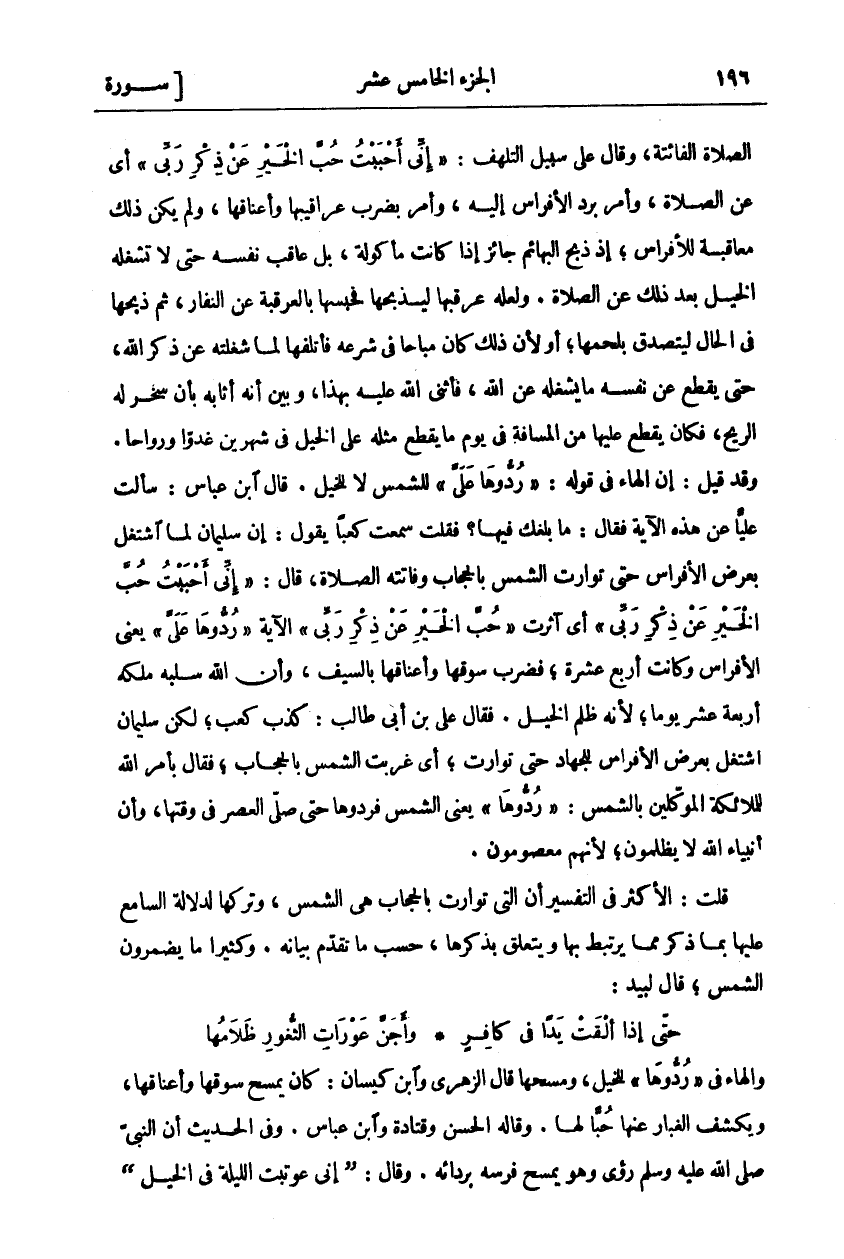 الصَّلَاةَ الْفَائِتَةَ، وَقَالَ عَلَى سَبِيلِ التَّلَهُّفِ:" إِنِّي أَحْبَبْتُ حُبَّ الْخَيْرِ عَنْ ذِكْرِ رَبِّي" أَيْ عَنِ الصَّلَاةِ، وَأَمَرَ بِرَدِّ الْأَفْرَاسِ إِلَيْهِ، وَأَمَرَ بِضَرْبِ عَرَاقِيبِهَا وَأَعْنَاقِهَا، وَلَمْ يَكُنْ ذَلِكَ مُعَاقَبَةً لِلْأَفْرَاسِ، إِذْ ذَبْحُ الْبَهَائِمِ جَائِزٌ إِذَا كَانَتْ مَأْكُولَةً، بَلْ عَاقَبَ نَفْسَهُ حَتَّى لَا تَشْغَلَهُ الْخَيْلُ بَعْدَ ذَلِكَ عَنِ الصَّلَاةِ. وَلَعَلَّهُ عَرْقَبَهَا لِيَذْبَحَهَا فَحَبَسَهَا بِالْعَرْقَبَةِ عَنِ النِّفَارِ، ثُمَّ ذَبَحَهَا فِي الْحَالِ، لِيَتَصَدَّقَ بِلَحْمِهَا، أَوْ لِأَنَّ ذَلِكَ كَانَ مُبَاحًا فِي شَرْعِهِ فَأَتْلَفَهَا لَمَّا شَغَلَتْهُ عَنْ ذِكْرِ اللَّهِ، حَتَّى يَقْطَعَ عَنْ نَفْسِهِ مَا يَشْغَلُهُ عَنِ اللَّهِ، فَأَثْنَى اللَّهُ عَلَيْهِ بِهَذَا، وَبَيَّنَ أَنَّهُ أَثَابَهُ بِأَنْ سَخَّرَ لَهُ الرِّيحَ، فَكَانَ يَقْطَعُ عَلَيْهَا مِنَ الْمَسَافَةِ فِي يَوْمٍ مَا يَقْطَعُ مِثْلُهُ عَلَى الْخَيْلِ فِي شَهْرَيْنِ غُدُوًّا وَرَوَاحًا. وَقَدْ قِيلَ: إِنَّ الْهَاءَ فِي قَوْلِهِ:" رُدُّوها عَلَيَّ" لِلشَّمْسِ لَا لِلْخَيْلِ. قَالَ ابْنُ عَبَّاسٍ: سَأَلْتُ عَلِيًّا عَنْ هَذِهِ الْآيَةِ فَقَالَ: مَا بَلَغَكَ فِيهَا؟ فَقُلْتُ سَمِعْتُ كَعْبًا يَقُولُ: إِنَّ سُلَيْمَانَ لَمَّا اشْتَغَلَ بِعَرْضِ الْأَفْرَاسِ حَتَّى تَوَارَتِ الشَّمْسُ بِالْحِجَابِ وَفَاتَتْهُ الصَّلَاةُ، قَالَ:" إِنِّي أَحْبَبْتُ حُبَّ الْخَيْرِ عَنْ ذِكْرِ رَبِّي" أَيْ آثَرْتُ" حُبَّ الْخَيْرِ عَنْ ذِكْرِ رَبِّي" الْآيَةَ" رُدُّوها عَلَيَّ" يَعْنِي الْأَفْرَاسَ وَكَانَتْ أَرْبَعَ عَشْرَةَ، فَضَرَبَ سُوقَهَا وَأَعْنَاقَهَا بِالسَّيْفِ، وَأَنَّ اللَّهَ سَلَبَهُ مُلْكَهُ أَرْبَعَةَ عَشَرَ يَوْمًا، لِأَنَّهُ ظَلَمَ الْخَيْلَ. فَقَالَ عَلِيُّ بْنُ أَبِي طَالِبٍ: كَذَبَ كَعْبٌ لَكِنَّ سُلَيْمَانُ اشْتَغَلَ بِعَرْضِ الْأَفْرَاسِ لِلْجِهَادِ حَتَّى تَوَارَتْ أَيْ غَرَبَتِ الشَّمْسُ بِالْحِجَابِ فَقَالَ بِأَمْرِ اللَّهِ لِلْمَلَائِكَةِ الْمُوَكَّلِينَ بِالشَّمْسِ:" رُدُّوها" يَعْنِي الشَّمْسَ فَرَدُّوهَا حَتَّى صَلَّى الْعَصْرَ فِي وَقْتِهَا، وَأَنَّ أَنْبِيَاءَ اللَّهِ لَا يَظْلِمُونَ لِأَنَّهُمْ مَعْصُومُونَ. قُلْتُ: الْأَكْثَرُ فِي التَّفْسِيرِ أَنَّ الَّتِي تَوَارَتْ بِالْحِجَابِ هِيَ الشَّمْسُ، وَتَرَكَهَا لِدَلَالَةِ السَّامِعِ عليها بما ذكر مما يرتبط بها ومتعلق بِذِكْرِهَا، حَسَبَ مَا تَقَدَّمَ بَيَانُهُ. وَكَثِيرًا مَا يُضْمِرُونَ الشَّمْسَ، قَالَ لَبِيَدٌ