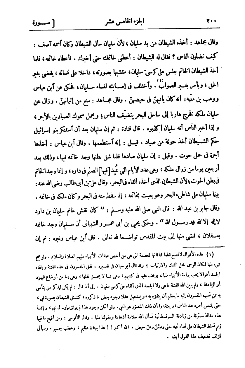 (١). هذه الأقوال لا تصح قطعا لمنافاتها للعصمة التي هي من أخص صفات الأنبياء عليهم الصلاة والسلام. ولو صح شي منها لكان الوحى محل الشك والارتياب، وقد قال أبو حيان في تفسيره: نقل المفسرون في هذه الفتنة وإلقاء الجسد أقوالا يجب براءة الأنبياء منها، يوقف عليها في كتبهم، وهى مما لا يحل نقلها، وهى إما من أوضاع اليهود أو الزنادقة، ولم يبين الله الفتنة ما هي ولا الجسد الذي ألقاه على كرسي سليمان. إلى أن قال: لم يكن ليذكر من يتأسى به ممن نسب المفسرون إليه ما يعظم أن يتفوه به، ويستحيل عقلا وجود بعض ما ذكروه، كتمثل الشيطان بصورة نبى، حتى يلتبس أمره عند الناس، ويعتقدوا أن ذلك المتصور هو النبي. ولو أمكن وجود هذا لم يوثق بإرسال نبى، وإنما هذه مقالة مسترقة من زنادقة السوفسطائية نسأل الله سلامة أذهاننا وعقولنا منها. وقال الألوسي: ومن أقبح ما فيها زعم تسلط الشيطان على نساء نبيه حتى وطئهن وهن حيض. الله أكبر!! هذا بهتان عظيم، وخطب جسيم. وسيأتي للمؤلف تضعيف هذا القول أيضا.