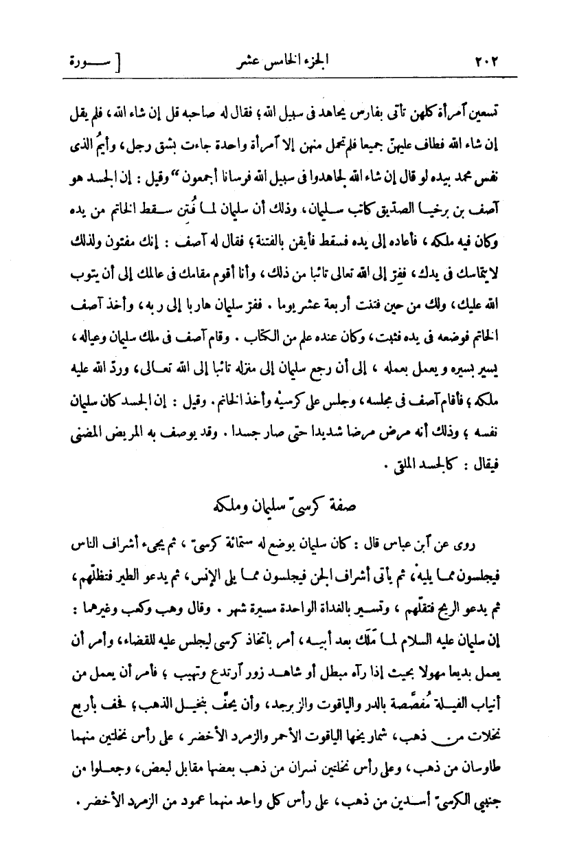 تِسْعِينَ امْرَأَةً كُلُّهُنَّ تَأْتِي بِفَارِسٍ يُجَاهِدُ فِي سَبِيلِ اللَّهِ فَقَالَ لَهُ صَاحِبُهُ قُلْ إِنْ شَاءَ اللَّهُ، فَلَمْ يَقُلْ إِنْ شَاءَ اللَّهُ فَطَافَ عَلَيْهِنَّ جَمِيعًا فَلَمْ تَحْمِلْ مِنْهُنَّ إِلَّا امْرَأَةٌ وَاحِدَةٌ جَاءَتْ بِشِقِّ رَجُلٍ، وَايْمُ الَّذِي نَفْسُ مُحَمَّدٍ بِيَدِهِ لَوْ قَالَ إِنْ شَاءَ الله لجاهد وا فِي سَبِيلِ اللَّهِ فُرْسَانًا أَجْمَعُونَ" وَقِيلَ: إِنَّ الْجَسَدَ هُوَ آصِفُ بْنُ بَرْخِيَا الصِّدِّيقُ كَاتِبُ سُلَيْمَانَ، وَذَلِكَ أَنَّ سُلَيْمَانَ لَمَّا فُتِنَ سَقَطَ الْخَاتَمُ مِنْ يَدِهِ وَكَانَ فِيهِ مُلْكُهُ، فَأَعَادَهُ إِلَى يَدِهِ فَسَقَطَ فَأَيْقَنَ بِالْفِتْنَةِ، فَقَالَ لَهُ آصِفُ: إِنَّكَ مَفْتُونٌ وَلِذَلِكَ لَا يَتَمَاسَكُ فِي يَدِكَ، فَفِرَّ إِلَى اللَّهِ تَعَالَى تَائِبًا مِنْ ذَلِكَ، وَأَنَا أَقُومُ مَقَامَكَ فِي عَالَمِكَ إِلَى أَنْ يَتُوبَ اللَّهُ عَلَيْكَ، وَلَكَ مِنْ حِينِ فُتِنْتَ أَرْبَعَةَ عَشَرَ يَوْمًا. فَفَرَّ سُلَيْمَانُ هَارِبًا إِلَى رَبِّهِ، وَأَخَذَ آصِفُ الْخَاتَمَ فَوَضَعَهُ فِي يَدِهِ فَثَبَتَ، وَكَانَ عِنْدَهُ عِلْمٌ مِنَ الْكِتَابِ. وَقَامَ آصِفُ فِي مُلْكِ سُلَيْمَانَ وَعِيَالِهِ، يَسِيرُ بِسَيْرِهِ وَيَعْمَلُ بِعَمَلِهِ، إِلَى أَنْ رَجَعَ سُلَيْمَانُ إِلَى مَنْزِلِهِ تَائِبًا إِلَى اللَّهِ تَعَالَى، وَرَدَّ اللَّهُ عَلَيْهِ مُلْكَهُ، فَأَقَامَ آصِفُ فِي مَجْلِسِهِ، وَجَلَسَ عَلَى كُرْسِيِّهِ وَأَخَذَ الْخَاتَمَ. وَقِيلَ: إِنَّ الْجَسَدَ كَانَ سُلَيْمَانَ نَفْسَهُ، وَذَلِكَ أَنَّهُ مَرِضَ مَرَضًا شَدِيدًا حَتَّى صَارَ جَسَدًا. وَقَدْ يُوصَفُ بِهِ الْمَرِيضُ الْمُضْنَى فَيُقَالُ: كَالْجَسَدِ الْمُلْقَى.