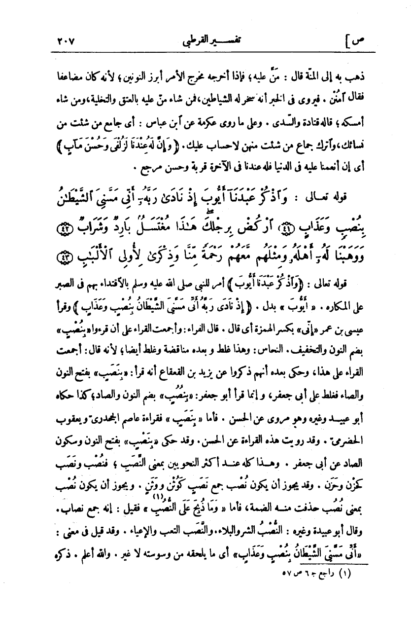 قَوْلُهُ تَعَالَى:" وَاذْكُرْ عَبْدَنا أَيُّوبَ" أَمْرٌ لِلنَّبِيِّ صَلَّى اللَّهُ عَلَيْهِ وَسَلَّمَ بِالِاقْتِدَاءِ بِهِمْ فِي الصَّبْرِ عَلَى الْمَكَارِهِ." أَيُّوبَ" بَدَلٌ." إِذْ نَادَى رَبَّهُ أَنِّي مَسَّنِيَ الشَّيْطانُ بِنُصْبٍ وَعَذابٍ" وَقَرَأَ عِيسَى بْنُ عُمَرَ" إِنِّي" بِكَسْرِ الْهَمْزَةِ أَيْ قَالَ. قَالَ الْفَرَّاءُ: وَأَجْمَعَتِ الْقُرَّاءُ عَلَى أَنْ قَرَءُوا" بِنُصْبٍ" بِضَمِّ النُّونِ وَالتَّخْفِيفِ. النَّحَّاسُ: وَهَذَا غَلَطٌ وَبَعْدَهُ مُنَاقَضَةٌ وَغَلَطٌ أَيْضًا، لِأَنَّهُ قَالَ: أَجْمَعَتِ الْقُرَّاءُ عَلَى هَذَا، وَحَكَى بَعْدَهُ أَنَّهُمْ ذَكَرُوا عَنْ يَزِيدَ بْنِ الْقَعْقَاعِ أَنَّهُ قَرَأَ:" بِنَصَبٍ" بِفَتْحِ النُّونِ وَالصَّادِ فَغَلِطَ عَلَى أَبِي جَعْفَرٍ، وَإِنَّمَا قَرَأَ أَبُو جَعْفَرٍ:" بِنُصُبٍ" بِضَمِّ النُّونِ وَالصَّادِ، كَذَا حَكَاهُ أَبُو عُبَيْدٍ وَغَيْرُهُ وَهُوَ مَرْوِيٌّ عَنِ الْحَسَنِ. فَأَمَّا" بِنَصَبٍ" فَقِرَاءَةُ عَاصِمٍ الْجَحْدَرِيِّ وَيَعْقُوبَ الْحَضْرَمِيِّ. وَقَدْ رُوِيَتْ هَذِهِ الْقِرَاءَةُ عَنِ الْحَسَنِ وَقَدْ حُكِيَ" بِنَصْبٍ" بِفَتْحِ النُّونِ وَسُكُونِ الصَّادِ عَنْ أَبِي جَعْفَرٍ. وَهَذَا كُلُّهُ عِنْدَ أَكْثَرِ النَّحْوِيِّينَ بِمَعْنَى النَّصَبِ فَنُصْبٌ وَنَصَبٌ كحزن وحزن. وقد يجوزان يكون نصب جمع نصب كو، ثن وَوَثَنٍ. وَيَجُوزُ أَنْ يَكُونَ نُصْبٌ بِمَعْنَى نُصُبٍ حُذِفَتْ مِنْهُ الضَّمَّةُ، فَأَمَّا" وَما ذُبِحَ عَلَى النُّصُبِ" [المائدة: ٣] فَقِيلَ: إِنَّهُ جَمْعُ نِصَابٍ. وَقَالَ أَبُو عُبَيْدَةَ وَغَيْرُهُ: النُّصُبُ الشَّرُّ وَالْبَلَاءُ. وَالنَّصَبُ التَّعَبُ وَالْإِعْيَاءُ. وَقَدْ قِيلَ فِي مَعْنَى:" أَنِّي مَسَّنِيَ الشَّيْطانُ بِنُصْبٍ وَعَذابٍ" أَيْ مَا يَلْحَقُهُ مِنْ وَسْوَسَتِهِ لَا غَيْرَ. وَاللَّهُ أَعْلَمُ. ذَكَرَهُ