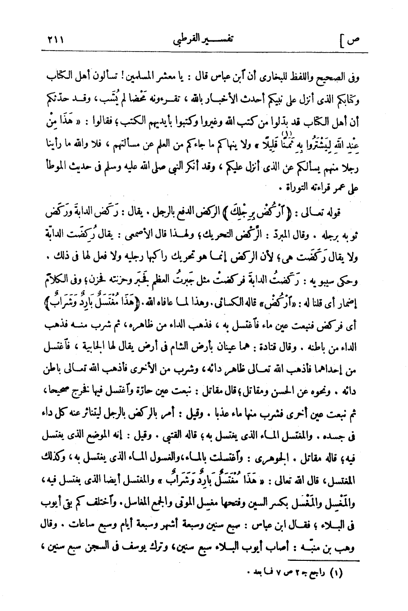 وَفِي الصَّحِيحِ وَاللَّفْظُ لِلْبُخَارِيِّ أَنَّ ابْنَ عَبَّاسٍ قَالَ: يَا مَعْشَرَ الْمُسْلِمِينَ تَسْأَلُونَ أَهْلَ الْكِتَابِ وَكِتَابُكُمُ الَّذِي أُنْزِلَ عَلَى نَبِيِّكُمْ أَحْدَثُ الْأَخْبَارِ بِاللَّهِ، تَقْرَءُونَهُ مَحْضًا لَمْ يُشَبْ، وَقَدْ حَدَّثَكُمْ أَنَّ أَهْلَ الْكِتَابِ قَدْ بَدَّلُوا مِنْ كُتُبِ اللَّهِ وَغَيَّرُوا وَكَتَبُوا بِأَيْدِيهِمُ الْكُتُبَ، فَقَالُوا:" هَذَا مِنْ عِنْدِ اللَّهِ لِيَشْتَرُوا بِهِ ثَمَناً قَلِيلًا" [البقرة: ٧٩] وَلَا يَنْهَاكُمْ مَا جَاءَكُمْ مِنَ الْعِلْمِ عَنْ مَسْأَلَتِهِمْ، فَلَا وَاللَّهِ مَا رَأَيْنَا رَجُلًا مِنْهُمْ يَسْأَلُكُمْ عَنِ الَّذِي أُنْزِلَ عَلَيْكُمْ، وَقَدْ أَنْكَرَ النَّبِيِّ صَلَّى اللَّهُ عَلَيْهِ وَسَلَّمَ فِي حَدِيثِ الْمُوَطَّأِ عَلَى عُمَرَ قِرَاءَتَهُ التَّوْرَاةَ. قَوْلُهُ تَعَالَى:" ارْكُضْ بِرِجْلِكَ" الرَّكْضُ الدَّفْعُ بِالرِّجْلِ. يُقَالُ: رَكَضَ الدَّابَّةَ وَرَكَضَ ثَوْبَهُ بِرِجْلِهِ. وَقَالَ الْمُبَرِّدُ: الرَّكْضُ التَّحْرِيكُ، وَلِهَذَا قَالَ الْأَصْمَعِيُّ: يُقَالُ رَكَضْتُ الدَّابَّةَ وَلَا يُقَالُ رَكَضَتْ هِيَ، لِأَنَّ الرَّكْضَ إِنَّمَا هُوَ تَحْرِيكُ رَاكِبِهَا رِجْلَيْهِ وَلَا فِعْلَ لَهَا فِي ذَلِكَ. وَحَكَى سِيبَوَيْهِ: رَكَضْتُ الدَّابَّةَ فَرَكَضَتْ مِثْلَ جَبَرْتُ الْعَظْمَ فَجَبَرَ وَحَزَنْتَهُ فَحَزِنَ، وَفِي الْكَلَامِ إِضْمَارٌ أَيْ قُلْنَا لَهُ:" ارْكُضْ" قَالَ الْكِسَائِيُّ. وَهَذَا لَمَّا عَافَاهُ اللَّهُ." هَذَا مُغْتَسَلٌ بارِدٌ وَشَرابٌ" أَيْ فَرَكَضَ فَنَبَعَتْ عَيْنُ مَاءٍ فَاغْتَسَلَ بِهِ، فَذَهَبَ الدَّاءُ مِنْ ظَاهِرِهِ، ثُمَّ شَرِبَ مِنْهُ فَذَهَبَ الدَّاءُ مِنْ بَاطِنِهِ. وَقَالَ قَتَادَةُ: هُمَا عَيْنَانِ بِأَرْضِ الشَّامِ فِي أَرْضٍ يُقَالُ لَهَا الْجَابِيَةُ، فَاغْتَسَلَ مِنْ إِحْدَاهُمَا فَأَذْهَبَ اللَّهُ تَعَالَى ظَاهِرَ دَائِهِ، وَشَرِبَ مِنَ الْأُخْرَى فَأَذْهَبَ اللَّهُ تَعَالَى بَاطِنَ دَائِهِ. وَنَحْوَهُ عَنِ الْحَسَنِ وَمُقَاتِلٍ، قَالَ مُقَاتِلٌ: نَبَعَتْ عَيْنٌ حَارَّةٌ واغتسل فيها فحرج صَحِيحًا ثُمَّ نَبَعَتْ عَيْنٌ أُخْرَى فَشَرِبَ مِنْهَا مَاءً عَذْبًا. وَقِيلَ: أُمِرَ بِالرَّكْضِ بِالرِّجْلِ لِيَتَنَاثَرَ عَنْهُ كُلُّ دَاءٍ فِي جَسَدِهِ. وَالْمُغْتَسَلُ الْمَاءُ الَّذِي يُغْتَسَلُ بِهِ، قَالَ الْقُتَبِيُّ. وَقِيلَ: إِنَّهُ الْمَوْضِعُ الَّذِي يُغْتَسَلُ فِيهِ، قَالَ مُقَاتِلٌ. الْجَوْهَرِيُّ: وَاغْتَسَلْتُ بِالْمَاءِ، وَالْغَسُولُ الْمَاءُ الَّذِي يُغْتَسَلُ بِهِ، وَكَذَلِكَ الْمُغْتَسَلُ، قَالَ اللَّهُ تَعَالَى:" هَذَا مُغْتَسَلٌ بارِدٌ وَشَرابٌ" وَالْمُغْتَسَلُ أَيْضًا الَّذِي يُغْتَسَلُ فِيهِ، وَالْمَغْسِلُ وَالْمَغْسَلُ بِكَسْرِ السِّينِ وَفَتْحِهَا مَغْسَلُ الْمَوْتَى وَالْجَمْعُ الْمَغَاسِلُ