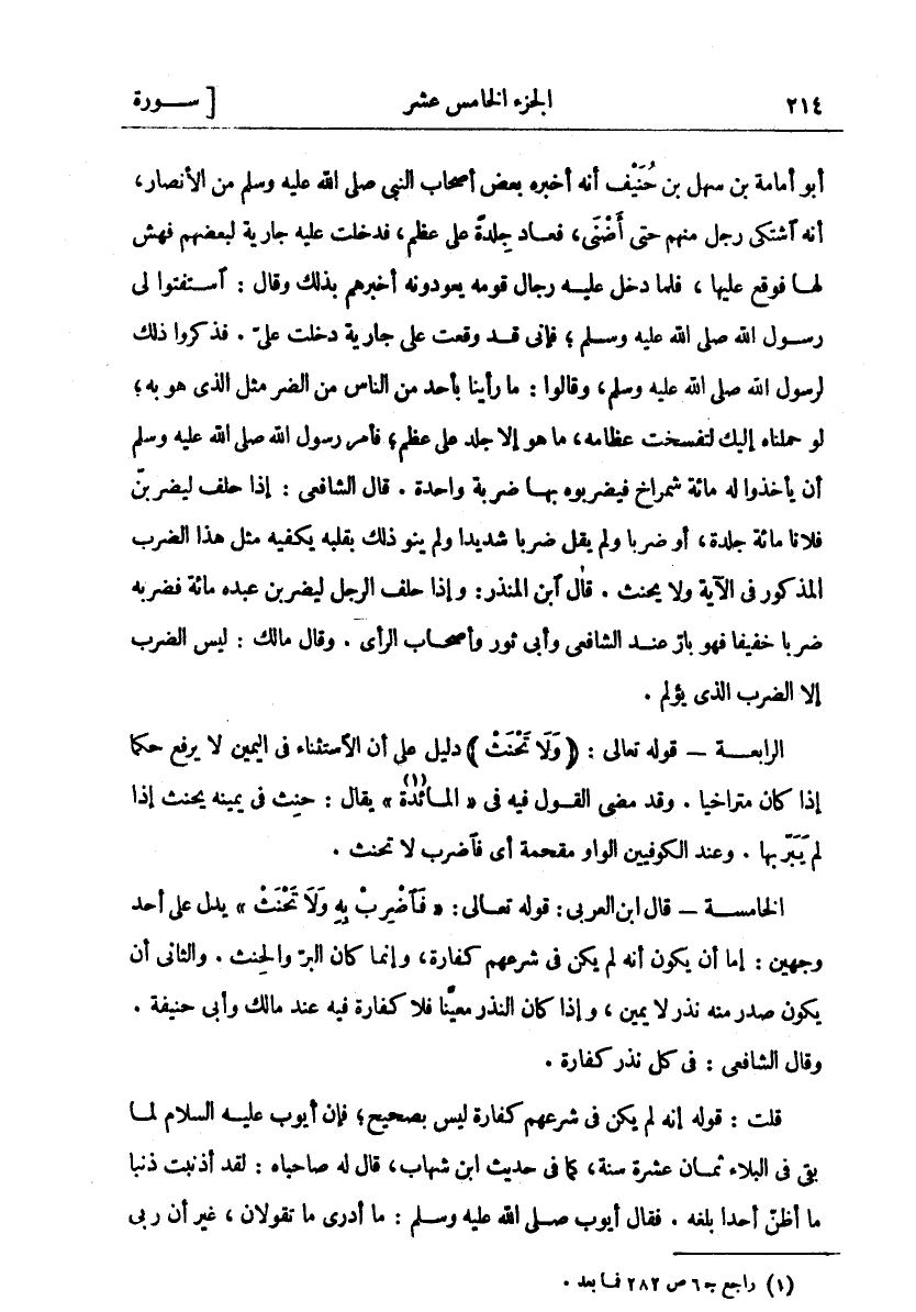 أَبُو أُمَامَةَ بْنُ سَهْلِ بْنِ حُنَيْفٍ أَنَّهُ أَخْبَرَهُ بَعْضُ أَصْحَابِ النَّبِيِّ صَلَّى اللَّهُ عَلَيْهِ وَسَلَّمَ مِنَ الْأَنْصَارِ، أَنَّهُ اشْتَكَى رَجُلٌ مِنْهُمْ حَتَّى أَضْنَى، فَعَادَ جِلْدَةً عَلَى عَظْمٍ، فَدَخَلَتْ عَلَيْهِ جَارِيَةٌ لِبَعْضِهِمْ فَهَشَّ لَهَا فَوَقَعَ عَلَيْهَا، فَلَمَّا دَخَلَ عَلَيْهِ رِجَالُ قَوْمِهِ يَعُودُونَهُ أَخْبَرَهُمْ بِذَلِكَ وَقَالَ: اسْتَفْتُوا لِي رَسُولُ اللَّهِ صَلَّى اللَّهُ عَلَيْهِ وَسَلَّمَ، فَإِنِّي قَدْ وَقَعْتُ عَلَى جَارِيَةٍ دَخَلَتْ عَلَيَّ. فَذَكَرُوا ذَلِكَ لِرَسُولِ اللَّهِ صَلَّى اللَّهُ عَلَيْهِ وَسَلَّمَ، وَقَالُوا: مَا رَأَيْنَا بِأَحَدٍ مِنَ النَّاسِ مِنَ الضُّرِّ مِثْلَ الَّذِي هُوَ بِهِ، لَوْ حَمَلْنَاهُ إِلَيْكَ لَتَفَسَّخَتْ عِظَامُهُ، مَا هُوَ إِلَّا جِلْدٌ عَلَى عَظْمٍ، فَأَمَرَ رَسُولُ اللَّهِ صَلَّى اللَّهُ عَلَيْهِ وَسَلَّمَ أن يَأْخُذُوا لَهُ مِائَةَ شِمْرَاخٍ فَيَضْرِبُوهُ بِهَا ضَرْبَةً وَاحِدَةً. قَالَ الشَّافِعِيُّ: إِذَا حَلَفَ لَيَضْرِبَنَّ فُلَانًا مِائَةَ جَلْدَةٍ، أَوْ ضَرْبًا وَلَمْ يَقُلْ ضَرْبًا شَدِيدًا وَلَمْ يَنْوِ ذَلِكَ بِقَلْبِهِ يَكْفِيهِ مِثْلُ هَذَا الضَّرْبِ الْمَذْكُورِ فِي الْآيَةِ وَلَا يَحْنَثُ. قَالَ ابْنُ الْمُنْذِرِ: وَإِذَا حَلَفَ الرَّجُلُ لَيَضْرِبَنَّ عَبْدَهُ مِائَةً فَضَرَبَهُ ضَرْبًا خَفِيفًا فَهُوَ بَارٌّ عِنْدَ الشَّافِعِيِّ وَأَبِي ثَوْرٍ وَأَصْحَابِ الرَّأْيِ. وَقَالَ مَالِكٌ: لَيْسَ الضَّرْبُ إِلَّا الضَّرْبَ الَّذِي يُؤْلِمُ. الرَّابِعَةُ- قَوْلُهُ تَعَالَى:" وَلا تَحْنَثْ" دَلِيلٌ عَلَى أن الاستثناء في اليمين لا يرفع حكمها إِذَا كَانَ مُتَرَاخِيًا. وَقَدْ مَضَى، الْقَوْلُ فِيهِ فِي [الْمَائِدَةِ «١»] يُقَالُ: حَنِثَ فِي يَمِينِهِ يَحْنَثُ إِذَا لَمْ يَبَرَّ بِهَا. وَعِنْدَ الْكُوفِيِّينَ الْوَاوُ مُقْحَمَةٌ أَيْ فَاضْرِبْ لَا تَحْنَثْ. الْخَامِسَةُ- قَالَ ابْنُ الْعَرَبِيِّ: قَوْلُهُ تَعَالَى:" فَاضْرِبْ بِهِ وَلا تَحْنَثْ" يَدُلُّ عَلَى أَحَدِ وَجْهَيْنِ: إِمَّا أَنْ يَكُونَ أَنَّهُ لَمْ يَكُنْ فِي شَرْعِهِمْ كَفَّارَةٌ، وَإِنَّمَا كَانَ الْبَرُّ وَالْحِنْثُ. وَالثَّانِي أَنْ يَكُونَ صَدَرَ مِنْهُ نَذْرٌ لَا يَمِينَ وَإِذَا كَانَ النَّذْرُ مُعَيَّنًا فَلَا كَفَّارَةَ فِيهِ عِنْدَ مَالِكٍ وَأَبِي حَنِيفَةَ. وَقَالَ الشَّافِعِيُّ: فِي كُلِّ نَذْرٍ كَفَّارَةٌ. قُلْتُ: قَوْلُهُ إِنَّهُ لَمْ يَكُنْ فِي شَرْعِهِمْ كَفَّارَةٌ لَيْسَ بِصَحِيحٍ، فَإِنَّ أَيُّوبَ عَلَيْهِ السَّلَامُ لَمَّا بَقِيَ فِي الْبَلَاءِ ثَمَانَ عَشْرَةَ سَنَةً، كَمَا فِي حَدِيثِ ابْنِ شِهَابٍ، قَالَ لَهُ صَاحِبَاهُ: لَقَدْ أَذْنَبْتَ ذَنْبًا مَا أَظُنُّ أَحَدًا بَلَغَهُ. فَقَالَ أَيُّوبُ صَلَّى اللَّهُ عَلَيْهِ وَسَلَّمَ: مَا أَدْرِي مَا تَقُولَانِ، غَيْرَ أَنَّ ربي
