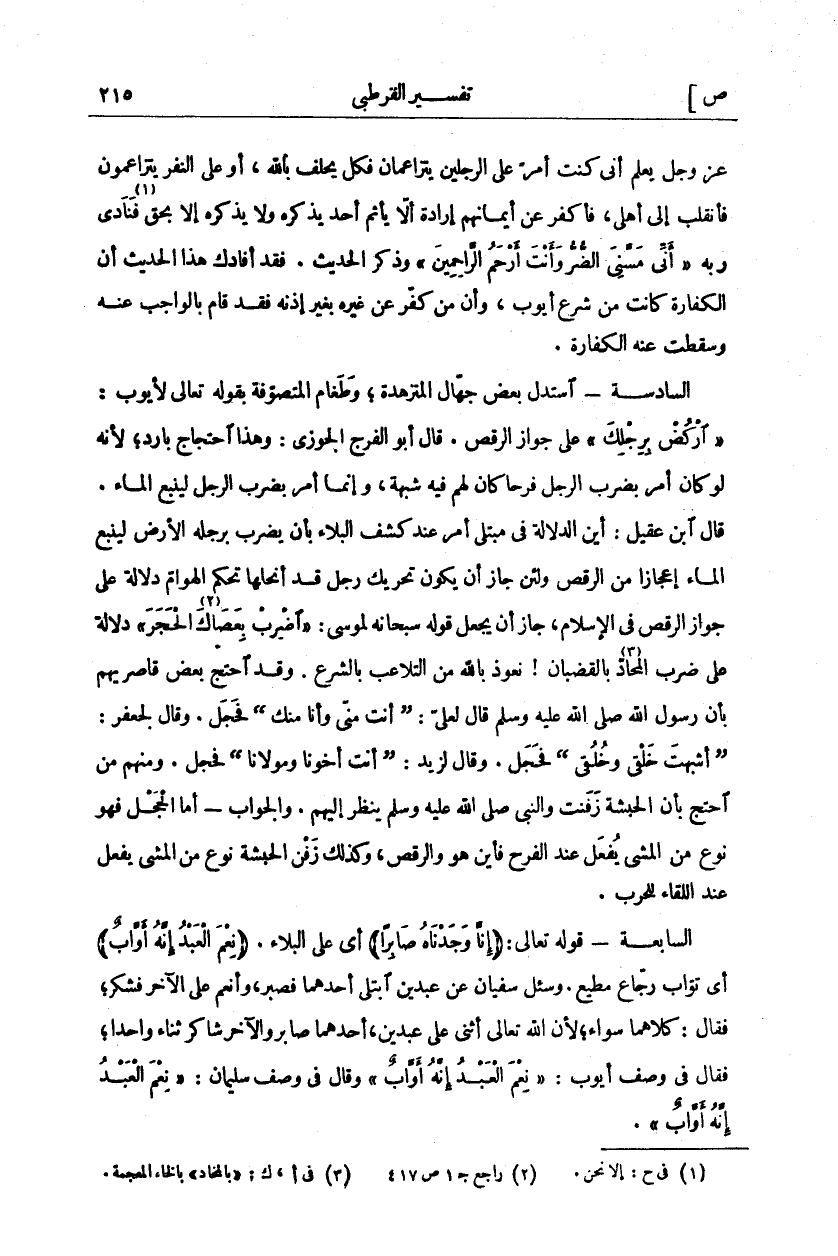 عَزَّ وَجَلَّ يَعْلَمُ أَنِّي كُنْتُ أَمُرُّ عَلَى الرَّجُلَيْنِ يَتَزَاعَمَانِ فَكُلٌّ يَحْلِفُ بِاللَّهِ، أَوْ عَلَى النَّفَرِ يَتَزَاعَمُونَ فَأَنْقَلِبُ إِلَى أَهْلِي، فَأُكَفِّرُ عَنْ أَيْمَانِهِمْ إِرَادَةً أَلَّا يَأْثَمَ أَحَدٌ يَذْكُرُهُ وَلَا يَذْكُرُهُ إِلَّا بِحَقٍّ «١» فَنَادَى رَبَّهُ" أَنِّي مَسَّنِيَ الضُّرُّ وَأَنْتَ أَرْحَمُ الرَّاحِمِينَ" [الأنبياء: ٨٣] وَذَكَرَ الْحَدِيثَ. فَقَدْ أَفَادَكَ هَذَا الْحَدِيثُ أَنَّ الْكَفَّارَةَ كَانَتْ مِنْ شَرْعِ أَيُّوبَ، وَأَنَّ مَنْ كَفَّرَ عَنْ غَيْرِهِ بِغَيْرِ إِذْنِهِ فَقَدْ قَامَ بِالْوَاجِبِ عَنْهُ وَسَقَطَتْ عَنْهُ الْكَفَّارَةُ. السَّادِسَةُ- اسْتَدَلَّ بَعْضُ جُهَّالِ الْمُتَزَهِّدَةِ، وَطَغَامِ الْمُتَصَوِّفَةِ بِقَوْلِهِ تَعَالَى لِأَيُّوبَ:" ارْكُضْ بِرِجْلِكَ" عَلَى جَوَازِ الرَّقْصِ. قَالَ أبو الفرج الْجَوْزِيِّ: وَهَذَا احْتِجَاجٌ بَارِدٌ، لِأَنَّهُ لَوْ كَانَ أُمِرَ بِضَرْبِ الرِّجْلِ فَرَحًا كَانَ لَهُمْ فِيهِ شبهة، وإنما أمر بضرب الرحل لِيَنْبُعَ الْمَاءُ. قَالَ ابْنُ عَقِيلٍ: أَيْنَ الدَّلَالَةُ فِي مُبْتَلًى أُمِرَ عِنْدَ كَشْفِ الْبَلَاءِ بِأَنْ يَضْرِبَ بِرِجْلِهِ الْأَرْضَ لِيَنْبُعَ الْمَاءُ إِعْجَازًا مِنَ الرقص، ولين جاز أن يكون تحريك رجل قد انحلها تحكم الهوام دلالة على جواز الرقص في الإسلام، جاز أن يجعل قَوْلُهُ سُبْحَانَهُ لِمُوسَى:" اضْرِبْ بِعَصاكَ الْحَجَرَ" دَلَالَةً عَلَى ضَرْبِ الْمُحَادِّ «٢» بِالْقُضْبَانِ! نَعُوذُ بِاللَّهِ مِنَ التَّلَاعُبِ بِالشَّرْعِ. وَقَدِ احْتَجَّ بَعْضُ قَاصِرِيهِمْ بِأَنَّ رَسُولَ اللَّهِ صَلَّى اللَّهُ عَلَيْهِ وَسَلَّمَ قال لعلى:" أنت منى وأنا منك" فجعل. وقال الجعفر: أشبهت خلقي وخلقي" فجعل. وقال لزيد:" أنت أخونا ومولانا" فجعل. وَمِنْهُمْ مَنِ احْتَجَّ بِأَنَّ الْحَبَشَةَ زَفَنَتْ وَالنَّبِيُّ صَلَّى اللَّهُ عَلَيْهِ وَسَلَّمَ يَنْظُرُ إِلَيْهِمْ. وَالْجَوَابُ- أما العجل فهو نوع من الشيء يُفْعَلُ عِنْدَ الْفَرَحِ فَأَيْنَ هُوَ وَالرَّقْصُ، وَكَذَلِكَ زفن الحبشة نوع من الشيء يُفْعَلُ عِنْدَ اللِّقَاءِ لِلْحَرْبِ. السَّابِعَةُ- قَوْلُهُ تَعَالَى:" إِنَّا وَجَدْناهُ صابِراً" أَيْ عَلَى الْبَلَاءِ." نِعْمَ الْعَبْدُ إِنَّهُ أَوَّابٌ" أَيْ تَوَّابٌ رَجَّاعٌ مُطِيعٌ. وسيل سُفْيَانُ عَنْ عَبْدَيْنِ ابْتُلِيَ أَحَدُهُمَا فَصَبَرَ، وَأُنْعِمَ عَلَى الْآخَرِ فَشَكَرَ، فَقَالَ: كِلَاهُمَا سَوَاءٌ، لِأَنَّ اللَّهَ تَعَالَى أَثْنَى عَلَى عَبْدَيْنِ، أَحَدُهُمَا صَابِرٌ وَالْآخَرُ شَاكِرٌ ثَنَاءً وَاحِدًا، فَقَالَ فِي وَصْفِ أَيُّوبَ:" نِعْمَ الْعَبْدُ إِنَّهُ أَوَّابٌ" وَقَالَ فِي وصف سليمان:" نِعْمَ الْعَبْدُ إِنَّهُ أَوَّابٌ".
