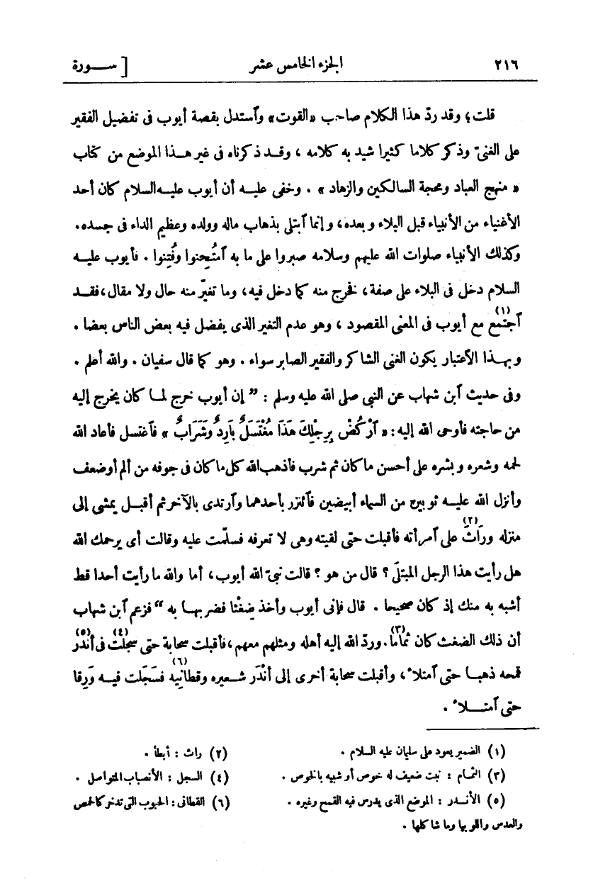 قُلْتُ: وَقَدْ رَدَّ هَذَا الْكَلَامَ صَاحِبُ الْقُوتِ وَاسْتَدَلَّ بِقِصَّةِ أَيُّوبَ فِي تَفْضِيلِ الْفَقِيرِ عَلَى الْغَنِيِّ وَذَكَرَ كَلَامًا كَثِيرًا شَيَّدَ بِهِ كَلَامَهُ، وَقَدْ ذَكَرْنَاهُ فِي غَيْرِ هَذَا الْمَوْضِعِ مِنْ كِتَابِ" مَنْهَجِ الْعِبَادِ وَمَحَجَّةِ السَّالِكِينَ وَالزُّهَّادِ". وَخَفِيَ عَلَيْهِ أَنَّ أَيُّوبَ عَلَيْهِ السَّلَامُ كَانَ أَحَدَ الْأَغْنِيَاءِ مِنَ الْأَنْبِيَاءِ قَبْلَ الْبَلَاءِ وَبَعْدَهُ، وَإِنَّمَا ابْتُلِيَ بِذَهَابِ مَالِهِ وَوَلَدِهِ وَعَظِيمِ الدَّاءِ فِي جَسَدِهِ. وَكَذَلِكَ الْأَنْبِيَاءُ صَلَوَاتُ اللَّهِ عَلَيْهِمْ وَسَلَامُهُ صَبَرُوا عَلَى مَا بِهِ امْتُحِنُوا وَفُتِنُوا. فَأَيُّوبُ عَلَيْهِ السَّلَامُ دَخَلَ فِي الْبَلَاءِ عَلَى صِفَةٍ، فَخَرَجَ مِنْهُ كَمَا دَخَلَ فِيهِ، وَمَا تَغَيَّرَ مِنْهُ حَالٌ وَلَا مَقَالٌ، فَقَدِ اجْتَمَعَ «١» مَعَ أَيُّوبَ فِي الْمَعْنَى الْمَقْصُودِ، وَهُوَ عَدَمُ التَّغَيُّرِ الَّذِي يَفْضُلُ فِيهِ بَعْضُ النَّاسِ بَعْضًا. وَبِهَذَا الِاعْتِبَارِ يَكُونُ الْغَنِيُّ الشَّاكِرُ وَالْفَقِيرُ الصَّابِرُ سَوَاءً. وَهُوَ كَمَا قَالَ سُفْيَانُ. وَاللَّهُ أَعْلَمُ. وَفِي حَدِيثِ ابْنُ شِهَابٍ عَنِ النَّبِيِّ صَلَّى اللَّهُ عَلَيْهِ وَسَلَّمَ:" أَنَّ أَيُّوبَ خَرَجَ لِمَا كَانَ يَخْرُجُ إِلَيْهِ مِنْ حَاجَتِهِ فَأَوْحَى اللَّهُ إِلَيْهِ:" ارْكُضْ بِرِجْلِكَ هَذَا مُغْتَسَلٌ بارِدٌ وَشَرابٌ" فَاغْتَسَلَ فَأَعَادَ اللَّهُ لَحْمَهُ وَشَعْرَهُ وَبَشَرَهُ عَلَى أَحْسَنِ مَا كَانَ ثُمَّ شَرِبَ فَأَذْهَبَ اللَّهُ كُلَّ مَا كَانَ فِي جَوْفِهِ مِنْ أَلَمٍ أَوْ ضَعْفٍ وَأَنْزَلَ اللَّهُ عَلَيْهِ ثَوْبَيْنِ مِنَ السَّمَاءِ أَبْيَضَيْنِ فَائْتَزَرَ بِأَحَدِهِمَا وَارْتَدَى بِالْآخَرِ ثُمَّ أَقْبَلَ يَمْشِي إِلَى مَنْزِلِهِ وَرَاثَ «٢» عَلَى امْرَأَتِهِ فَأَقْبَلَتْ حَتَّى لَقِيَتْهُ وَهِيَ لَا تَعْرِفُهُ فَسَلَّمَتْ عَلَيْهِ وَقَالَتْ أَيْ يَرْحَمُكَ اللَّهُ هَلْ رَأَيْتَ هَذَا الرَّجُلَ الْمُبْتَلَى؟ قَالَ مَنْ هُوَ؟ قَالَتْ نَبِيُّ اللَّهِ أَيُّوبُ، أَمَا وَاللَّهِ مَا رَأَيْتُ أَحَدًا قَطُّ أَشْبَهَ بِهِ مِنْكَ إِذْ كَانَ صَحِيحًا. قَالَ فَإِنِّي أَيُّوبُ وَأَخَذَ ضِغْثًا فَضَرَبَهَا بِهِ" فَزَعَمَ ابْنُ شِهَابٍ أَنَّ ذَلِكَ الضِّغْثَ كَانَ ثُمَامًا «٣». وَرَدَّ اللَّهُ إِلَيْهِ أَهْلَهُ وَمِثْلَهُمْ مَعَهُمْ، فَأَقْبَلَتْ سَحَابَةٌ حَتَّى سَجَلَتْ «٤» فِي أَنْدَرِ «٥» قَمْحِهِ ذَهَبًا حَتَّى امْتَلَأَ، وَأَقْبَلَتْ سَحَابَةٌ أُخْرَى إِلَى أَنْدَرِ شَعِيرِهِ وَقَطَّانِيهِ «٦» فَسَجَلَتْ فِيهِ وَرِقًا حَتَّى امتلأ.