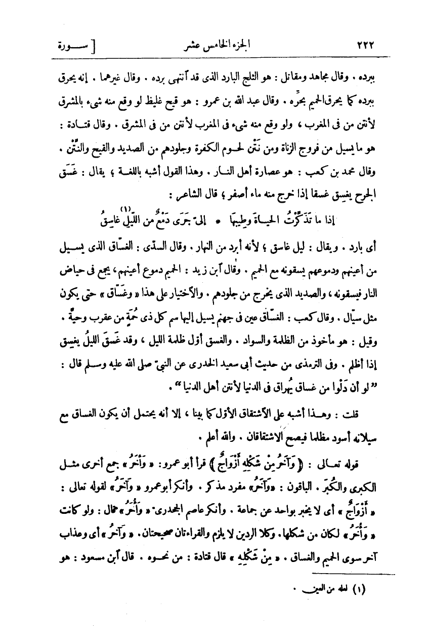 بِبَرْدِهِ. وَقَالَ مُجَاهِدٌ وَمُقَاتِلٌ: هُوَ الثَّلْجُ الْبَارِدُ الَّذِي قَدِ انْتَهَى بَرْدُهُ. وَقَالَ غَيْرُهُمَا. إِنَّهُ يُحْرِقُ بِبَرْدِهِ كَمَا يُحْرِقُ الْحَمِيمُ بِحَرِّهِ. وَقَالَ عَبْدُ اللَّهِ بْنُ عَمْرٍو: هُوَ قَيْحٌ غَلِيظٌ لو وقع منه شي بِالْمَشْرِقِ لَأَنْتَنَ مَنْ فِي الْمَغْرِبِ، وَلَوْ وَقَعَ منه شي فِي الْمَغْرِبِ لَأَنْتَنَ مَنْ فِي الْمَشْرِقِ. وَقَالَ قَتَادَةُ: هُوَ مَا يَسِيلُ مِنْ فُرُوجِ الزُّنَاةِ وَمِنْ نَتْنِ لُحُومِ الْكَفَرَةِ وَجُلُودِهِمْ مِنَ الصَّدِيدِ وَالْقَيْحِ وَالنَّتْنِ. وَقَالَ مُحَمَّدُ بْنُ كَعْبٍ: هُوَ عُصَارَةُ أَهْلِ النَّارِ. وَهَذَا الْقَوْلُ أَشْبَهُ بِاللُّغَةِ، يُقَالُ: غَسَقَ الْجُرْحُ يَغْسِقُ غَسْقًا إِذَا خَرَجَ مِنْهُ مَاءٌ أَصْفَرُ، قَالَ الشَّاعِرُ: