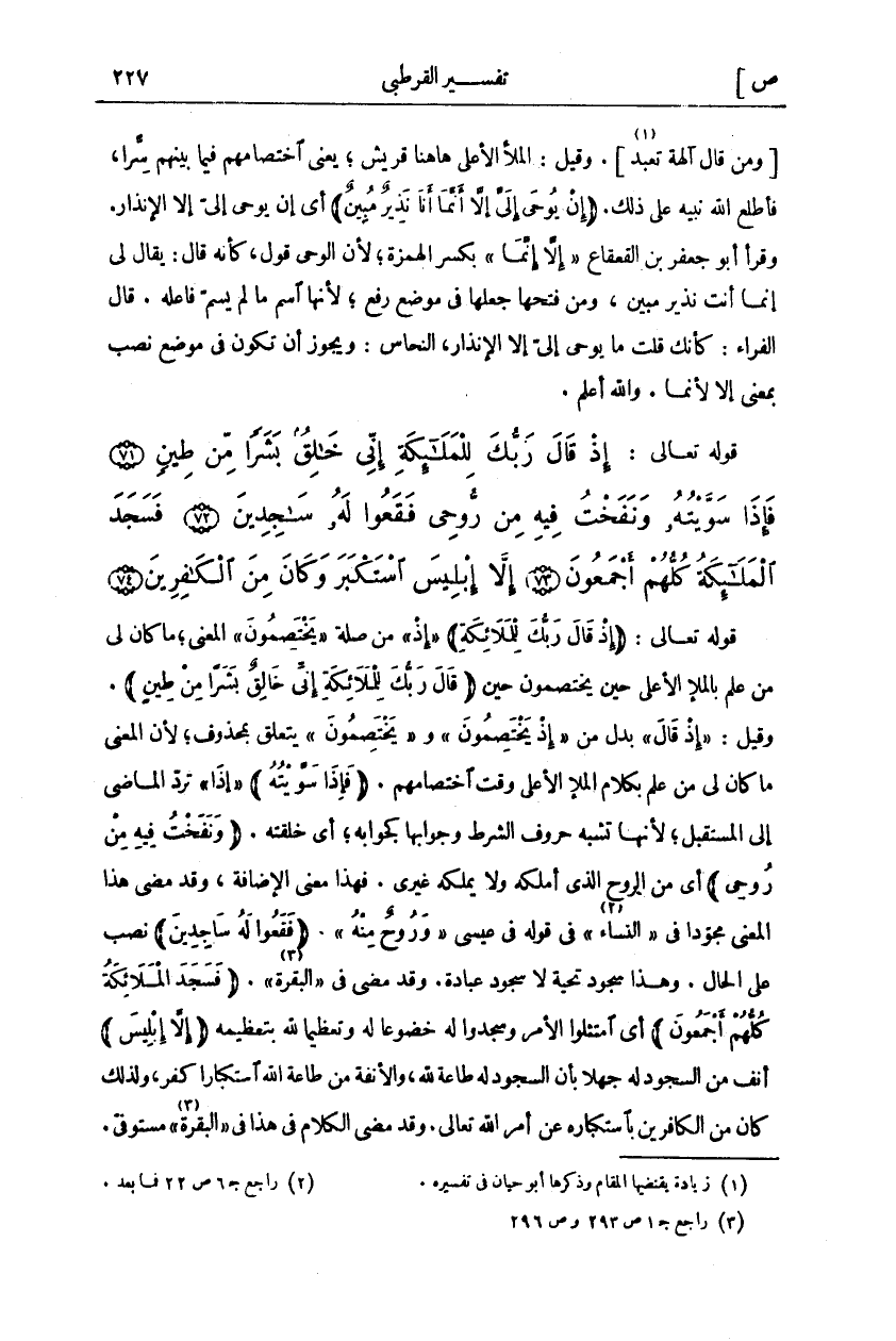 قَوْلُهُ تَعَالَى:" إِذْ قالَ رَبُّكَ لِلْمَلائِكَةِ"" إِذْ" مِنْ صِلَةِ" يَخْتَصِمُونَ" الْمَعْنَى، مَا كَانَ لِيَ مِنْ عِلْمٍ بِالْمَلَأِ الْأَعْلَى حِينَ يَخْتَصِمُونَ حِينَ" قالَ رَبُّكَ لِلْمَلائِكَةِ إِنِّي خالِقٌ بَشَراً مِنْ طِينٍ". وَقِيلَ:" إِذْ قالَ" بَدَلٌ مِنْ" إِذْ يَخْتَصِمُونَ" وَ" يَخْتَصِمُونَ" يَتَعَلَّقُ بِمَحْذُوفٍ، لِأَنَّ الْمَعْنَى مَا كَانَ لِيَ مِنْ عِلْمٍ بِكَلَامِ الْمَلَأِ الْأَعْلَى وَقْتَ اخْتِصَامِهِمْ." فَإِذا سَوَّيْتُهُ"" إِذَا" تَرُدُّ الْمَاضِيَ إِلَى الْمُسْتَقْبَلِ، لِأَنَّهَا تُشْبِهُ حُرُوفَ الشَّرْطِ وَجَوَابُهَا كَجَوَابِهِ، أَيْ خَلَقْتُهُ." وَنَفَخْتُ فِيهِ مِنْ رُوحِي" أَيْ مِنَ الرُّوحِ الَّذِي أَمْلِكُهُ وَلَا يَمْلِكُهُ غَيْرِي. فَهَذَا مَعْنَى الْإِضَافَةِ، وَقَدْ مَضَى هَذَا الْمَعْنَى مُجَوَّدًا فِي" النِّسَاءِ" «٢» فِي قَوْلِهِ في عيسى" وَرُوحٌ مِنْهُ" [النساء: ١٧١]." فَقَعُوا لَهُ ساجِدِينَ" نَصْبٌ عَلَى الْحَالِ. وَهَذَا سُجُودُ تَحِيَّةٍ لَا سُجُودَ عِبَادَةٍ. وَقَدْ مَضَى فِي" الْبَقَرَةِ" «٣»." فَسَجَدَ الْمَلائِكَةُ كُلُّهُمْ أَجْمَعُونَ" أَيِ امْتَثَلُوا الْأَمْرَ وَسَجَدُوا لَهُ خُضُوعًا لَهُ وَتَعْظِيمًا لِلَّهِ بِتَعْظِيمِهِ" إِلَّا إِبْلِيسَ" أَنِفَ مِنَ السُّجُودِ لَهُ جَهْلًا بِأَنَّ السُّجُودَ لَهُ طَاعَةٌ لِلَّهِ، وَالْأَنَفَةُ مِنْ طَاعَةِ اللَّهِ اسْتِكْبَارًا كُفْرٌ، وَلِذَلِكَ كَانَ مِنَ الْكَافِرِينَ بِاسْتِكْبَارِهِ عَنْ أَمْرِ اللَّهِ تَعَالَى. وَقَدْ مَضَى الْكَلَامُ فِي، هَذَا فِي" الْبَقَرَةِ" «٤» مستوفى.