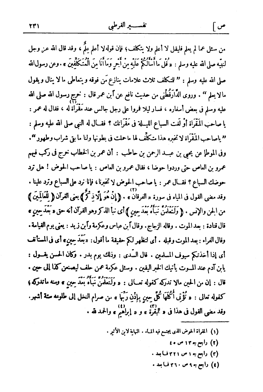مَنْ سُئِلَ عَمَّا لَمْ يَعْلَمْ فَلْيَقُلْ لَا أَعْلَمُ وَلَا يَتَكَلَّفْ، فَإِنَّ قَوْلَهُ لَا أَعْلَمُ عِلْمٌ، وَقَدْ قَالَ اللَّهِ عَزَّ وَجَلَّ لِنَبِيِّهِ صَلَّى اللَّهُ عَلَيْهِ وَسَلَّمَ:" قُلْ ما أَسْئَلُكُمْ عَلَيْهِ مِنْ أَجْرٍ وَما أَنَا مِنَ الْمُتَكَلِّفِينَ". وَعَنْ رَسُولِ اللَّهِ صَلَّى اللَّهُ عَلَيْهِ وَسَلَّمَ:" لِلْمُتَكَلِّفِ ثَلَاثُ عَلَامَاتٍ يُنَازِعُ مَنْ فَوْقَهُ وَيَتَعَاطَى مَا لَا يَنَالُ وَيَقُولُ مَا لَا يَعْلَمُ". وَرَوَى الدَّارَقُطْنِيُّ مِنْ حَدِيثِ نَافِعٍ عَنِ ابْنِ عُمَرَ قَالَ: خَرَجَ رَسُولُ اللَّهِ صَلَّى اللَّهُ عَلَيْهِ وَسَلَّمَ فِي بَعْضِ أَسْفَارِهِ، فَسَارَ لَيْلًا فَمَرُّوا عَلَى رَجُلٍ جَالِسٍ عِنْدَ مَقْرَاةٍ «١» لَهُ، فَقَالَ لَهُ عُمَرُ: يَا صَاحِبَ الْمَقْرَاةِ أَوَلَغَتِ السِّبَاعُ اللَّيْلَةَ فِي مَقْرَاتِكَ؟ فَقَالَ لَهُ النَّبِيُّ صَلَّى اللَّهُ عَلَيْهِ وَسَلَّمَ:" يَا صَاحِبَ الْمَقْرَاةِ لَا تُخْبِرْهُ هَذَا مُتَكَلِّفٌ لَهَا مَا حَمَلَتْ فِي بُطُونِهَا وَلَنَا مَا بَقِيَ شَرَابٌ وَطَهُورٌ". وَفِي الْمُوَطَّإِ عَنْ يَحْيَى بْنِ عَبْدِ الرَّحْمَنِ بْنِ حَاطِبٍ: أَنَّ عُمَرَ بْنَ الْخَطَّابِ خَرَجَ فِي رَكْبٍ فِيهِمْ عَمْرُو بْنُ الْعَاصِ حَتَّى وَرَدُوا حَوْضًا، فَقَالَ عَمْرُو بْنُ الْعَاصِ: يَا صَاحِبَ الْحَوْضِ هَلْ تَرِدُ حَوْضَكَ السِّبَاعُ؟ فَقَالَ عُمَرُ: يَا صَاحِبَ الْحَوْضِ لَا تُخْبِرْنَا فَإِنَّا نَرِدُ عَلَى السِّبَاعِ وَتَرِدُ عَلَيْنَا. وَقَدْ مَضَى الْقَوْلُ فِي الْمِيَاهِ فِي سُورَةِ" الْفُرْقَانِ" «٢»." إِنْ هُوَ إِلَّا ذِكْرٌ" يَعْنِي الْقُرْآنَ" لِلْعالَمِينَ" مِنَ الْجِنِّ وَالْإِنْسِ." وَلَتَعْلَمُنَّ نَبَأَهُ بَعْدَ حِينٍ" أَيْ نَبَأُ الذِّكْرِ وَهُوَ الْقُرْآنُ أَنَّهُ حَقٌّ" بَعْدَ حِينٍ" قَالَ قَتَادَةُ: بَعْدَ الْمَوْتِ. وَقَالَ الزَّجَّاجُ. وَقَالَ ابْنُ عَبَّاسٍ وَعِكْرِمَةُ وَابْنُ زَيْدٍ: يَعْنِي يَوْمَ الْقِيَامَةِ. وَقَالَ الْفَرَّاءُ: بَعْدَ الْمَوْتِ وَقَبْلَهُ. أَيْ لَتَظْهَرُ لَكُمْ حَقِيقَةُ مَا أَقُولُ:" بَعْدَ حِينٍ" أَيْ فِي الْمُسْتَأْنَفِ أَيْ إِذَا أَخَذَتْكُمْ سُيُوفُ الْمُسْلِمِينَ. قَالَ السُّدِّيُّ: وَذَلِكَ يَوْمُ بَدْرٍ. وَكَانَ الْحَسَنُ يَقُولُ: يَا ابْنَ آدَمَ عِنْدَ الموت يأتيك الخبر اليقين. وسيل عِكْرِمَةُ عَمَّنْ حَلَفَ لَيَصْنَعَنَّ كَذَا إِلَى حِينٍ. قَالَ: إِنَّ مِنَ الْحِينِ مَا لَا تُدْرِكُهُ كَقَوْلِهِ تَعَالَى:" وَلَتَعْلَمُنَّ نَبَأَهُ بَعْدَ حِينٍ" وَمِنْهُ مَا تُدْرِكُهُ، كَقَوْلِهِ تَعَالَى:" تُؤْتِي أُكُلَها كُلَّ حِينٍ بِإِذْنِ رَبِّها" [إبراهيم: ٢٥] مِنْ صِرَامِ النَّخْلِ إِلَى طُلُوعِهِ سِتَّةُ أَشْهُرٍ. وَقَدْ مَضَى الْقَوْلُ فِي هَذَا فِي" الْبَقَرَةِ" «٣» و" إبراهيم" «٤» والحمد لله.