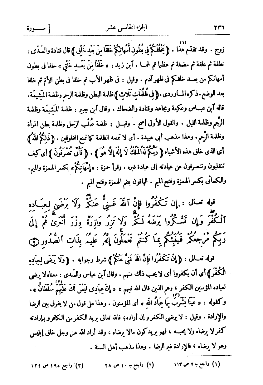 قَوْلُهُ تَعَالَى:" إِنْ تَكْفُرُوا فَإِنَّ اللَّهَ غَنِيٌّ عَنْكُمْ" شَرْطٌ وَجَوَابُهُ." وَلا يَرْضى لِعِبادِهِ الْكُفْرَ" أَيْ إِنْ يَكْفُرُوا أَيْ لَا يُحِبُّ ذَلِكَ مِنْهُمْ. وَقَالَ ابْنُ عَبَّاسٍ وَالسُّدِّيُّ: مَعْنَاهُ لَا يَرْضَى لِعِبَادِهِ الْمُؤْمِنِينَ الْكُفْرَ، وَهُمُ الَّذِينَ قَالَ اللَّهُ فِيهِمْ:" إِنَّ عِبادِي لَيْسَ لَكَ عَلَيْهِمْ سُلْطانٌ" [الإسراء: ٦٥]. وكقوله:" عَيْناً يَشْرَبُ بِها عِبادُ اللَّهِ" [الإنسان: ٦] أَيِ الْمُؤْمِنُونَ. وَهَذَا عَلَى قَوْلِ مَنْ لَا يُفَرِّقُ بَيْنَ الرِّضَا وَالْإِرَادَةِ. وَقِيلَ: لَا يَرْضَى الْكُفْرَ وَإِنْ أَرَادَهُ، فَاللَّهُ تَعَالَى يُرِيدُ الْكُفْرَ مِنَ الْكَافِرِ وَبِإِرَادَتِهِ كَفَرَ لَا يَرْضَاهُ وَلَا يُحِبُّهُ، فَهُوَ يُرِيدُ كَوْنُ مَا لَا يَرْضَاهُ، وَقَدْ أَرَادَ اللَّهُ عَزَّ وَجَلَّ خَلْقَ إِبْلِيسَ وَهُوَ لَا يَرْضَاهُ، فَالْإِرَادَةُ غَيْرُ الرِّضَا. وَهَذَا مذهب أهل السنة.
