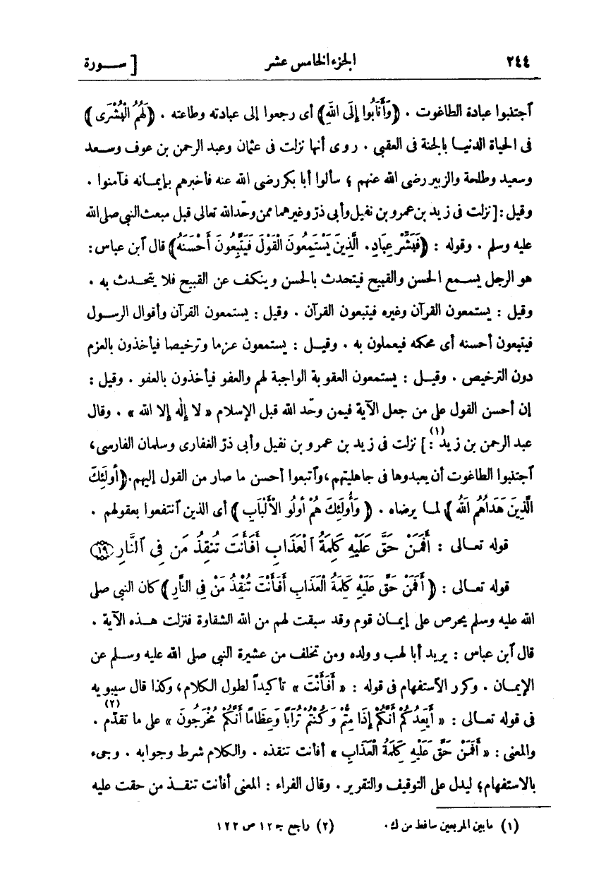 اجْتَنَبُوا عِبَادَةَ الطَّاغُوتِ." وَأَنابُوا إِلَى اللَّهِ" أَيْ رَجَعُوا إِلَى عِبَادَتِهِ وَطَاعَتِهِ." لَهُمُ الْبُشْرى " فِي الْحَيَاةِ الدُّنْيَا بِالْجَنَّةِ فِي الْعُقْبَى. رُوِيَ أَنَّهَا نَزَلَتْ فِي عُثْمَانَ وَعَبْدِ الرَّحْمَنِ بْنِ عَوْفٍ وَسَعْدٍ وَسَعِيدٍ وَطَلْحَةَ وَالزُّبَيْرِ رَضِيَ اللَّهُ عَنْهُمْ، سَأَلُوا أَبَا بَكْرٍ رَضِيَ اللَّهُ عَنْهُ فَأَخْبَرَهُمْ بِإِيمَانِهِ فَآمَنُوا. وَقِيلَ: نَزَلَتْ فِي زَيْدِ بْنِ عَمْرِو بْنِ نُفَيْلٍ وَأَبِي ذَرٍّ وَغَيْرِهِمَا مِمَّنْ وَحَّدَ اللَّهَ تَعَالَى قَبْلَ مَبْعَثِ النَّبِيِّ صَلَّى اللَّهُ عَلَيْهِ وَسَلَّمَ. وَقَوْلُهُ:" فَبَشِّرْ عِبادِ. الَّذِينَ يَسْتَمِعُونَ الْقَوْلَ فَيَتَّبِعُونَ أَحْسَنَهُ" قَالَ ابْنُ عَبَّاسٍ: هُوَ الرَّجُلُ يَسْمَعُ الْحَسَنَ وَالْقَبِيحَ فَيَتَحَدَّثُ بِالْحَسَنِ وَيَنْكَفُّ عَنِ الْقَبِيحِ فَلَا يَتَحَدَّثُ بِهِ. وَقِيلَ: يَسْتَمِعُونَ الْقُرْآنَ وَغَيْرَهُ فَيَتَّبِعُونَ الْقُرْآنَ. وَقِيلَ: يَسْتَمِعُونَ الْقُرْآنَ وَأَقْوَالَ الرَّسُولِ فَيَتَّبِعُونَ أَحْسَنَهُ أَيْ مُحْكَمَهُ فَيَعْمَلُونَ بِهِ. وَقِيلَ: يَسْتَمِعُونَ عَزْمًا وَتَرْخِيصًا فَيَأْخُذُونَ بِالْعَزْمِ دُونَ التَّرْخِيصِ. وَقِيلَ: يَسْتَمِعُونَ الْعُقُوبَةَ الْوَاجِبَةَ لَهُمْ وَالْعَفْوَ فَيَأْخُذُونَ بِالْعَفْوِ. وَقِيلَ: إِنَّ أَحْسَنَ الْقَوْلِ عَلَى مَنْ جَعَلَ الْآيَةَ فِيمَنْ وَحَّدَ اللَّهَ قَبْلَ الْإِسْلَامِ" لَا إِلَهَ إِلَّا اللَّهُ". وَقَالَ عَبْدُ الرَّحْمَنِ بْنُ زَيْدٍ: نَزَلَتْ فِي زَيْدِ بْنِ عَمْرِو بْنِ نُفَيْلٍ وَأَبِي ذَرٍّ الْغِفَارِيِّ وَسَلْمَانَ الْفَارِسِيِّ، اجْتَنَبُوا الطَّاغُوتَ أَنْ يَعْبُدُوهَا فِي جَاهِلِيَّتِهِمْ، وَاتَّبَعُوا أَحْسَنَ مَا صَارَ مِنَ الْقَوْلِ إِلَيْهِمْ." أُولئِكَ الَّذِينَ هَداهُمُ اللَّهُ" لِمَا يرضاه." وَأُولئِكَ هُمْ أُولُوا الْأَلْبابِ" أي أصحاب العقول من المؤمنين الذين انتفعوا بعقولهم