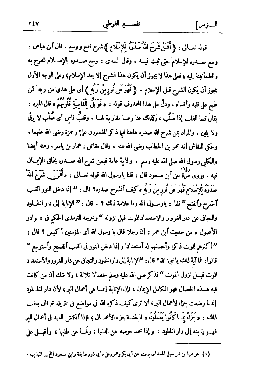 شَرَحَ فَتَحَ وَوَسَّعَ. قَالَ ابْنُ عَبَّاسٍ: وَسَّعَ صَدْرَهُ لِلْإِسْلَامِ حَتَّى ثَبَتَ فِيهِ. وَقَالَ السُّدِّيُّ: بِالْإِسْلَامِ لِلْفَرَحِ بِهِ وَالطُّمَأْنِينَةِ إِلَيْهِ، فَعَلَى هَذَا لَا يَجُوزُ أَنْ يَكُونَ هَذَا الشَّرْحُ إِلَّا بَعْدَ الْإِسْلَامِ، وَعَلَى الْوَجْهِ الْأَوَّلِ يَجُوزُ أَنْ يَكُونَ الشَّرْحُ قَبْلَ الْإِسْلَامِ." فَهُوَ عَلى نُورٍ مِنْ رَبِّهِ" أَيْ عَلَى هُدًى مِنْ رَبِّهِ كَمَنْ طَبَعَ عَلَى قَلْبِهِ وَأَقْسَاهُ. وَدَلَّ عَلَى هَذَا الْمَحْذُوفِ قَوْلُهُ:" فَوَيْلٌ لِلْقاسِيَةِ قُلُوبُهُمْ" قَالَ الْمُبَرِّدُ: يُقَالُ قَسَا الْقَلْبُ إِذَا صَلُبَ، وَكَذَلِكَ عَتَا وَعَسَا مُقَارِبَةٌ لَهَا. وَقَلْبٌ قَاسٍ أَيْ صُلْبٌ لَا يَرِقُّ وَلَا يَلِينُ. وَالْمُرَادُ بِمَنْ شَرَحَ اللَّهُ صَدْرَهُ هَاهُنَا فِيمَا ذَكَرَ الْمُفَسِّرُونَ على وحمزة رضى الله عنهما. وحكى انقاش أَنَّهُ عُمَرُ بْنُ الْخَطَّابِ رَضِيَ اللَّهُ عَنْهُ. وَقَالَ مُقَاتِلٌ: عَمَّارُ بْنُ يَاسِرٍ، وَعَنْهُ أَيْضًا وَالْكَلْبِيِّ رَسُولُ اللَّهِ صَلَّى اللَّهُ عَلَيْهِ وَسَلَّمَ. وَالْآيَةُ عَامَّةٌ فِيمَنْ شَرَحَ اللَّهُ صَدْرَهُ بِخَلْقِ الْإِيمَانِ فِيهِ. وَرَوَى مُرَّةُ «١» عَنِ ابْنِ مَسْعُودٍ قَالَ: قُلْنَا يَا رَسُولَ اللَّهِ قَوْلَهُ تَعَالَى:" أَفَمَنْ شَرَحَ اللَّهُ صَدْرَهُ لِلْإِسْلامِ فَهُوَ عَلى نُورٍ مِنْ رَبِّهِ" كَيْفَ انْشَرَحَ صَدْرُهُ؟ قَالَ" إِذَا دَخَلَ النُّورُ الْقَلْبَ انْشَرَحَ وَانْفَتَحَ" قُلْنَا: يَا رَسُولَ اللَّهِ وَمَا عَلَامَةُ ذَلِكَ؟. قَالَ:" الإنابة الى دار الجلود وَالتَّجَافِي عَنْ دَارِ الْغُرُورِ وَالِاسْتِعْدَادُ لِلْمَوْتِ قَبْلَ نُزُولِهِ" وَخَرَّجَهُ التِّرْمِذِيُّ الْحَكِيمُ فِي" نَوَادِرِ الْأُصُولِ" مِنْ حَدِيثِ ابْنِ عُمَرَ: أَنَّ رَجُلًا قَالَ يَا رَسُولَ اللَّهِ أَيُّ الْمُؤْمِنِينَ أَكْيَسُ؟ قَالَ:" أكثر هم لِلْمَوْتِ ذِكْرًا وَأَحْسَنُهُمْ لَهُ اسْتِعْدَادًا وَإِذَا دَخَلَ النُّورُ فِي الْقَلْبِ انْفَسَحَ وَاسْتَوْسَعَ" قَالُوا: فَمَا آيَةُ ذَلِكَ يَا نَبِيَّ اللَّهِ؟ قَالَ:" الْإِنَابَةُ إِلَى دَارِ الْخُلُودِ وَالتَّجَافِي عَنْ دَارِ الْغُرُورِ وَالِاسْتِعْدَادُ لِلْمَوْتِ قَبْلَ نُزُولِ الْمَوْتِ" فَذَكَرَ صَلَّى اللَّهُ عَلَيْهِ وَسَلَّمَ خِصَالًا ثَلَاثَةً، وَلَا شَكَّ أَنَّ مَنْ كَانَتْ فِيهِ هَذِهِ الْخِصَالُ فَهُوَ الْكَامِلُ الْإِيمَانِ، فَإِنَّ الْإِنَابَةَ إِنَّمَا هِيَ أَعْمَالُ البر، لان دار الجلود إِنَّمَا وُضِعَتْ جَزَاءً لِأَعْمَالِ الْبِرِّ، أَلَا تَرَى كَيْفَ ذَكَرَهُ اللَّهُ فِي مَوَاضِعَ فِي تَنْزِيلِهِ ثُمَّ قَالَ بِعَقِبِ ذَلِكَ" جَزَاءً بِمَا كَانُوا يَعْمَلُونَ" فَالْجَنَّةُ جَزَاءُ الْأَعْمَالِ، فَإِذَا انْكَمَشَ الْعَبْدُ فِي أَعْمَالِ الْبِرِّ فَهُوَ إِنَابَتُهُ إِلَى دَارِ الجلود، وَإِذَا خَمَدَ حِرْصُهُ عَنِ الدُّنْيَا، وَلَهَا عَنْ طلبها، وأقبل على ٠