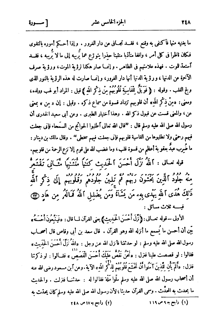 فِيهِ ثلاث مسائل: الاولى- قوله تعالى:" نَزَّلَ أَحْسَنَ الْحَدِيثِ" يَعْنِي الْقُرْآنَ لَمَّا قَالَ" فَيَتَّبِعُونَ أَحْسَنَهُ" بَيَّنَ أَنَّ أَحْسَنَ مَا يُسْمَعُ مَا أَنْزَلَهُ اللَّهُ وَهُوَ الْقُرْآنُ. قَالَ سَعْدُ بْنُ أَبِي وَقَّاصٍ قَالَ أَصْحَابُ رَسُولِ اللَّهِ صَلَّى اللَّهُ عَلَيْهِ وَسَلَّمَ: لَوْ حَدَّثْتَنَا فَأَنْزَلَ اله عَزَّ وَجَلَّ" اللَّهُ نَزَّلَ أَحْسَنَ الْحَدِيثِ" فَقَالُوا: لَوْ قَصَصْتَ عَلَيْنَا فَنَزَلَ" نَحْنُ نَقُصُّ عَلَيْكَ أَحْسَنَ الْقَصَصِ" فَقَالُوا: لَوْ ذَكَّرْتَنَا فَنَزَلَ" أَلَمْ يَأْنِ لِلَّذِينَ آمَنُوا أَنْ تَخْشَعَ قُلُوبُهُمْ لِذِكْرِ اللَّهِ" الْآيَةَ. وَعَنِ ابْنِ مَسْعُودٍ رَضِيَ اللَّهُ عَنْهُ أَنَّ أَصْحَابَ رَسُولِ اللَّهِ صَلَّى اللَّهُ عَلَيْهِ وَسَلَّمَ ملموا مَلَّةً فَقَالُوا لَهُ: حَدِّثْنَا فَنَزَلَتْ. وَالْحَدِيثُ مَا يُحَدِّثُ بِهِ الْمُحَدِّثُ. وَسُمِّيَ الْقُرْآنُ حَدِيثًا، لِأَنَّ رَسُولَ اللَّهِ صَلَّى اللَّهُ عَلَيْهِ وَسَلَّمَ كان يحدث به