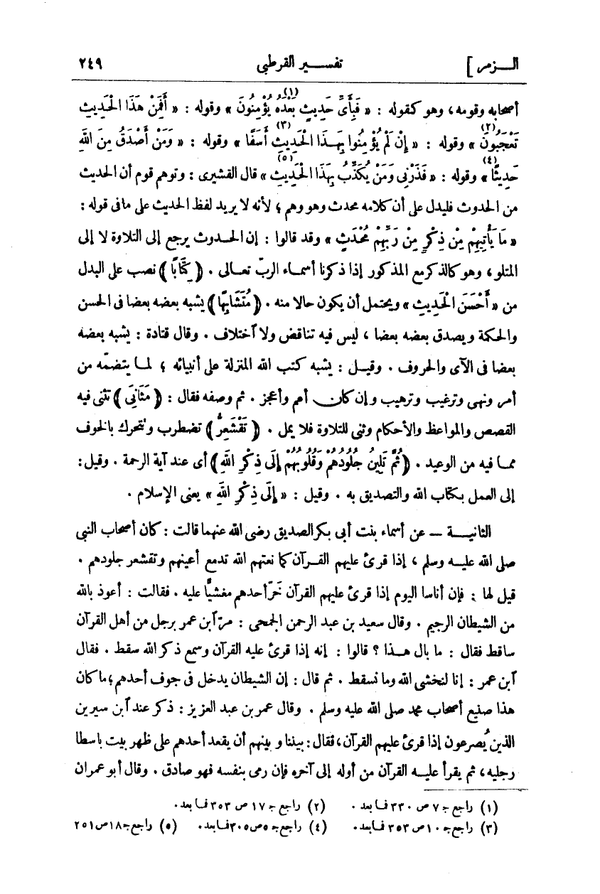 أَصْحَابَهُ وَقَوْمَهُ، وَهُوَ كَقَوْلِهِ:" فَبِأَيِّ حَدِيثٍ بَعْدَهُ يُؤْمِنُونَ" وَقَوْلِهِ:" أَفَمِنْ هذَا الْحَدِيثِ تَعْجَبُونَ" وَقَوْلِهِ: فَذَرْنِي وَمَنْ يُكَذِّبُ بِهذَا الْحَدِيثِ" [القلم: ٤ ٤] قَالَ الْقُشَيْرِيُّ: وَتَوَهَّمَ قَوْمٌ أَنَّ الْحَدِيثَ مِنَ الْحُدُوثِ فَيَدُلَّ عَلَى أَنَّ كَلَامَهُ مُحْدَثٌ وَهُوَ وَهْمٌ، لِأَنَّهُ لَا يُرِيدُ لَفْظَ الْحَدِيثِ عَلَى مَا فِي قَوْلِهِ:" مَا يَأْتِيهِمْ مِنْ ذِكْرٍ مِنْ رَبِّهِمْ مُحْدَثٍ" وَقَدْ قَالُوا: إِنَّ الْحُدُوثَ يَرْجِعُ إِلَى التِّلَاوَةِ لَا إِلَى الْمَتْلُوِّ، وَهُوَ كَالذِّكْرِ مَعَ الْمَذْكُورِ إِذَا ذَكَرْنَا أَسْمَاءَ الرَّبِّ تَعَالَى." كِتاباً" نَصْبٌ عَلَى الْبَدَلِ مِنْ" أَحْسَنَ الْحَدِيثِ" وَيَحْتَمِلُ أَنْ يَكُونَ حَالًا مِنْهُ." مُتَشابِهاً" يُشْبِهُ بَعْضُهُ بَعْضًا فِي الْحُسْنِ وَالْحِكْمَةِ وَيُصَدِّقُ بَعْضُهُ بَعْضًا، لَيْسَ فِيهِ تَنَاقُضٌ وَلَا اخْتِلَافٌ. وَقَالَ قَتَادَةُ: يُشْبِهُ بَعْضُهُ بَعْضًا فِي الْآيِ وَالْحُرُوفِ. وَقِيلَ: يُشْبِهُ كُتُبَ اللَّهِ الْمُنَزَّلَةَ عَلَى أَنْبِيَائِهِ، لِمَا يَتَضَمَّنُهُ مِنْ أَمْرٍ وَنَهْيٍ وَتَرْغِيبٍ وَتَرْهِيبٍ وَإِنْ كَانَ أَعَمَّ وَأَعْجَزَ. ثُمَّ وَصَفَهُ فَقَالَ:" مَثانِيَ" تُثَنَّى فِيهِ الْقَصَصُ وَالْمَوَاعِظُ وَالْأَحْكَامُ وَثُنِّيَ لِلتِّلَاوَةِ فَلَا يُمَلُّ." تَقْشَعِرُّ" تَضْطَرِبُ وَتَتَحَرَّكُ بِالْخَوْفِ مِمَّا فِيهِ مِنَ الْوَعِيدِ." ثُمَّ تَلِينُ جُلُودُهُمْ وَقُلُوبُهُمْ إِلى ذِكْرِ اللَّهِ" أَيْ عِنْدَ آيَةِ الرَّحْمَةِ. وَقِيلَ: إِلَى الْعَمَلِ بِكِتَابِ اللَّهِ وَالتَّصْدِيقِ بِهِ. وَقِيلَ:" إِلى ذِكْرِ اللَّهِ" يَعْنِي الْإِسْلَامَ. الثَّانِيَةُ- عَنْ أَسْمَاءَ بِنْتِ أَبِي بَكْرٍ الصِّدِّيقِ رَضِيَ اللَّهُ عَنْهُمَا قَالَتْ: كَانَ أَصْحَابُ النَّبِيِّ صَلَّى اللَّهُ عَلَيْهِ وَسَلَّمَ، إذا قرى عَلَيْهِمُ الْقُرْآنُ كَمَا نَعَتَهُمُ اللَّهُ تَدْمَعُ أَعْيُنُهُمْ وَتَقْشَعِرُّ جُلُودُهُمْ. قِيلَ لَهَا: فَإِنَّ أُنَاسًا الْيَوْمَ إذا قرى عَلَيْهِمُ الْقُرْآنُ خَرَّ أَحَدُهُمْ مَغْشِيًّا عَلَيْهِ. فَقَالَتْ: أَعُوذَ بِاللَّهِ مِنَ الشَّيْطَانِ الرَّجِيمِ. وَقَالَ سَعِيدُ بْنُ عَبْدِ الرَّحْمَنِ الْجُمَحِيُّ: مَرَّ ابْنُ عُمَرَ برجل من أهل القرآن ساقطا فَقَالَ: مَا بَالُ هَذَا؟ قَالُوا: إِنَّهُ إِذَا قرى عَلَيْهِ الْقُرْآنُ وَسَمِعَ ذِكْرَ اللَّهِ سَقَطَ. فَقَالَ ابْنُ عُمَرَ: إِنَّا لَنَخْشَى اللَّهَ وَمَا نَسْقُطُ. ثُمَّ قَالَ: إِنَّ الشَّيْطَانَ يَدْخُلُ فِي جَوْفِ أَحَدِهِمْ، مَا كَانَ هَذَا صَنِيعِ أَصْحَابِ مُحَمَّدٍ صلى الله عليه سلم. وَقَالَ عُمَرُ بْنُ عَبْدِ الْعَزِيزِ: ذُكِرَ عِنْدَ ابن سيرين الذين يصرعون إذا قرى عَلَيْهِمُ الْقُرْآنُ فَقَالَ: بَيْنَنَا وَبَيْنَهُمْ أَنْ يَقْعُدَ أَحَدُهُمْ عَلَى ظَهْرِ بَيْتٍ بَاسِطًا رِجْلَيْهِ، ثُمَّ يُقْرَأُ عَلَيْهِ الْقُرْآنُ مِنْ أَوَّلِهِ إِلَى آخِرِهِ فَإِنْ رَمَى بِنَفْسِهِ فَهُوَ صَادِقٌ. وَقَالَ أَبُو عمران