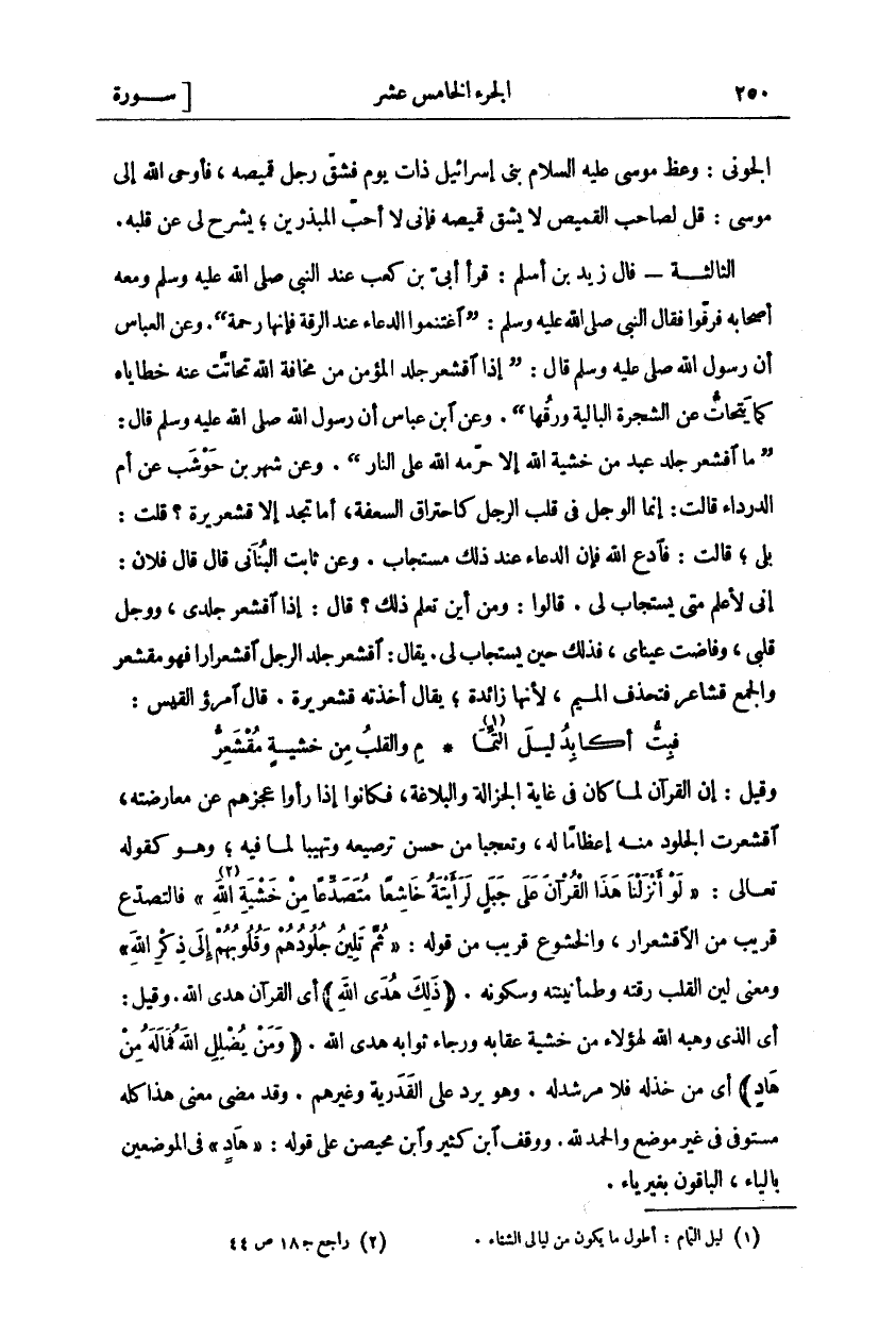 الْجَوْنِيُّ: وَعَظَ مُوسَى عَلَيْهِ السَّلَامُ بَنِي إِسْرَائِيلَ ذَاتَ يَوْمٍ فَشَقَّ رَجُلُ قَمِيصَهُ، فَأَوْحَى اللَّهُ إِلَى مُوسَى، قُلْ لِصَاحِبِ الْقَمِيصِ لَا يَشُقُّ قَمِيصَهُ فَإِنِّي لَا أُحِبُّ الْمُبَذِّرِينَ، يَشْرَحُ لِي عن قلبه. قال زيد بن أسلم: ذرأ أُبَيُّ بْنُ كَعْبٍ عِنْدَ النَّبِيِّ صَلَّى اللَّهُ عَلَيْهِ وَسَلَّمَ ومعه أصحابه فرقوا فقأ النَّبِيُّ صَلَّى اللَّهُ عَلَيْهِ وَسَلَّمَ:" اغْتَنِمُوا الدُّعَاءَ عِنْدَ الرِّقَّةِ فَإِنَّهَا رَحْمَةٌ". وَعَنِ الْعَبَّاسِ أَنَّ رسول الله صَلَّى اللَّهُ عَلَيْهِ وَسَلَّمَ قال:" إِذَا اقْشَعَرَّ جِلْدُ الْمُؤْمِنِ مِنْ مَخَافَةِ اللَّهِ تَحَاتَّتْ عَنْهُ خَطَايَاهُ كَمَا يَتَحَاتُّ عَنِ الشَّجَرَةِ الْبَالِيَةِ وَرَقُهَا". وَعَنِ ابْنِ عَبَّاسٍ أَنَّ رَسُولَ اللَّهِ صَلَّى اللَّهُ عَلَيْهِ وَسَلَّمَ قَالَ:" مَا اقْشَعَرَّ جِلْدُ عَبْدٍ مِنْ خَشْيَةِ اللَّهِ إِلَّا حَرَّمَهُ اللَّهُ عَلَى النَّارِ". وَعَنْ شَهْرِ بْنِ حوشب عن أم الدپرداء قَالَتْ: إِنَّمَا الْوَجَلُ فِي قَلْبِ الرَّجُلِ كَاحْتِرَاقِ السَّعَفَةِ، أَمَا تَجِدُ إِلَّا قُشَعْرِيرَةً؟ قُلْتُ: بَلَى، قَالَتْ: فَادْعُ اللَّهَ فَإِنَّ الدُّعَاءَ عِنْدَ ذَلِكَ مُسْتَجَابٌ. وَعَنْ ثَابِتٍ الْبُنَانِيِّ قَالَ: قَالَ فُلَانٌ: إِنِّي لَأَعْلَمُ مَتَى يُسْتَجَابُ لِي. قَالُوا: وَمِنْ أَيْنَ تَعْلَمُ ذَلِكَ؟ قَالَ: إِذَا اقْشَعَرَّ جِلْدِي، وَوَجِلَ قَلْبِي، وَفَاضَتْ عَيْنَايَ، فَذَلِكَ حِينَ يُسْتَجَابُ لِي. يُقَالُ: اقْشَعَرَّ جِلْدُ الرَّجُلِ اقْشِعْرَارًا فَهُوَ مُقْشَعِرٌّ وَالْجَمْعُ قَشَاعِرُ فَتُحْذَفُ الْمِيمُ، لِأَنَّهَا زَائِدَةٌ، يُقَالُ أَخَذَتْهُ قُشَعْرِيرَةٌ. قَالَ امْرُؤُ الْقَيْسِ: