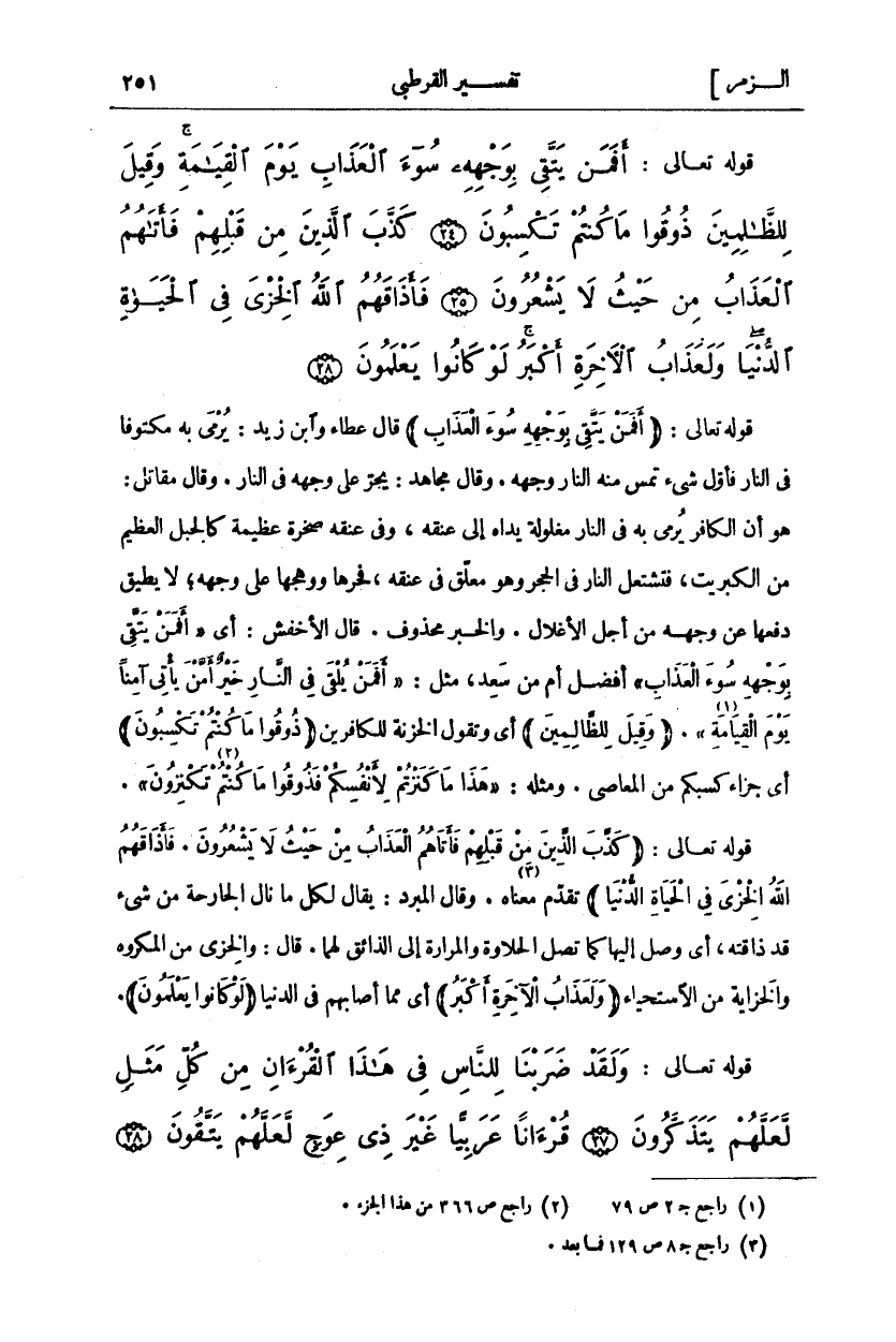 قَوْلُهُ تَعَالَى:" أَفَمَنْ يَتَّقِي بِوَجْهِهِ سُوءَ الْعَذابِ" قَالَ عَطَاءٌ وَابْنُ زَيْدٍ: يُرْمَى بِهِ مَكْتُوفًا في النار فأول شي تَمَسُّ مِنْهُ النَّارُ وَجْهَهُ. وَقَالَ مُجَاهِدٌ: يُجَرُّ عَلَى وَجْهِهِ فِي النَّارِ. وَقَالَ مُقَاتِلٌ: هُوَ أَنَّ الْكَافِرَ يُرْمَى بِهِ فِي النَّارِ مَغْلُولَةً يَدَاهُ إِلَى عُنُقِهِ، وَفِي عُنُقِهِ صَخْرَةٌ عَظِيمَةٌ كَالْجَبَلِ الْعَظِيمِ مِنَ الْكِبْرِيتِ، فَتَشْتَعِلُ النَّارُ فِي الْحَجَرِ وَهُوَ مُعَلَّقٌ فِي عُنُقِهِ، فَحَرُّهَا وَوَهَجُهَا عَلَى وَجْهِهِ، لَا يُطِيقُ دَفْعَهَا عَنْ وَجْهِهِ مِنْ أَجْلِ الْأَغْلَالِ. وَالْخَبَرُ مَحْذُوفٌ. قَالَ الْأَخْفَشُ: أَيْ" أَفَمَنْ يَتَّقِي بِوَجْهِهِ سُوءَ الْعَذابِ" أَفْضَلُ أَمْ مَنْ سُعِدَ، مِثْلَ:" أَفَمَنْ يُلْقى فِي النَّارِ خَيْرٌ أَمْ مَنْ يَأْتِي آمِناً يَوْمَ الْقِيامَةِ" [فصلت: ٤٠]." وَقِيلَ لِلظَّالِمِينَ" أَيْ وَتَقُولُ الْخَزَنَةُ لِلْكَافِرِينَ" ذُوقُوا مَا كُنْتُمْ تَكْسِبُونَ" أَيْ جَزَاءَ كَسْبِكُمْ مِنَ الْمَعَاصِي. وَمِثْلُهُ" هَذَا مَا كَنَزْتُمْ لِأَنْفُسِكُمْ فَذُوقُوا مَا كُنْتُمْ تَكْنِزُونَ" [التوبة: ٣٥]. قَوْلُهُ تَعَالَى:" كَذَّبَ الَّذِينَ مِنْ قَبْلِهِمْ فَأَتاهُمُ الْعَذابُ مِنْ حَيْثُ لَا يَشْعُرُونَ. فَأَذاقَهُمُ اللَّهُ الْخِزْيَ فِي الْحَياةِ الدُّنْيا" تَقَدَّمَ مَعْنَاهُ «١». وَقَالَ الْمُبَرِّدُ: يُقَالُ لِكُلِّ مَا نَالَ الْجَارِحَةَ مِنْ شي قَدْ ذَاقَتْهُ، أَيْ وَصَلَ إِلَيْهَا كَمَا تَصِلُ الْحَلَاوَةُ وَالْمَرَارَةُ إِلَى الذَّائِقِ لَهُمَا. قَالَ: وَالْخِزْيُ مِنَ الْمَكْرُوهِ وَالْخَزَايَةُ مِنَ الِاسْتِحْيَاءِ" وَلَعَذابُ الْآخِرَةِ أَكْبَرُ" أَيْ مِمَّا أَصَابَهُمْ فِي الدُّنْيَا" لَوْ كانُوا يَعْلَمُونَ".