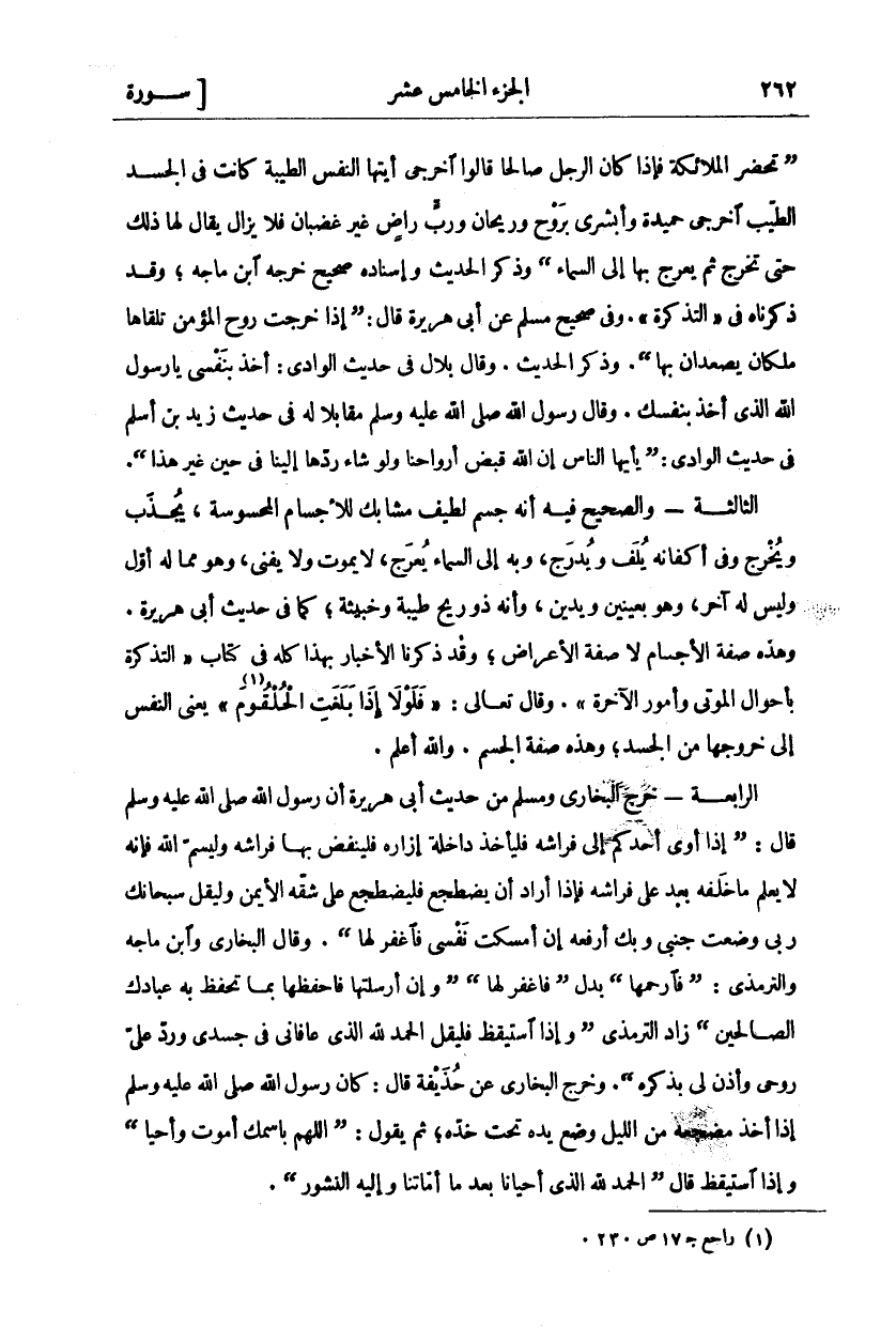 " تَحْضُرُ الْمَلَائِكَةُ فَإِذَا كَانَ الرَّجُلُ صَالِحًا قَالُوا اخْرُجِي أَيَّتُهَا النَّفْسُ الطَّيِّبَةُ كَانَتْ فِي الْجَسَدِ الطَّيِّبِ اخْرُجِي حَمِيدَةً وَأَبْشِرِي بِرَوْحٍ وَرَيْحَانٍ وَرَبٍّ رَاضٍ غَيْرِ غَضْبَانَ فَلَا يَزَالُ يُقَالُ لَهَا ذَلِكَ حَتَّى تَخْرُجَ ثُمَّ يُعْرَجُ بِهَا إِلَى السَّمَاءِ" وَذَكَرَ الْحَدِيثَ وَإِسْنَادُهُ صَحِيحٌ خَرَّجَهُ ابْنُ مَاجَهْ، وَقَدْ ذَكَرْنَاهُ فِي" التَّذْكِرَةِ." وَفِي صَحِيحِ، مُسْلِمٍ عَنْ أَبِي هُرَيْرَةَ قَالَ:" إِذَا خَرَجَتْ رُوحُ الْمُؤْمِنِ تَلَقَّاهَا" مَلَكَانِ يَصْعَدَانِ بِهَا." وَذَكَرَ الْحَدِيثَ. وَقَالَ بِلَالٌ فِي حَدِيثِ الْوَادِي: أَخَذَ بِنَفْسِي يَا رَسُولَ اللَّهِ الَّذِي أَخَذَ بِنَفْسِكَ. وَقَالَ رَسُولُ اللَّهِ صَلَّى اللَّهُ عَلَيْهِ وَسَلَّمَ مُقَابِلًا لَهُ فِي حَدِيثِ زَيْدِ بْنِ أَسْلَمَ فِي حَدِيثِ الْوَادِي:" يَا أَيُّهَا النَّاسُ إِنَّ اللَّهَ قَبَضَ أَرْوَاحَنَا وَلَوْ شَاءَ رَدَّهَا إِلَيْنَا فِي حِينٍ غَيْرِ هَذَا." الثَّالِثَةُ- وَالصَّحِيحُ فِيهِ أَنَّهُ جِسْمٌ لَطِيفٌ مُشَابِكٌ لِلْأَجْسَامِ الْمَحْسُوسَةِ، يُجْذَبُ وَيُخْرَجُ وَفِي أَكْفَانِهِ يُلَفُّ وَيُدْرَجُ، وَبِهِ إِلَى السَّمَاءِ يُعْرَجُ، لَا يَمُوتُ وَلَا يَفْنَى، وَهُوَ مِمَّا لَهُ أَوَّلُ وَلَيْسَ لَهُ آخِرُ، وَهُوَ بِعَيْنَيْنِ وَيَدَيْنِ، وَأَنَّهُ ذُو رِيحٍ طَيِّبَةٍ وَخَبِيثَةٍ، كَمَا فِي حَدِيثِ أَبِي هُرَيْرَةَ. وَهَذِهِ صِفَةُ الْأَجْسَامِ لَا صِفَةُ الْأَعْرَاضِ، وَقَدْ ذَكَرْنَا الْأَخْبَارَ بِهَذَا كُلِّهِ فِي كِتَابِ" التَّذْكِرَةِ بِأَحْوَالِ الْمَوْتَى وَأُمُورِ الْآخِرَةِ." وقال تعالى:" فَلَوْلا إِذا بَلَغَتِ الْحُلْقُومَ" [الواقعة: ٨٣] يَعْنِي النَّفْسَ إِلَى خُرُوجِهَا مِنَ الْجَسَدِ، وَهَذِهِ صِفَةُ الْجِسْمِ. وَاللَّهُ أَعْلَمُ. الرَّابِعَةُ- خَرَّجَ الْبُخَارِيُّ وَمُسْلِمٌ مِنْ حَدِيثِ أَبِي هُرَيْرَةَ أَنَّ رَسُولَ اللَّهِ صَلَّى اللَّهُ عَلَيْهِ وَسَلَّمَ قَالَ:" إِذَا أَوَى أَحَدُكُمْ إِلَى فِرَاشِهِ فَلْيَأْخُذْ دَاخِلَةَ إِزَارِهِ فَلْيَنْفُضْ بِهَا فِرَاشَهُ وَلِيُسَمِّ اللَّهَ فَإِنَّهُ لَا يعلم ما خلفه بعد عَلَى فِرَاشِهِ فَإِذَا أَرَادَ أَنْ يَضْطَجِعَ فَلْيَضْطَجِعْ عَلَى شِقِّهِ الْأَيْمَنِ وَلْيَقُلْ سُبْحَانَكَ رَبِّي وَضَعْتُ جَنْبِي وَبِكَ أَرْفَعُهُ إِنْ أَمْسَكْتَ نَفْسِي فَاغْفِرْ لَهَا." وَقَالَ الْبُخَارِيُّ وَابْنُ مَاجَهْ وَالتِّرْمِذِيُّ:" فَارْحَمْهَا" بَدَلَ" فَاغْفِرْ لَهَا" وَإِنْ أَرْسَلْتَهَا فَاحْفَظْهَا بِمَا تَحْفَظُ بِهِ عِبَادَكَ الصَّالِحِينَ" زَادَ التِّرْمِذِيُّ" وَإِذَا اسْتَيْقَظَ فَلْيَقُلِ الْحَمْدُ لِلَّهِ الَّذِي عَافَانِي فِي جَسَدِي وَرَدَّ عَلَيَّ رُوحِي وَأَذِنَ لِي بِذِكْرِهِ." وَخَرَّجَ الْبُخَارِيُّ عَنْ حُذَيْفَةَ قَالَ: كَانَ رَسُولُ اللَّهِ صَلَّى اللَّهُ عَلَيْهِ وَسَلَّمَ إِذَا أَخَذَ مَضْجَعَهُ مِنَ اللَّيْلِ وَضَعَ يَدَهُ تَحْتَ خَدِّهِ، ثُمَّ يَقُولُ:" اللَّهُمَّ بِاسْمِكَ أَمُوتُ وَأَحْيَا" وَإِذَا اسْتَيْقَظَ قَالَ:" الْحَمْدُ لِلَّهِ الَّذِي أَحْيَانَا بَعْدَ مَا أَمَاتَنَا وَإِلَيْهِ النُّشُورُ."