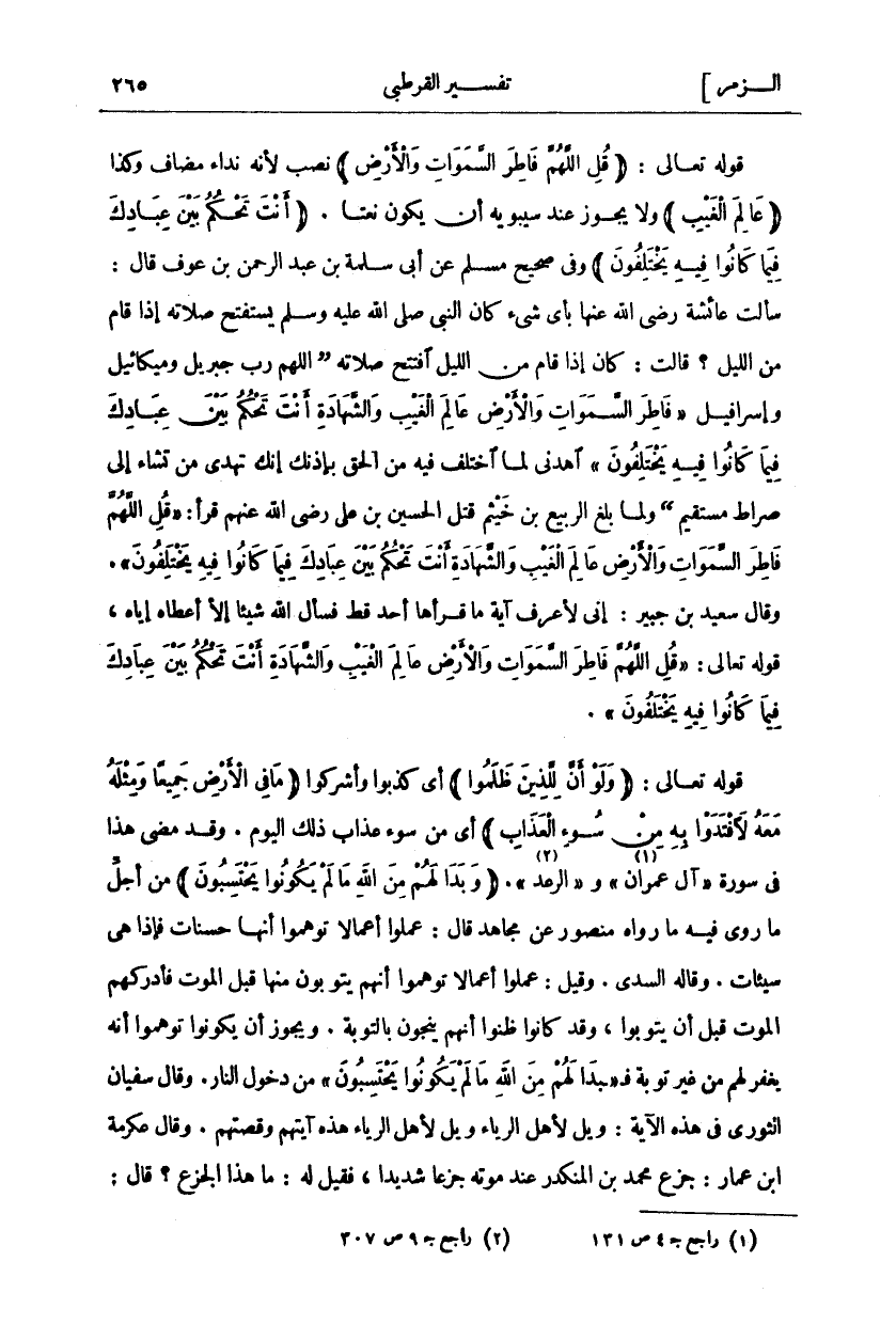 قَوْلُهُ تَعَالَى:" قُلِ اللَّهُمَّ فاطِرَ السَّماواتِ وَالْأَرْضِ" نَصْبٌ لِأَنَّهُ نِدَاءٌ مُضَافٌ وَكَذَا" عالِمَ الْغَيْبِ" وَلَا يَجُوزُ عِنْدَ سِيبَوَيْهِ أَنْ يَكُونَ نَعْتًا." أَنْتَ تَحْكُمُ بَيْنَ عِبادِكَ فِي مَا كانُوا فِيهِ يَخْتَلِفُونَ" وَفِي صَحِيحِ مُسْلِمٍ عَنْ أَبِي سَلَمَةَ بْنِ عَبْدِ الرَّحْمَنِ بْنِ عَوْفٍ قَالَ: سألت عائشة رضي الله عنها بأي شي كَانَ النَّبِيُّ صَلَّى اللَّهُ عَلَيْهِ وَسَلَّمَ يَسْتَفْتِحُ صَلَاتَهُ إِذَا قَامَ مِنَ اللَّيْلِ؟ قَالَتْ: كَانَ إِذَا قَامَ مِنَ اللَّيْلِ افْتَتَحَ صَلَاتَهُ" اللَّهُمَّ رب جبريل وميكائيل" وإسرافيل" فاطر السموات وَالْأَرْضِ عَالِمَ الْغَيْبِ وَالشَّهَادَةِ أَنْتَ تَحْكُمُ بَيْنَ عبادك فيما كَانُوا فِيهِ يَخْتَلِفُونَ" اهْدِنِي لِمَا اخْتُلِفَ فِيهِ مِنَ الْحَقِّ بِإِذْنِكَ إِنَّكَ تَهْدِي مَنْ تَشَاءُ إِلَى صِرَاطٍ مُسْتَقِيمٍ" وَلَمَّا بَلَغَ الرَّبِيعَ بْنَ خَيْثَمٍ قَتْلُ الْحُسَيْنِ بْنِ عَلِيٍّ رَضِيَ اللَّهُ عَنْهُمْ قَرَأَ" قُلِ اللَّهُمَّ فَاطِرَ السَّمَاوَاتِ وَالْأَرْضِ عَالِمَ الْغَيْبِ وَالشَّهَادَةِ أَنْتَ تَحْكُمُ بَيْنَ عِبَادِكَ فيما كَانُوا فِيهِ يَخْتَلِفُونَ". وَقَالَ سَعِيدُ بْنُ جُبَيْرٍ: إِنِّي لَأَعْرِفُ آيَةً مَا قَرَأَهَا أَحَدٌ قَطُّ فَسَأَلَ اللَّهُ شَيْئًا إِلَّا أَعْطَاهُ إِيَّاهُ، قَوْلُهُ تَعَالَى:" قُلِ اللَّهُمَّ فاطِرَ السَّماواتِ وَالْأَرْضِ عالِمَ الْغَيْبِ وَالشَّهادَةِ أَنْتَ تَحْكُمُ بَيْنَ عِبادِكَ فِي مَا كانُوا فِيهِ يَخْتَلِفُونَ". قَوْلُهُ تَعَالَى:" وَلَوْ أَنَّ لِلَّذِينَ ظَلَمُوا" أَيْ كَذَّبُوا وَأَشْرَكُوا" مَا فِي الْأَرْضِ جَمِيعاً وَمِثْلَهُ مَعَهُ لَافْتَدَوْا بِهِ مِنْ سُوءِ الْعَذابِ" أَيْ مِنْ سُوءِ عَذَابِ ذَلِكَ الْيَوْمِ. وَقَدْ مَضَى هَذَا فِي سُورَةِ" آلِ عِمْرَانَ" «١» وَ" الرَّعْدِ" «٢»." وَبَدا لَهُمْ مِنَ اللَّهِ مَا لَمْ يَكُونُوا يَحْتَسِبُونَ" مِنْ أَجَلِّ مَا رُوِيَ فِيهِ مَا رَوَاهُ مَنْصُورٌ عَنْ مُجَاهِدٍ قَالَ: عَمِلُوا أَعْمَالًا تَوَهَّمُوا أَنَّهَا حَسَنَاتٌ فَإِذَا هِيَ سَيِّئَاتٌ. وَقَالَهُ السُّدِّيُّ. وَقِيلَ: عَمِلُوا أَعْمَالًا تَوَهَّمُوا أَنَّهُمْ يَتُوبُونَ مِنْهَا قَبْلَ الْمَوْتِ فَأَدْرَكَهُمُ الْمَوْتُ قَبْلَ أَنْ يَتُوبُوا، وَقَدْ كَانُوا ظَنُّوا أَنَّهُمْ يَنْجُونَ بِالتَّوْبَةِ. وَيَجُوزُ أَنْ يَكُونُوا تَوَهَّمُوا أَنَّهُ يَغْفِرُ لَهُمْ مِنْ غَيْرِ تَوْبَةٍ فَ" بَدَا لَهُمْ مِنَ اللَّهِ مَا لَمْ يَكُونُوا يَحْتَسِبُونَ" مِنْ دُخُولِ النَّارِ. وَقَالَ سُفْيَانُ الثَّوْرِيُّ فِي هَذِهِ الْآيَةِ: وَيْلٌ لِأَهْلِ الرِّيَاءِ وَيْلٌ لِأَهْلِ الرِّيَاءِ هَذِهِ آيَتُهُمْ وَقِصَّتُهُمْ. وَقَالَ عكرمة ابن عَمَّارٍ: جَزِعَ مُحَمَّدُ بْنُ الْمُنْكَدِرِ عِنْدَ مَوْتِهِ جزعا شديد، فقيل له: ما هذا الجزع؟ قال: