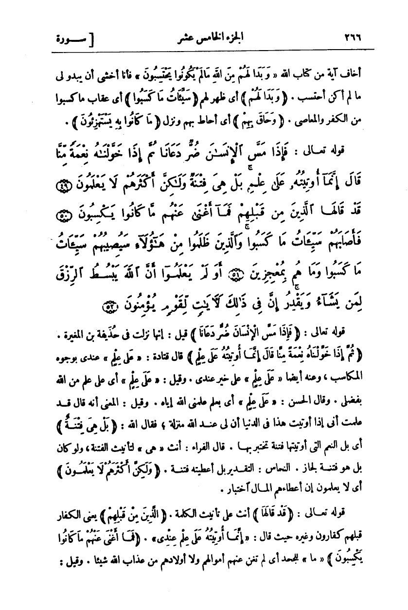 قَوْلُهُ تَعَالَى:" فَإِذا مَسَّ الْإِنْسانَ ضُرٌّ دَعانا" قِيلَ: إِنَّهَا نَزَلَتْ فِي حُذَيْفَةَ بْنِ الْمُغِيرَةِ." ثُمَّ إِذا خَوَّلْناهُ نِعْمَةً مِنَّا قالَ إِنَّما أُوتِيتُهُ عَلى عِلْمٍ" قَالَ قَتَادَةُ:" عَلى عِلْمٍ" عِنْدِي بِوُجُوهِ الْمَكَاسِبِ، وَعَنْهُ أَيْضًا" عَلى عِلْمٍ" على خير عندي قيل:" عَلى عِلْمٍ" أَيْ عَلَى عِلْمٍ مِنَ اللَّهِ بِفَضْلِي. وَقَالَ الْحَسَنُ:" عَلى عِلْمٍ" أَيْ بِعِلْمٍ عَلَّمَنِي اللَّهُ إِيَّاهُ. وَقِيلَ: الْمَعْنَى أَنَّهُ قَالَ قَدْ عَلِمْتُ أَنِّي إِذَا أُوتِيتُ هَذَا فِي الدُّنْيَا أَنَّ لِي عِنْدَ اللَّهِ مَنْزِلَةً،" فَقَالَ اللَّهُ:" بَلْ هِيَ فِتْنَةٌ" أَيْ بَلِ النِّعَمُ الَّتِي أُوتِيتَهَا فِتْنَةٌ تُخْتَبَرُ بِهَا. قَالَ الْفَرَّاءُ: أَنَّثَ" هِيَ" لِتَأْنِيثِ الْفِتْنَةِ، وَلَوْ كَانَ بَلْ هُوَ فِتْنَةٌ لَجَازَ. النَّحَّاسُ: التَّقْدِيرُ بَلْ أَعْطَيْتُهُ فِتْنَةً." وَلكِنَّ أَكْثَرَهُمْ لَا يَعْلَمُونَ" أَيْ لَا يَعْلَمُونَ أَنَّ إِعْطَاءَهُمُ الْمَالَ اخْتِبَارٌ. قَوْلُهُ تَعَالَى:" قَدْ قالَهَا" أُنِّثَ عَلَى تَأْنِيثِ الْكَلِمَةِ." الَّذِينَ مِنْ قَبْلِهِمْ" يَعْنِي الْكُفَّارَ قَبْلَهُمْ كَقَارُونَ وَغَيْرِهِ حَيْثُ قَالَ:" إِنَّما أُوتِيتُهُ عَلى عِلْمٍ عِنْدِي"." فَما أَغْنى عَنْهُمْ مَا كانُوا يَكْسِبُونَ"" مَا" لِلْجَحْدِ أَيْ لَمْ تُغْنِ عَنْهُمْ أَمْوَالَهُمْ وَلَا أَوْلَادَهُمْ مِنْ عَذَابِ اللَّهِ شَيْئًا. وَقِيلَ: