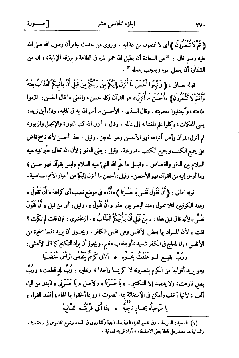 (ثُمَّ لَا تُنْصَرُونَ) أَيْ لَا تُمْنَعُونَ مِنْ عَذَابِهِ، وَرُوِيَ مِنْ حَدِيثِ جَابِرٍ أَنَّ رَسُولَ اللَّهِ صَلَّى اللَّهُ عَلَيْهِ وَسَلَّمَ قال:" من السَّعَادَةِ أَنْ يُطِيلَ اللَّهُ عُمُرَ الْمَرْءِ فِي الطَّاعَةِ وَيَرْزُقَهُ الْإِنَابَةَ وَإِنَّ مِنَ الشَّقَاوَةِ أَنْ يَعْمَلَ الْمَرْءُ وَيُعْجَبُ بِعَمَلِهِ". قَوْلُهُ تَعَالَى: (وَاتَّبِعُوا أَحْسَنَ مَا أُنْزِلَ إِلَيْكُمْ مِنْ رَبِّكُمْ مِنْ قَبْلِ أَنْ يَأْتِيَكُمُ الْعَذابُ بَغْتَةً وَأَنْتُمْ لَا تَشْعُرُونَ) " أَحْسَنَ مَا أُنْزِلَ" هُوَ الْقُرْآنُ وَكُلُّهُ حَسَنٌ، وَالْمَعْنَى مَا قَالَ الْحَسَنُ: الْتَزِمُوا طَاعَتَهُ، وَاجْتَنِبُوا مَعْصِيَتَهُ، وَقَالَ السُّدِّيُّ: الْأَحْسَنُ مَا أَمَرَ اللَّهُ بِهِ فِي كِتَابِهِ، وَقَالَ ابْنُ زَيْدٍ: يعنى المحكمات، وكلوا علم المتشابه إلى عالمه، وقال: أنزل الله كتبا التَّوْرَاةِ وَالْإِنْجِيلِ وَالزَّبُورِ، ثُمَّ أَنْزَلَ الْقُرْآنَ وَأَمَرَ بِاتِّبَاعِهِ فَهُوَ الْأَحْسَنُ وَهُوَ الْمُعْجِزُ، وَقِيلَ: هَذَا أَحْسَنُ لِأَنَّهُ نَاسِخٌ قَاضٍ عَلَى جَمِيعِ الْكُتُبِ وَجَمِيعُ الْكُتُبِ مَنْسُوخَةٌ- وَقِيلَ: يَعْنِي الْعَفْوَ، لِأَنَّ اللَّهَ تَعَالَى خَيَّرَ نَبِيَّهُ عَلَيْهِ السَّلَامُ بَيْنَ الْعَفْوِ وَالْقِصَاصِ، وَقِيلَ مَا عَلَّمَ اللَّهُ النَّبِيَّ عَلَيْهِ السَّلَامُ وَلَيْسَ بِقُرْآنٍ فَهُوَ حَسَنٌ، وَمَا أَوْحَى إِلَيْهِ مِنَ الْقُرْآنِ فَهُوَ الْأَحْسَنُ، وَقِيلَ: أَحْسَنَ مَا أُنْزِلَ إِلَيْكُمْ مِنْ أَخْبَارِ الْأُمَمِ الماضية. قوله تعالى: (أَنْ تَقُولَ نَفْسٌ يا حَسْرَتى) " أَنْ" فِي مَوْضِعِ نَصْبٍ أَيْ كَرَاهَةَ" أَنْ تَقُولَ" وَعِنْدَ الْكُوفِيِّينَ لِئَلَّا تَقُولُ وَعِنْدَ الْبَصْرِيِّينَ حَذَرَ" أَنْ تَقُولَ". وَقِيلَ: أَيْ مِنْ قَبْلِ" أن تقول نفس" لأنه قال قبل هَذَا:" مِنْ قَبْلِ أَنْ يَأْتِيَكُمُ الْعَذابُ". الزَّمَخْشَرِيُّ: فَإِنْ قُلْتَ لِمَ نُكِّرَتْ؟ قُلْتُ، لِأَنَّ الْمُرَادَ بِهَا بَعْضُ الْأَنْفُسِ وَهِيَ نَفْسُ الْكَافِرِ، وَيَجُوزُ أَنْ يُرِيدَ نَفْسًا مُتَمَيِّزَةً مِنَ الْأَنْفُسِ، إِمَّا بِلَجَاجٍ فِي الْكُفْرِ شَدِيدٍ، أَوْ بِعِقَابٍ عَظِيمٍ. وَيَجُوزُ أَنْ يُرَادَ التَّكْثِيرُ كَمَا قَالَ الْأَعْشَى: